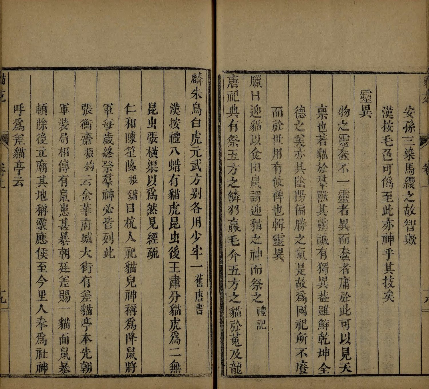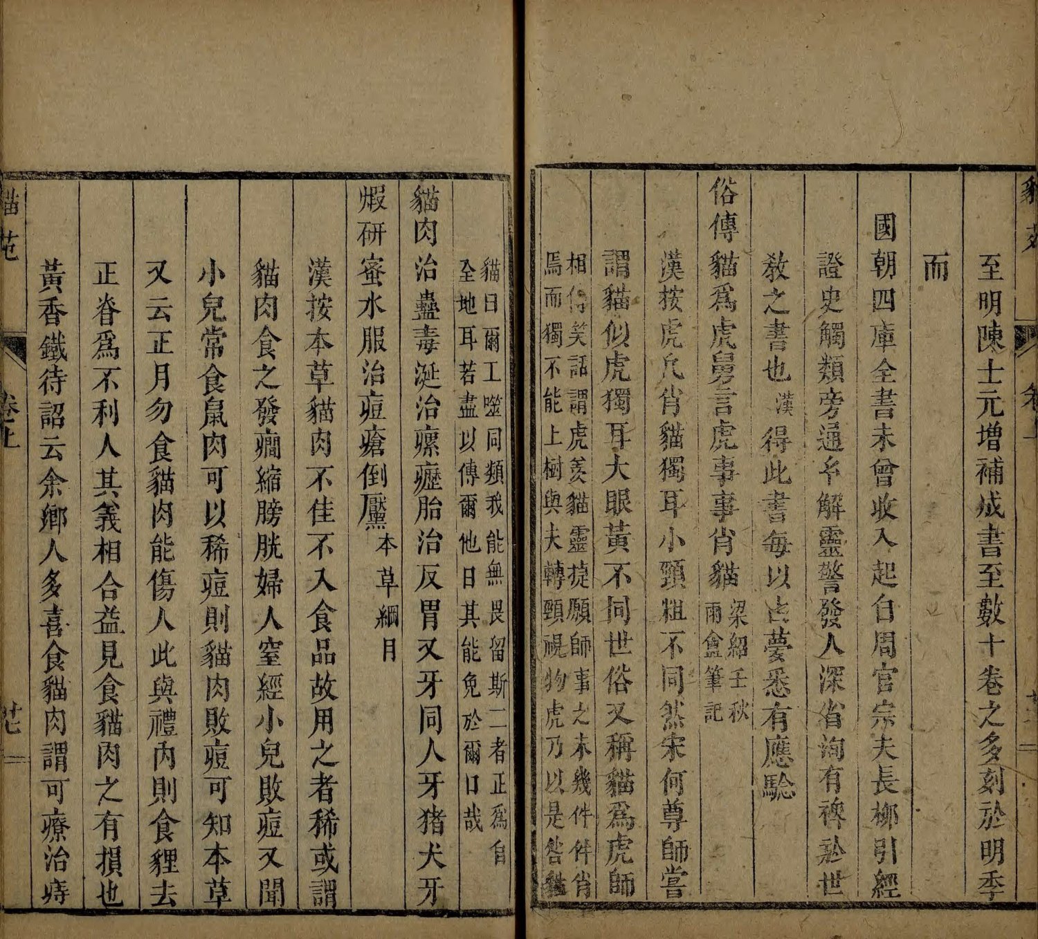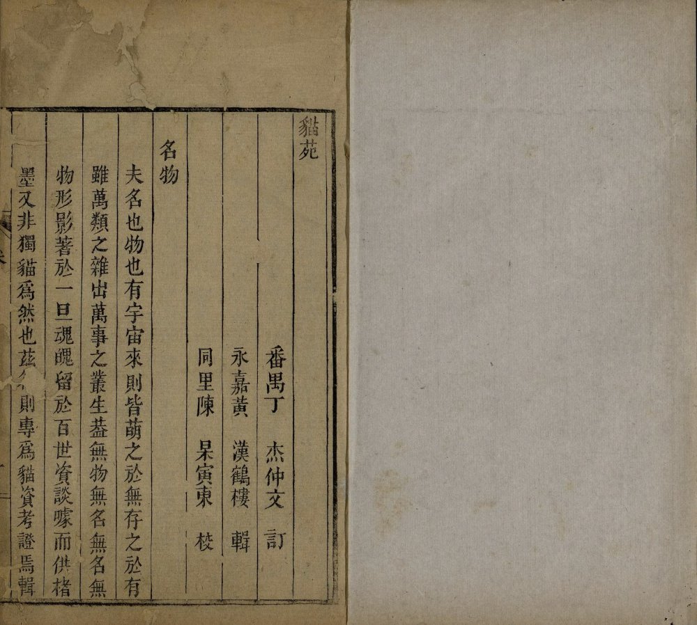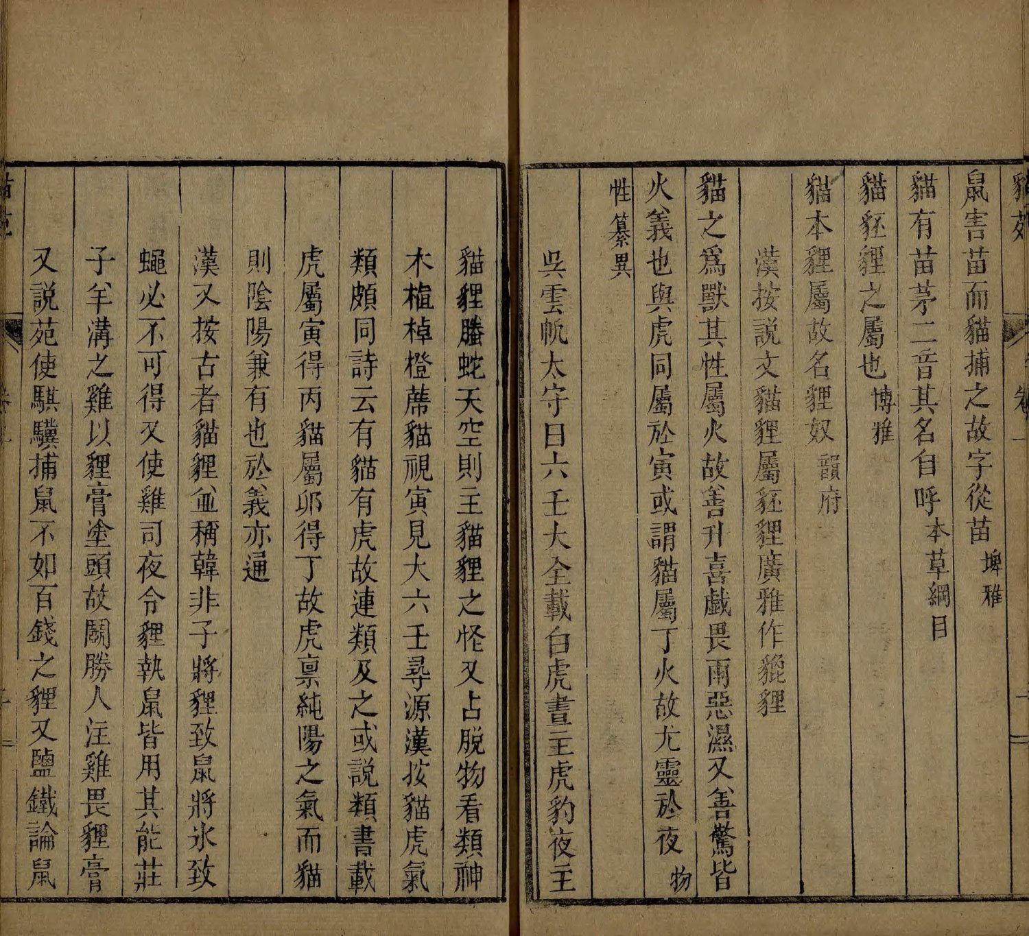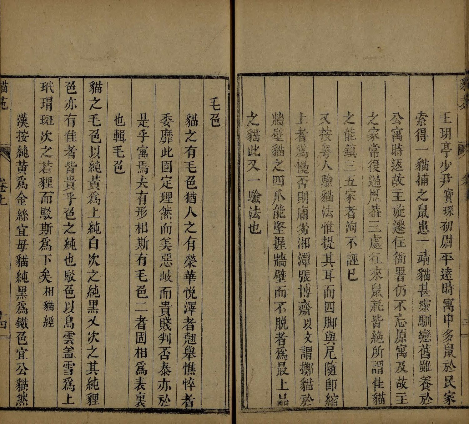 此《猫苑》为清代黄汉撰著。全书上下两卷,内容分为种类、形象、毛色、灵异、名物、故事、品藻七门,并附有补遗。作者广为搜求史籍与见闻,汇集历代关于猫的典故、饲养习俗与诗词逸事,书中多附其按语。此为清咸丰时期(瓮雪草堂藏板)刊本。