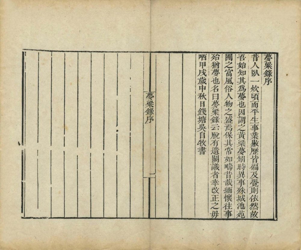 《梦粱 [1](粱 不是 梁 ) 录》书名取自 “黄粱一梦” 的典故,蕴含着深刻的亡国之痛与人生如寄的感叹。关于此书的成书年代,据自序有 “时异事殊”,“缅怀往事,殆犹梦也” 之语,应在元军攻陷临安之后。所署 “甲戌岁中秋日”,甲戌即宋度宗咸淳十年(1274),疑传抄有误。