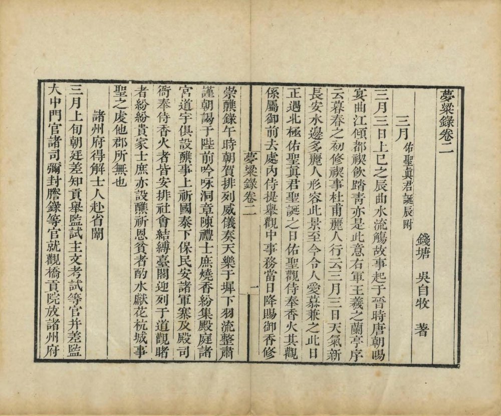 卷二:三月、諸州府得解士人赴省闈、蔭補未仕官人赴銓、清明節、諸庫迎煮、州府節制諸軍春敎、二十八日東嶽聖帝誕辰、暮春
