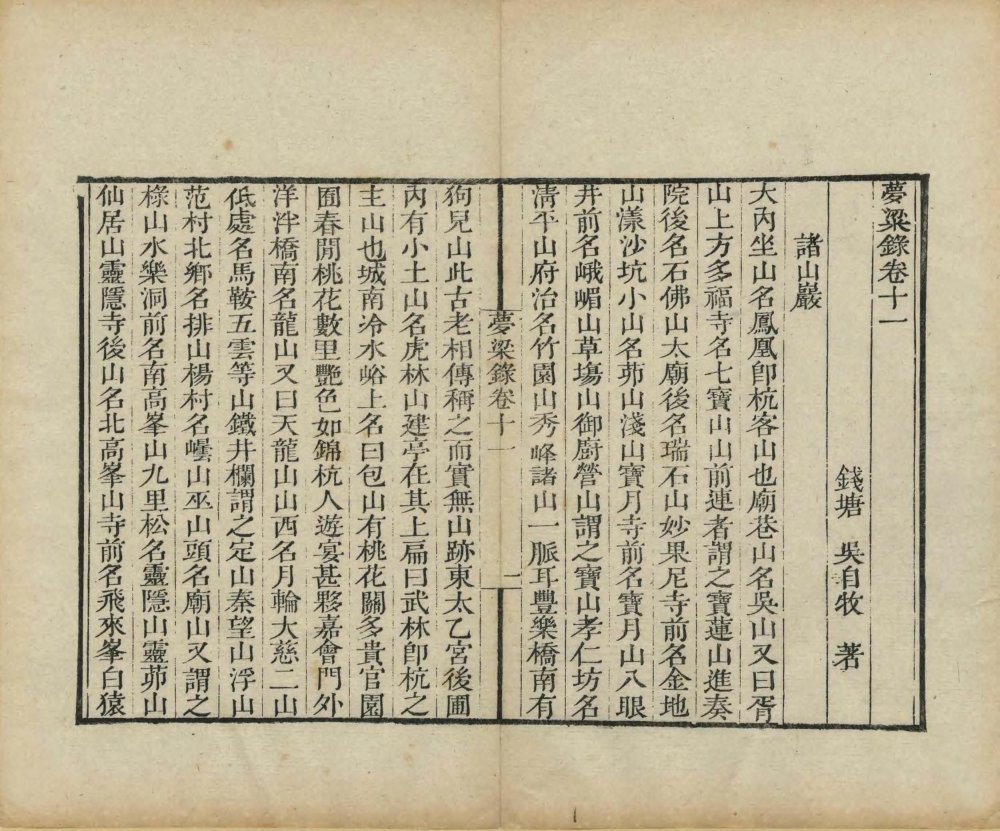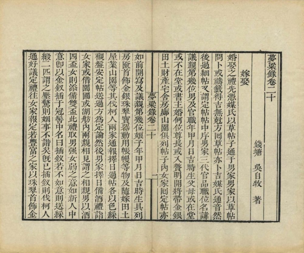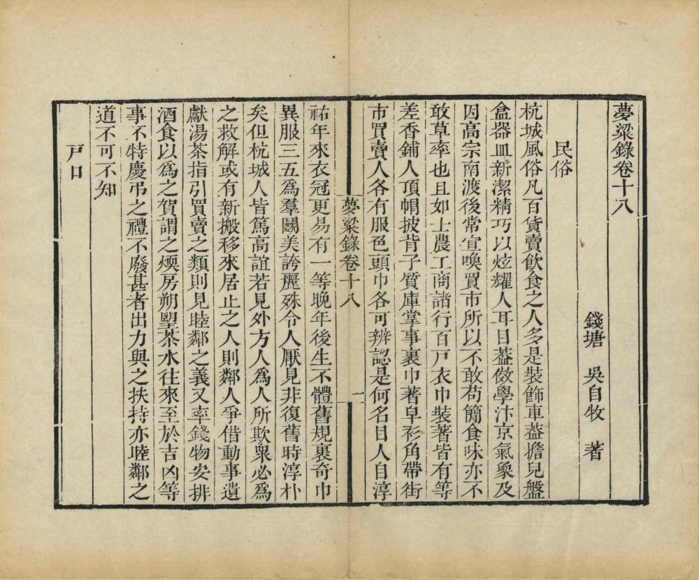 此《梦粱录》由南宋吴自牧撰。全书共二十卷,其仿效《东京梦华录》体例,详细记载了南宋都城临安(即今杭州)的地理与建筑、岁时与祭祀、社会管理与经济、民生与娱乐等内容。该书是了解南宋城市面貌、手工业活动、商业发展等情况,提供了较丰富的史料。此为清末刊本。