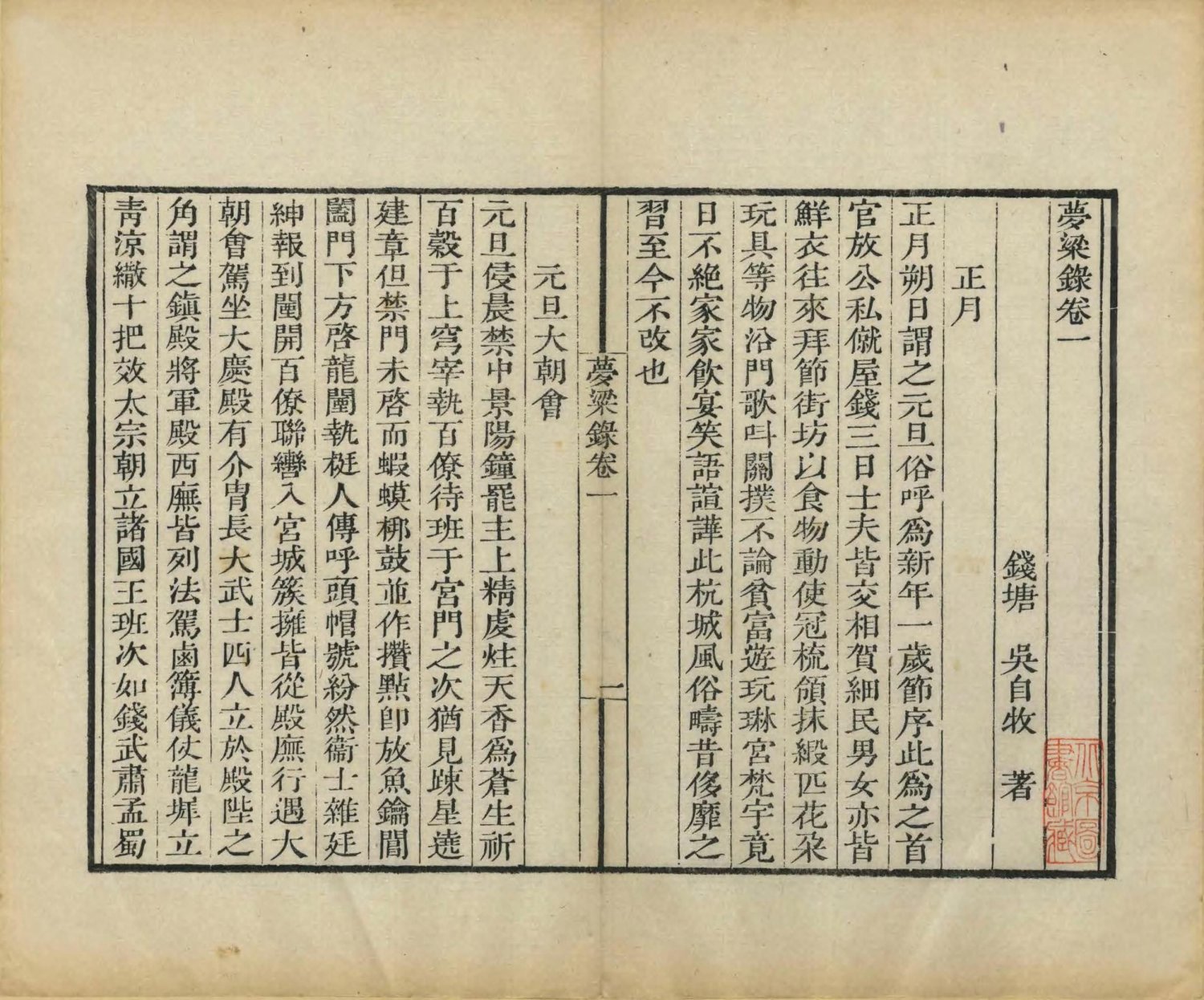 卷一:正月、元旦大朝會、立春、元宵、車駕詣景靈宮孟饗、二月、八日祠山聖誕、二月望
