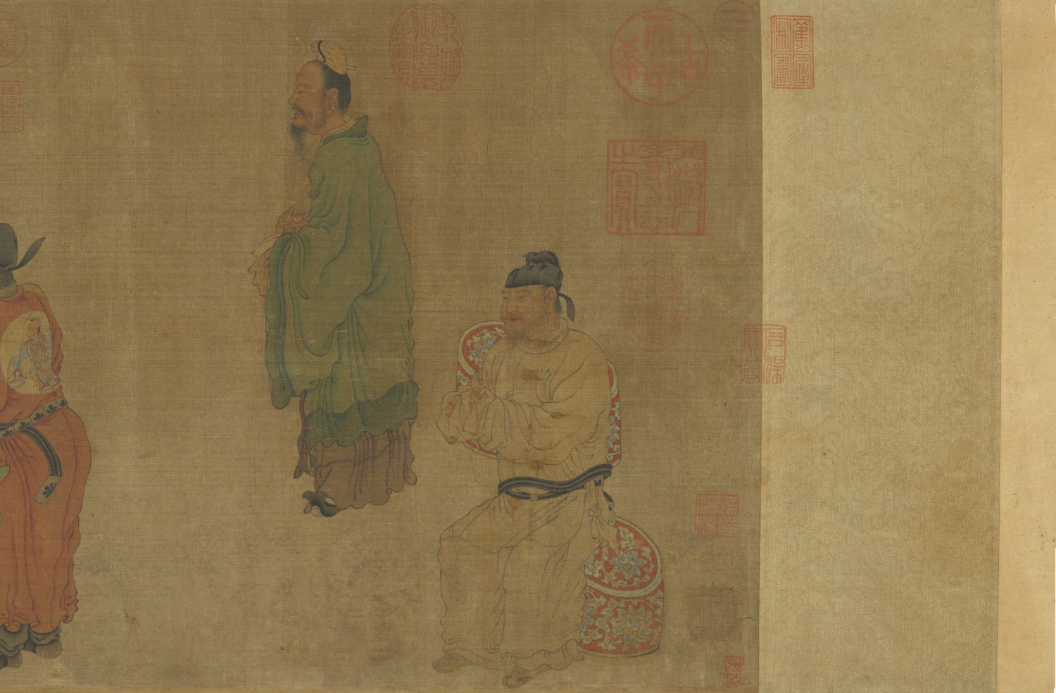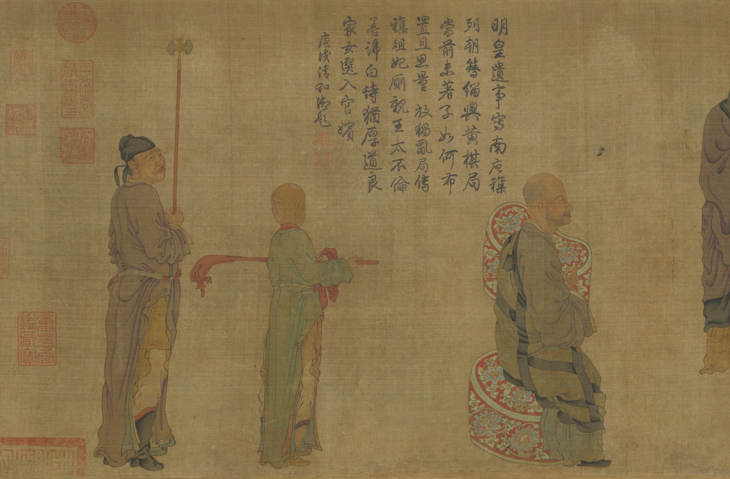 唐玄宗李隆基,谥号为 “至道大圣大明孝皇帝” 。宋代为避圣祖赵玄朗之讳(“玄”),清代为避康熙帝玄烨之讳,故后世又称之为 “唐明皇” 。本幅唐明皇坐于龙椅前置棋盘,周围有官员、和尚、道士、优伶及侍从内官观棋或侍奉。据《石渠宝笈续编》记载 [1] 设色画明皇前置棋局。侍坐一人。僧二人。道二人。优一人。内官一人。御题行书 及学者研究,画中八人身份可辨,右一为宁王李宪,右二、右五为道士,右三为优人黄幡绰,右四为唐明皇,右六为高僧辨正,右七为手持马球杆的吐蕃侍者,右八为宦官 [2] 图像与历史研究 | 周文矩《明皇会棋图》寓意探究 凤凰网 。清乾隆跋诗评,明皇纵容杨贵妃,任其由宠犬搅乱棋局,是日后政局紊乱祸因。