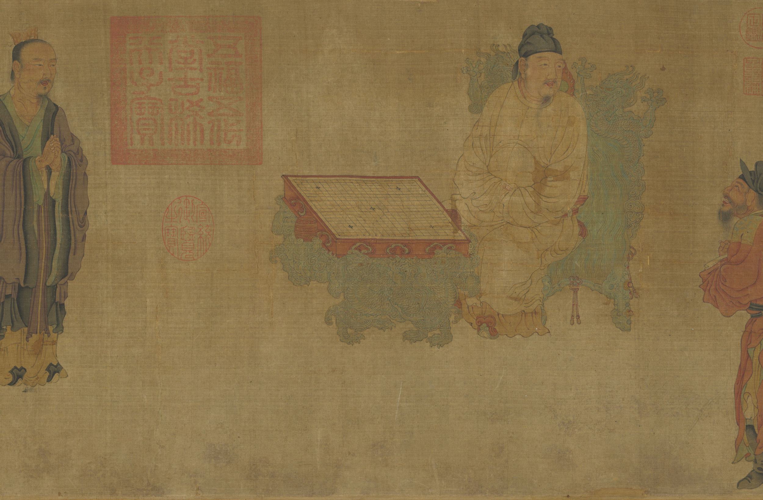 此《明皇会棋图》卷传为五代南唐周文矩画。旧传描绘唐代宫廷的围棋活动,唐明皇(玄宗)坐龙椅,前置棋盘,其上空无一子,而优伶拱手而立,好像有话要说,大概是描写优人向皇帝进谏的故事。全卷设色淡雅,衣纹线条细腻,人物表情生动。此卷现藏于台北故宫博物院。