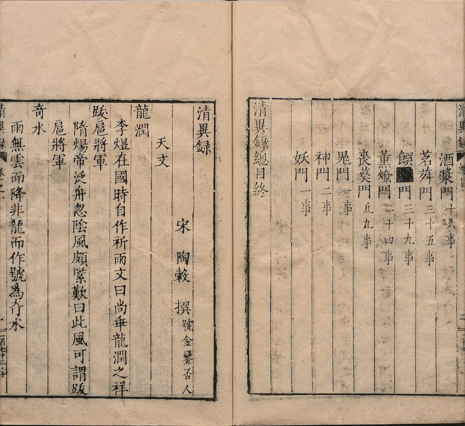 此《清异录》由北宋陶谷撰。全书共分两卷,其内容书采隋唐、五代及宋初史料典故、小说轶事,包含:天文、地理、君道、人事、释族、仙宗、草木、花果、蔬药、禽兽、居室、衣服、粧饰、陈设、武器、馔羞、鬼神妖等三十七门。门下又列事目,六百余条。此为明隆庆六年叶氏菉竹堂刊本。