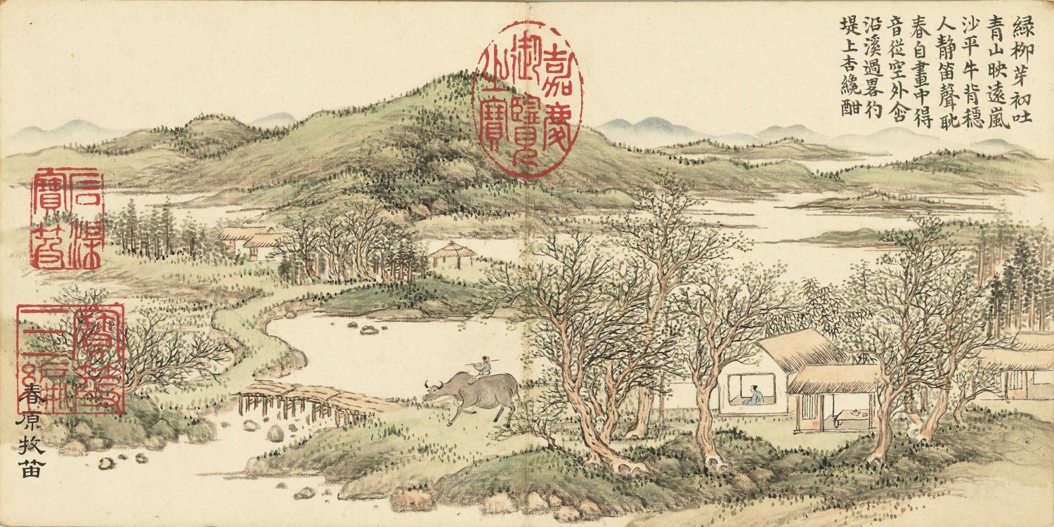 綠柳芽初吐。青山映遠嵐。沙平牛背穩。人靜笛聲耽。春自畫中得。音從空外含。沿溪過略彴。堤上杏纔酣。