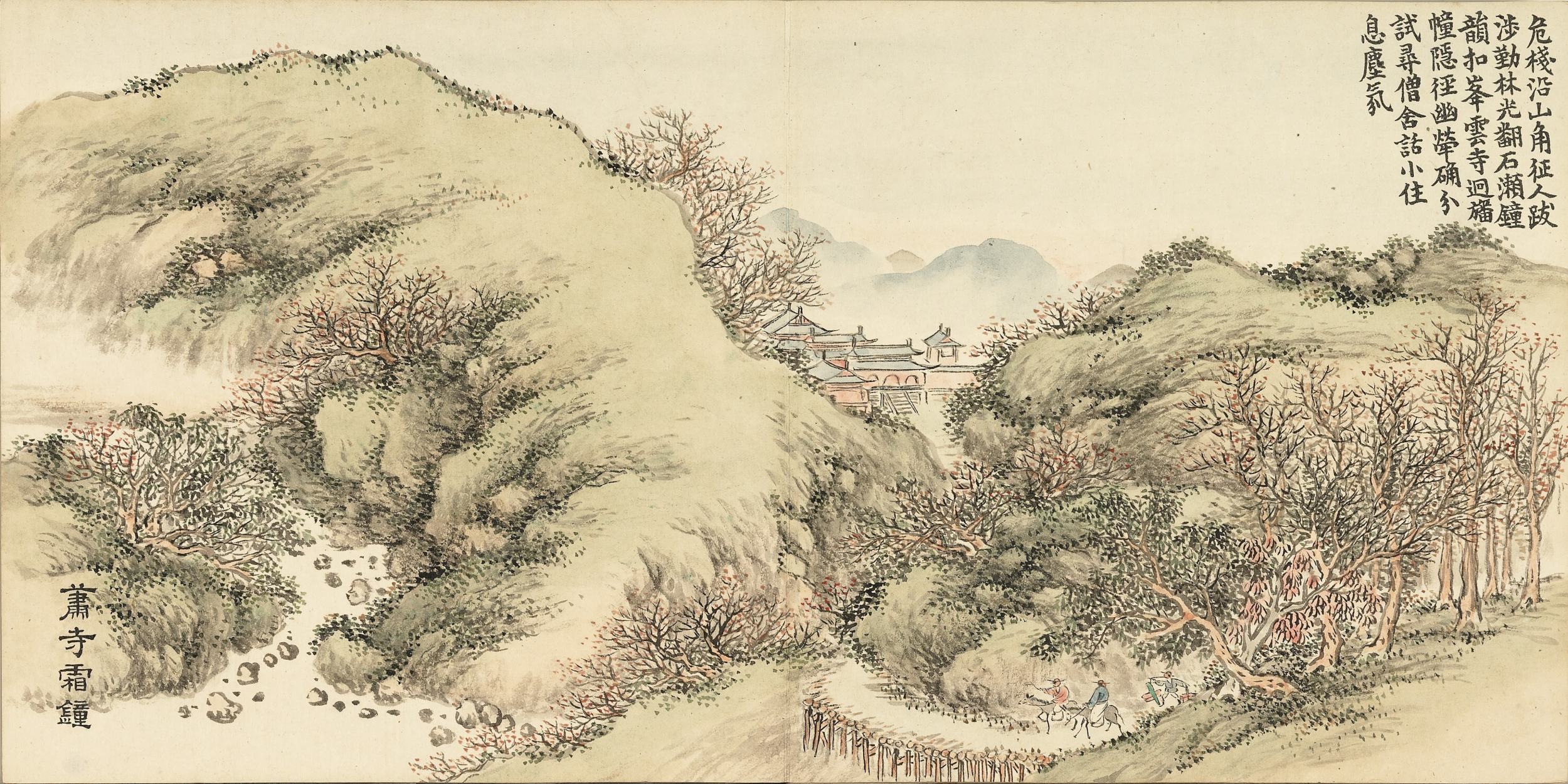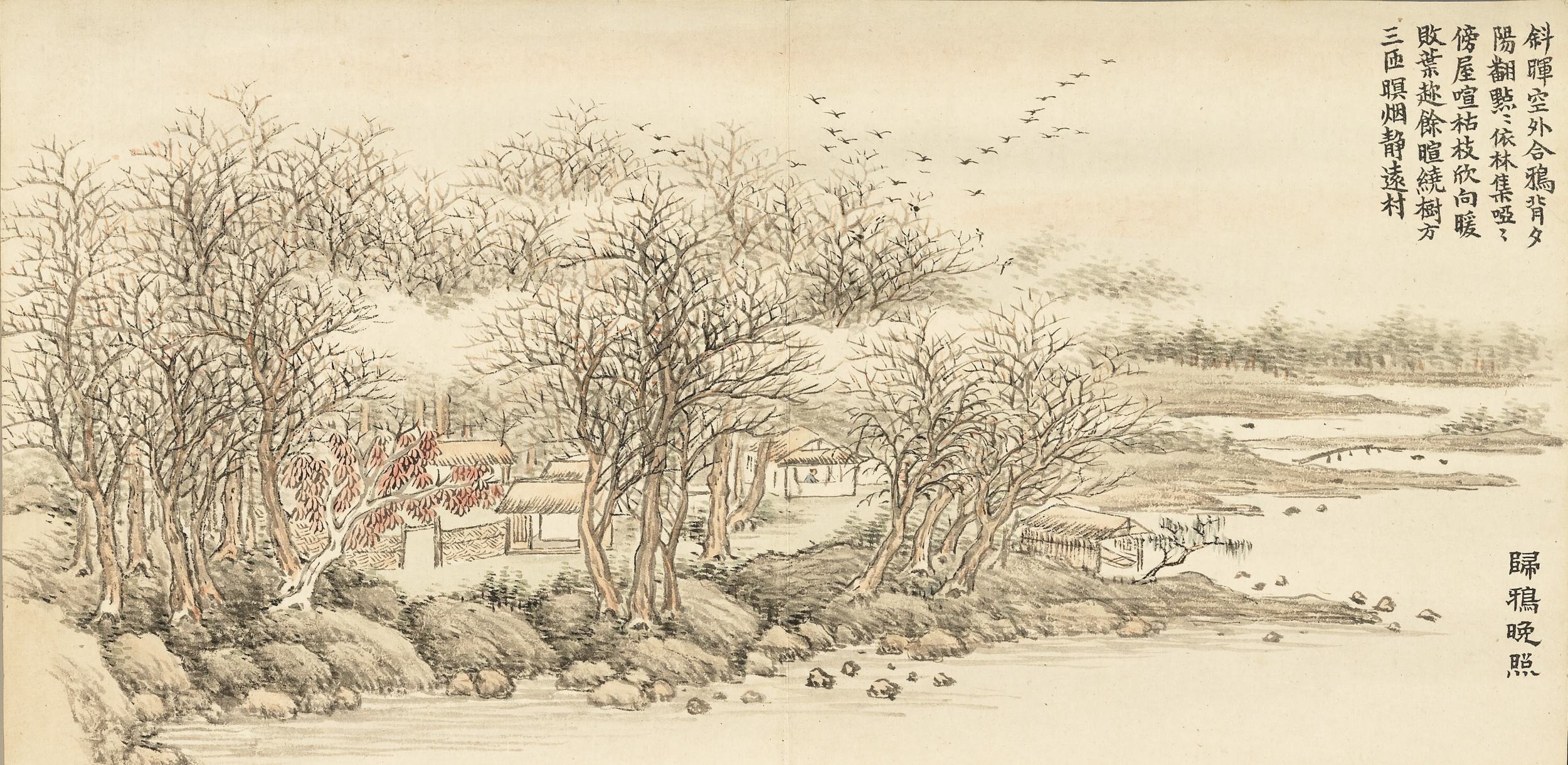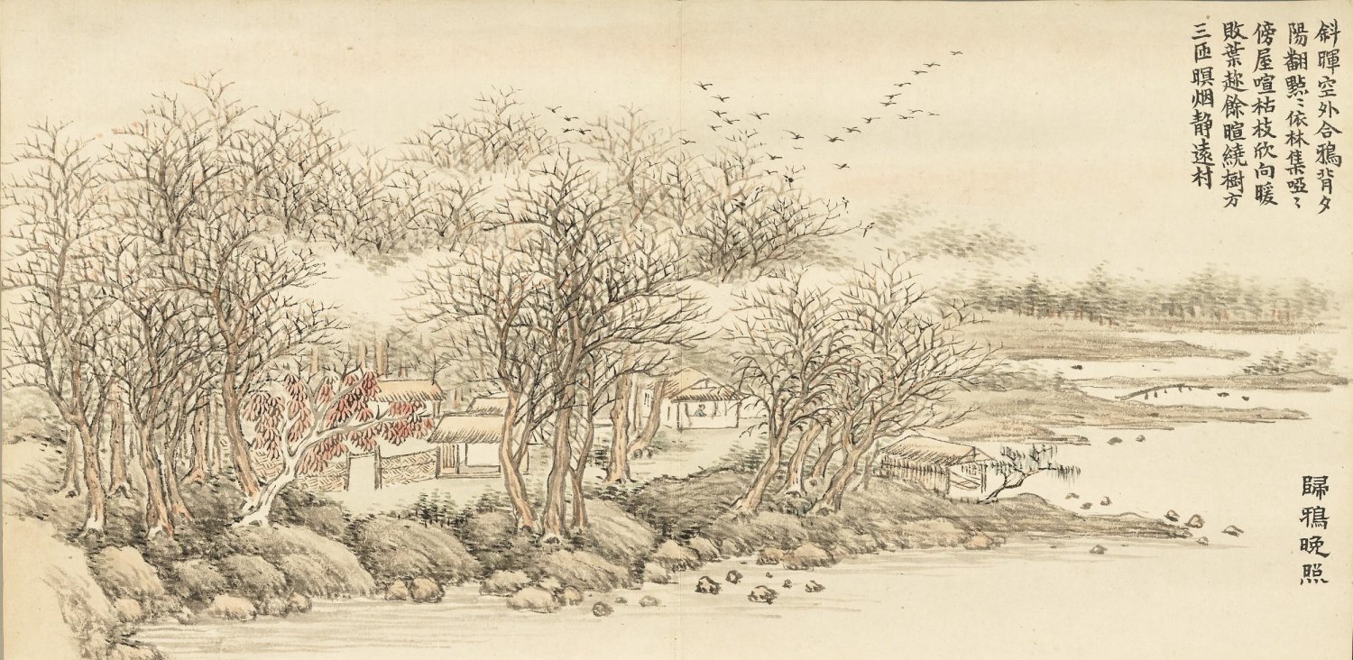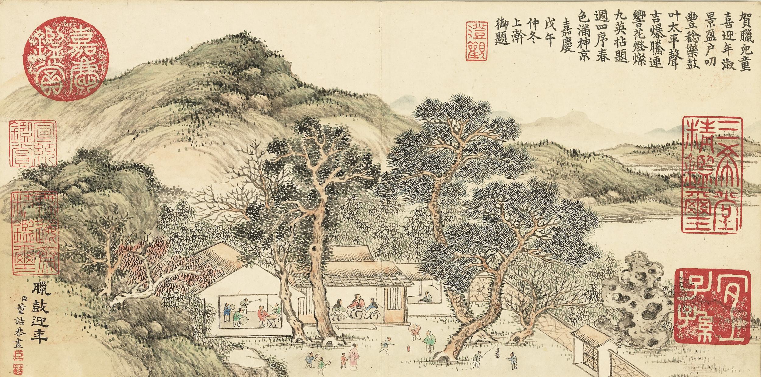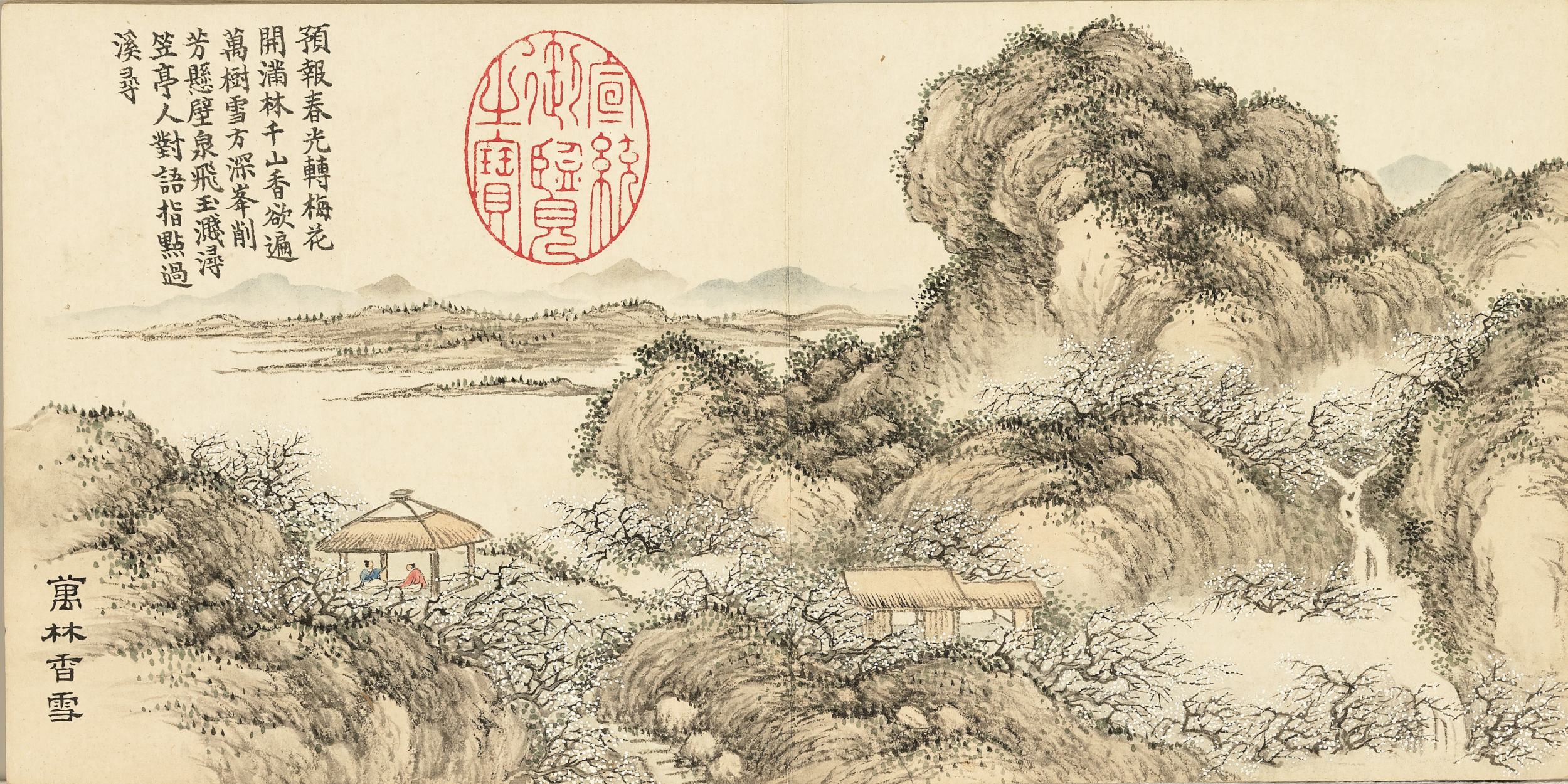此《清音荟景图》册由清代董诰绘。全册共二十四开,画册以四季为主题。用二十四个诗情画意的文人景致,表现了春夏秋冬各自的美,始于:春原牧笛、万林香雪。终于:归鸦晚照、腊鼓迎年。也暗含作者追求自然、清幽的生活情趣。每幅均有清嘉庆帝题跋。此册现藏于台北故宫博物院。