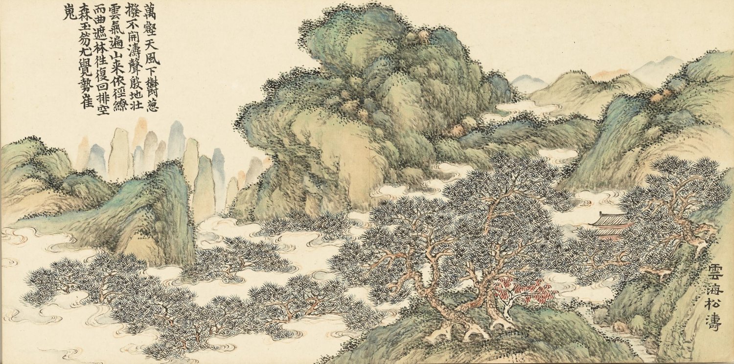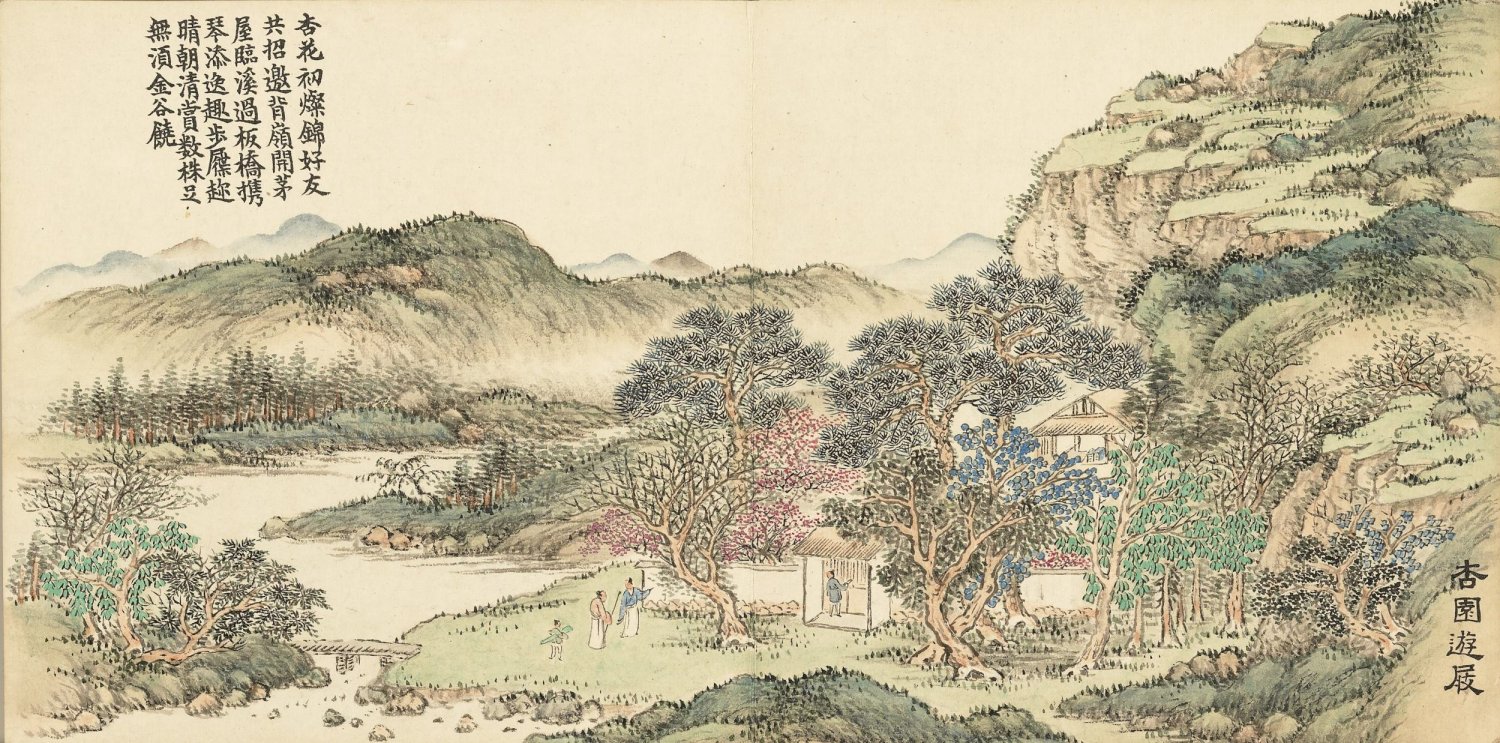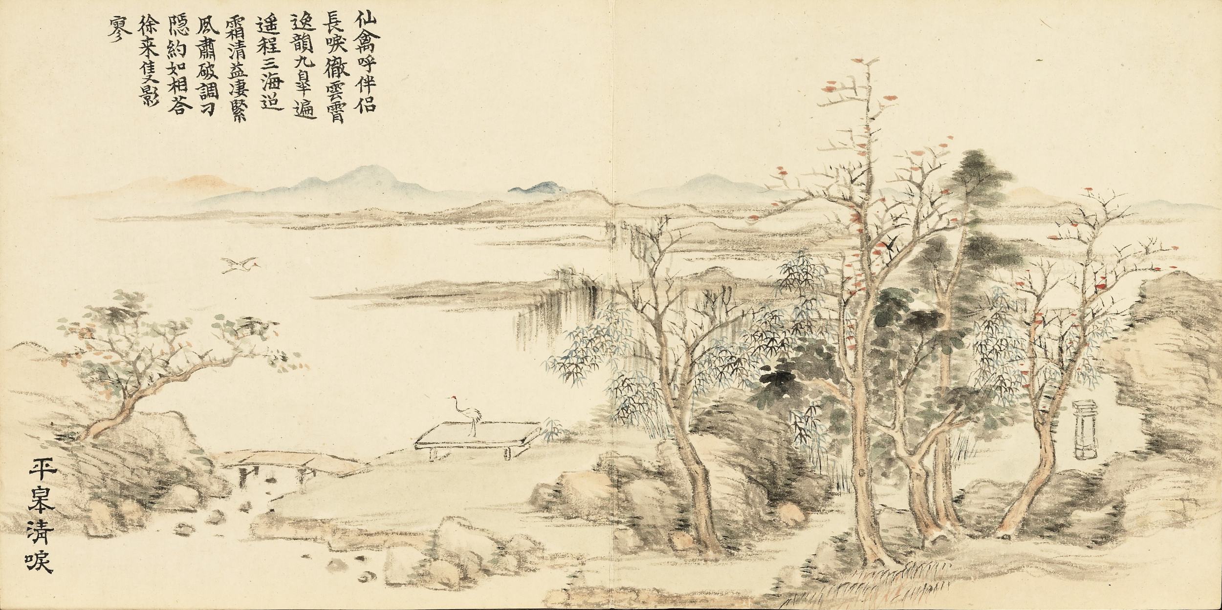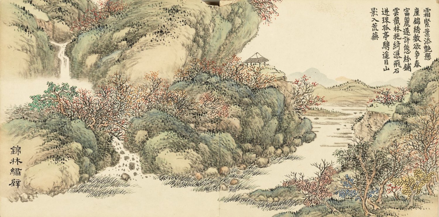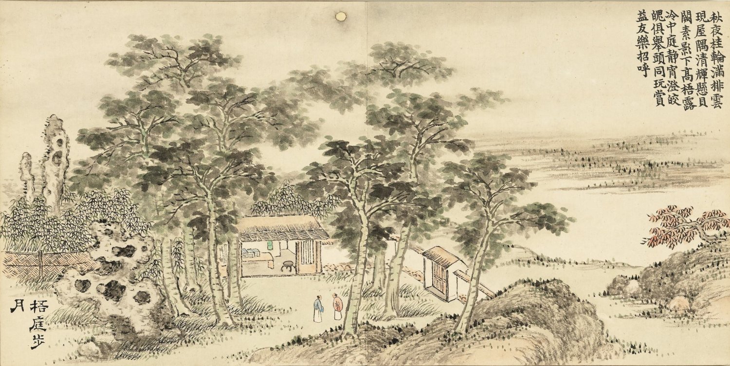 此《清音荟景图》册由清代董诰绘。全册共二十四开,画册以四季为主题。用二十四个诗情画意的文人景致,表现了春夏秋冬各自的美,始于:春原牧笛、万林香雪。终于:归鸦晚照、腊鼓迎年。也暗含作者追求自然、清幽的生活情趣。每幅均有清嘉庆帝题跋。此册现藏于台北故宫博物院。