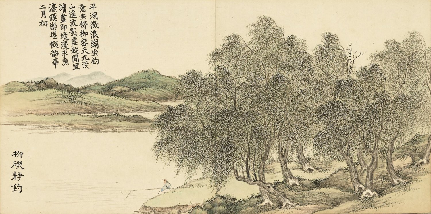 平湖微浪縐。坐釣意安舒。柳密天光淡。山遙波影虛。趁閒宜讀畫。即境漫求魚。濠濮樂堪擬。韶華二月初。