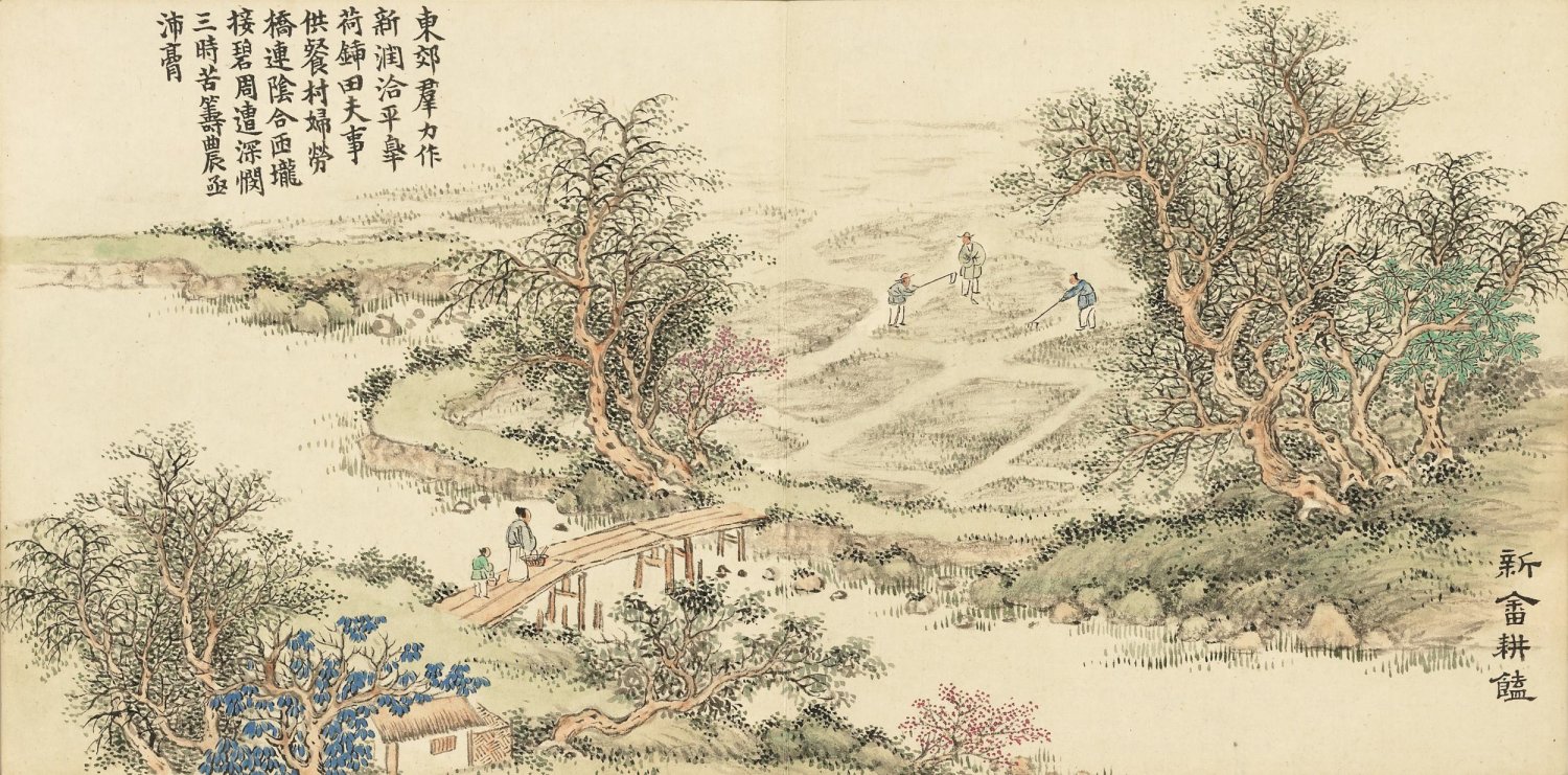 東郊群力作。新潤洽平臯。荷鍤田夫事。供餐村婦勞。橋連陰合匝。壠接碧周遭。深憫三時苦。籌農亟沛膏。