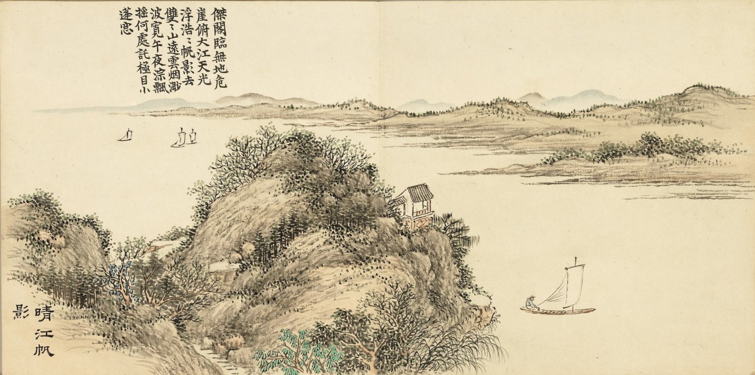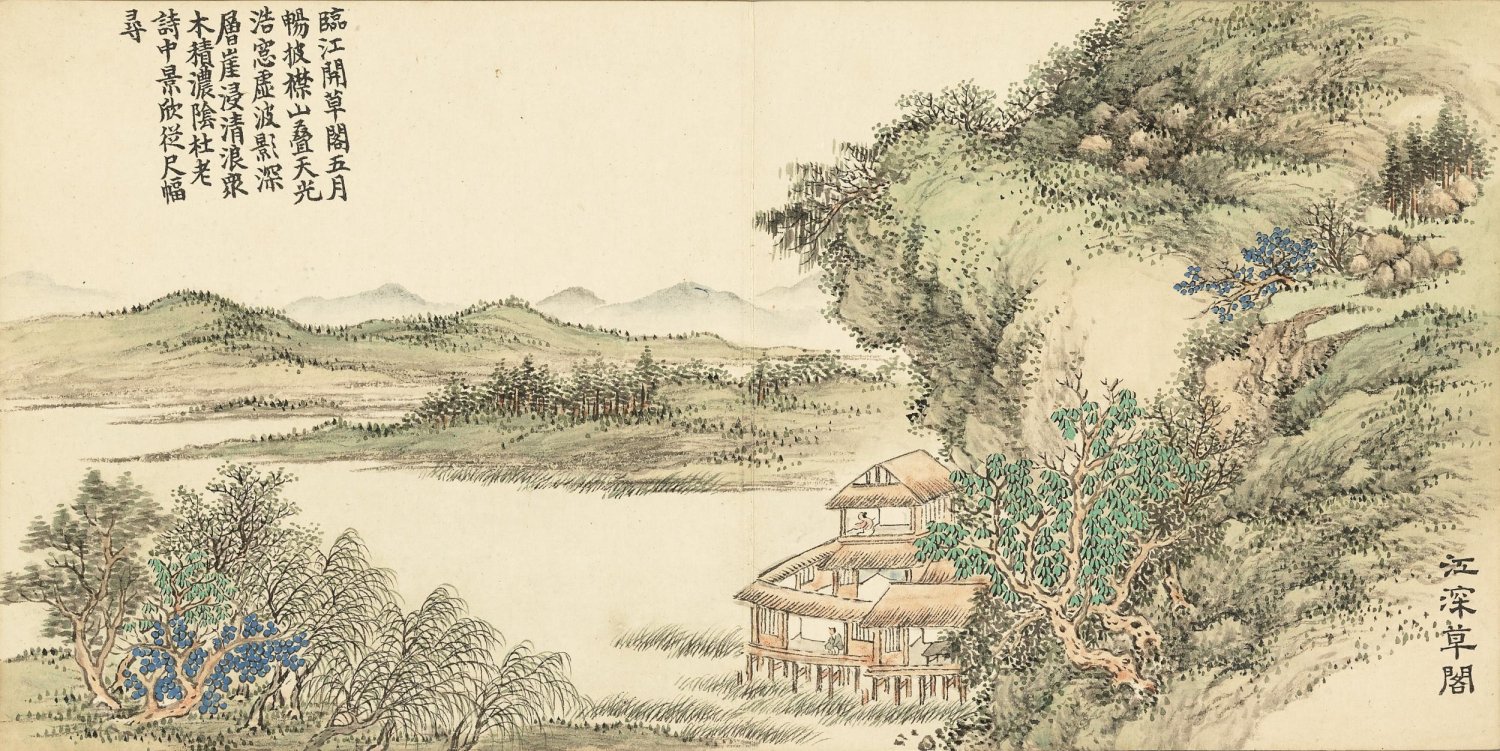 臨江開草閣。五月暢披襟。山叠天光浩。窗虛波影深。層崖浸清浪。眾木積濃陰。杜老詩中景。欣從尺幅尋。
