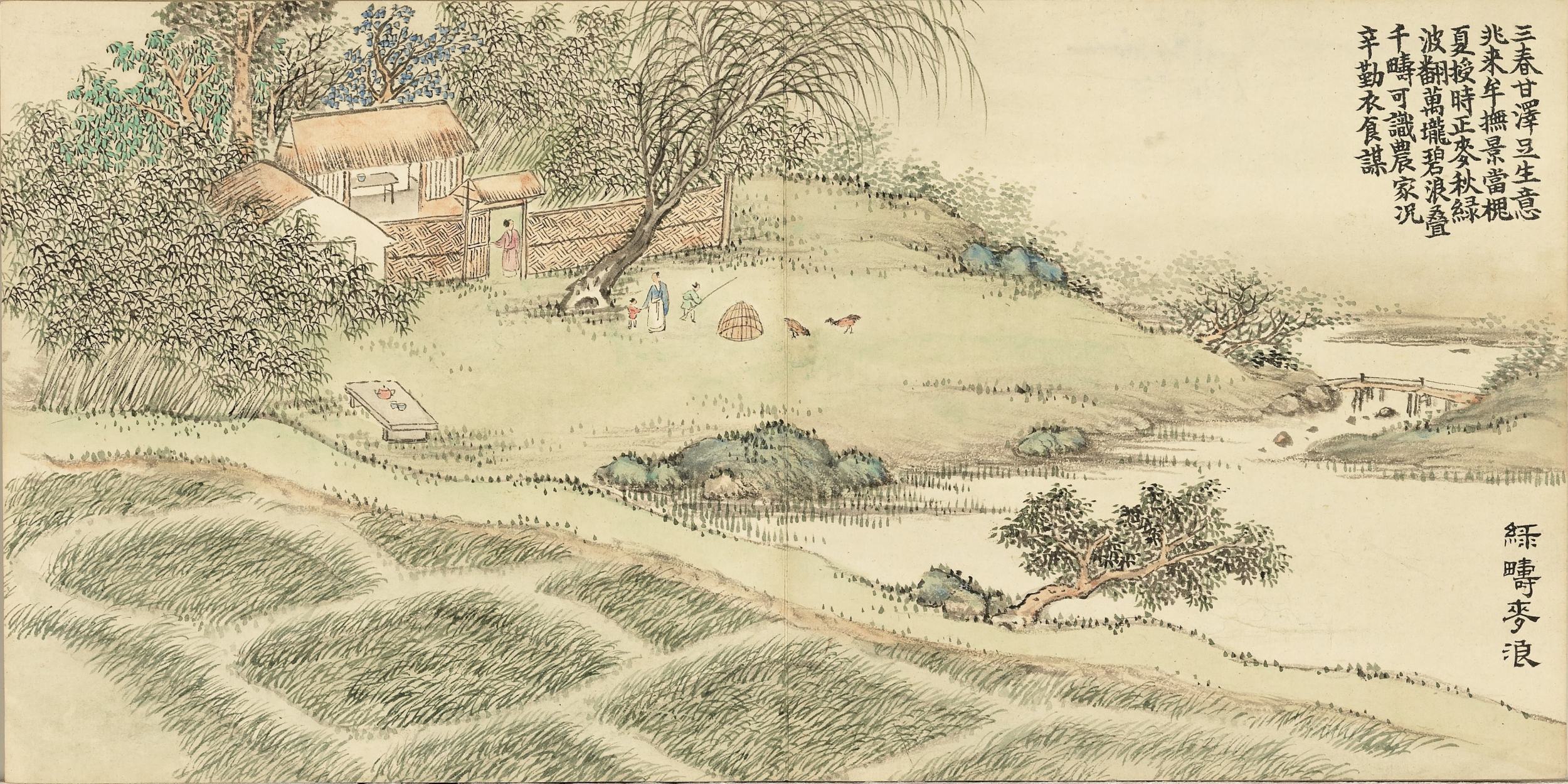 三春甘澤足。生意兆來牟。撫景當槐夏。授時正麥秋。綠波翻萬壠。碧浪叠千疇。可識農家況。辛勤衣食謀。