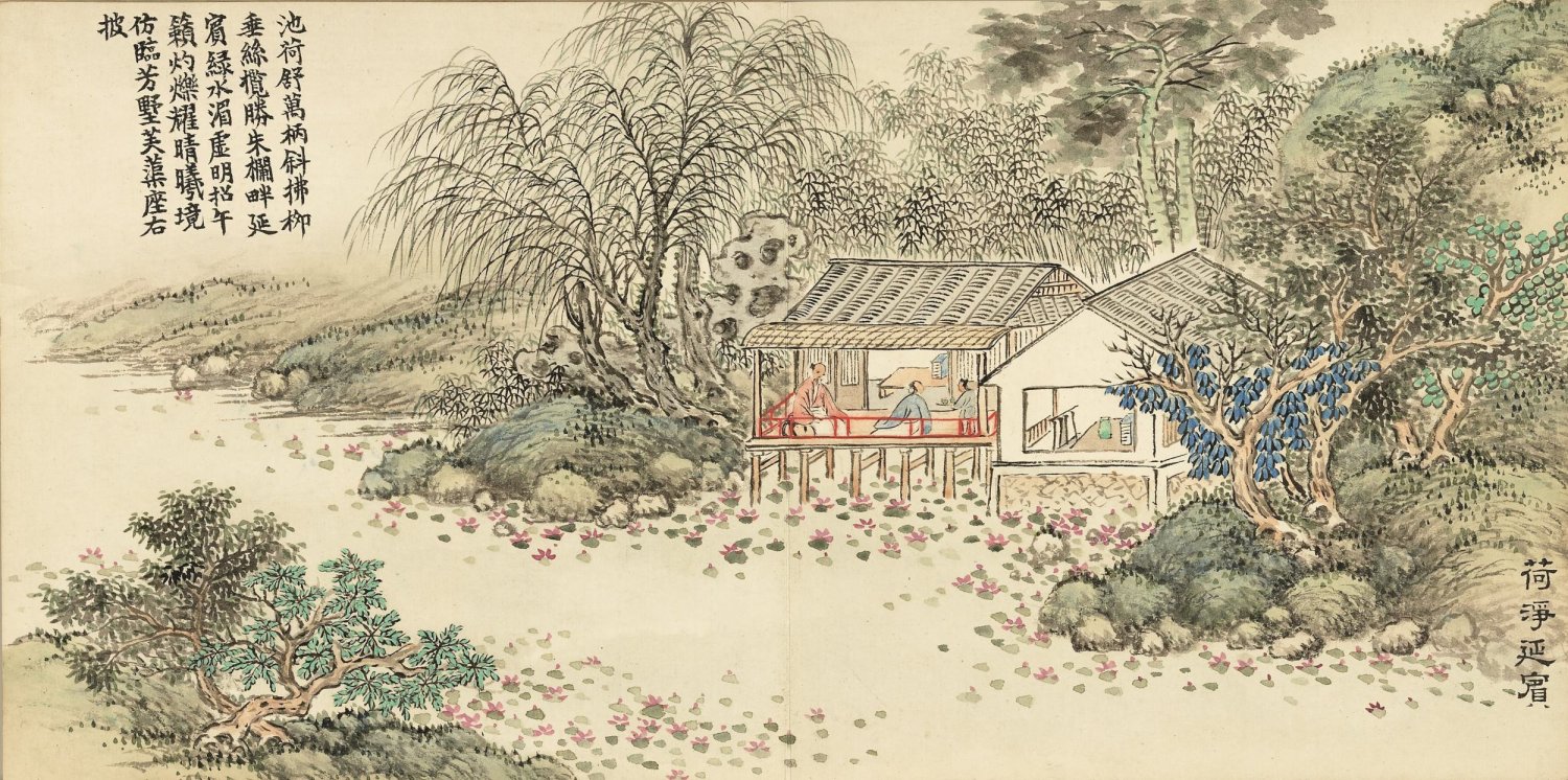 池荷舒萬柄。斜拂柳垂絲。攬勝朱欄畔。延賓綠水湄。虛明招午籟。灼爍耀晴曦。境仿臨芳墅。芙蕖座右披。