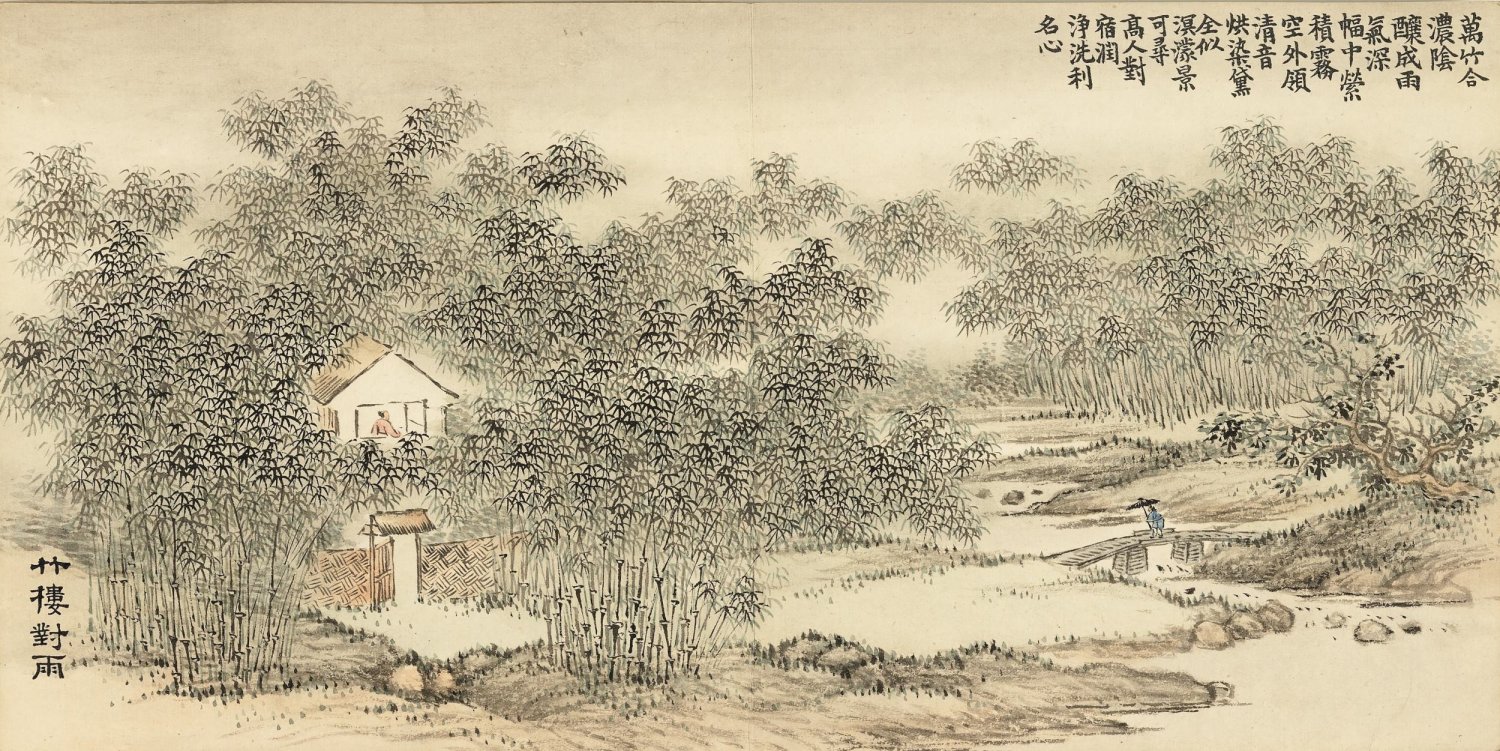 萬竹合濃陰。釀成雨氣深。幅中縈積霧。空外領清音。烘染黛全似。溟濛景可尋。高人對宿潤。淨洗利名心。