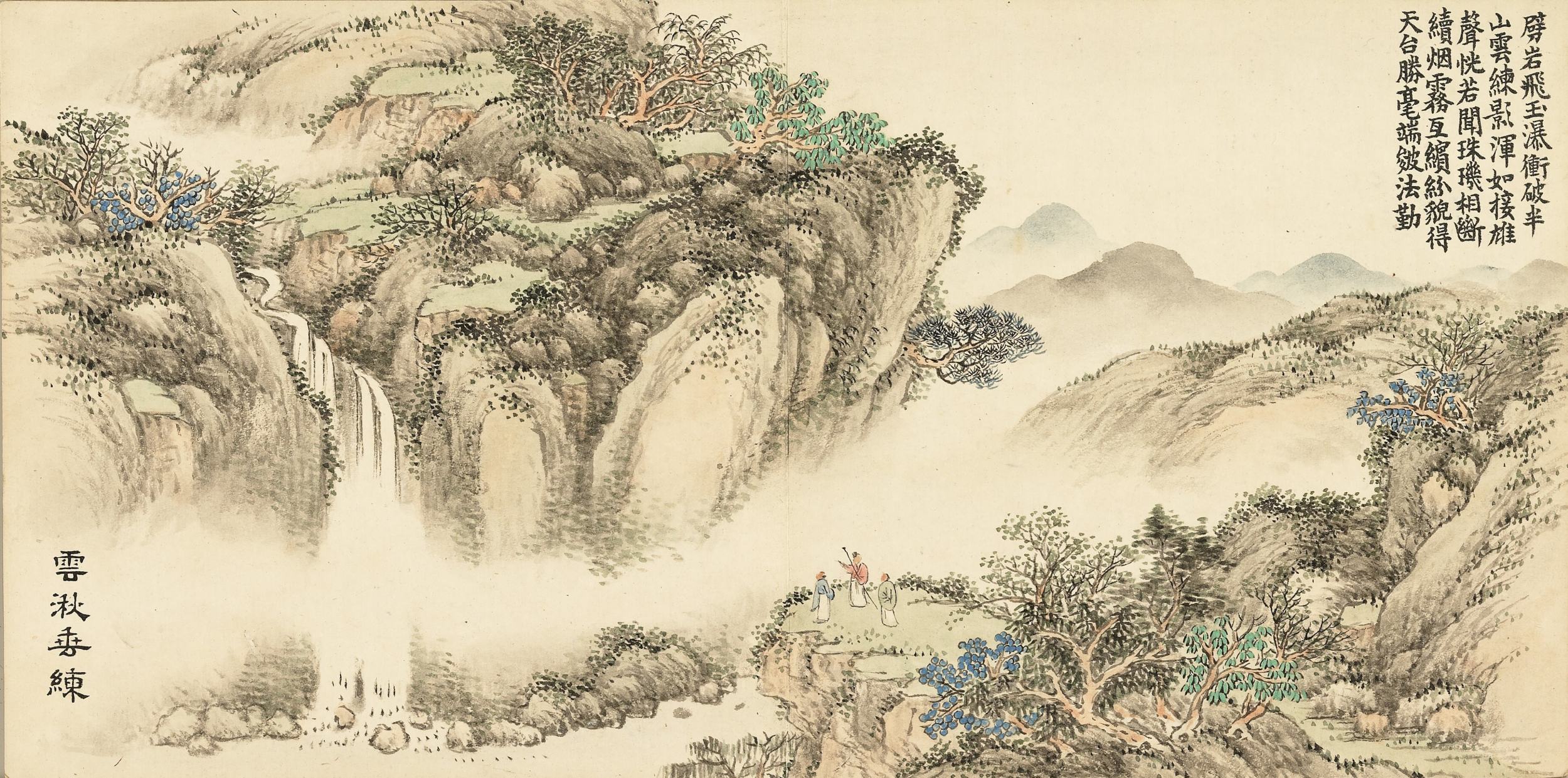 劈岩飛玉瀑。衝破半山雲。練影渾如接。雄聲恍若聞。珠璣相斷續。烟霧亙繽紛。貌得天台勝。毫端皴法勤。