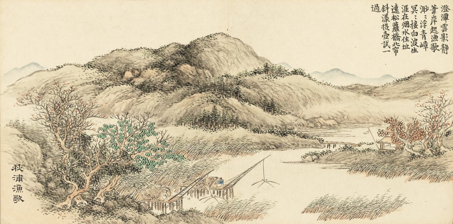 澄潭雲影靜。葦岸起漁歌。渺渺浮青嶂。冥冥接白波。生涯在烟水。住址遠松蘿。橋北帘斜漾。提壺試一過。