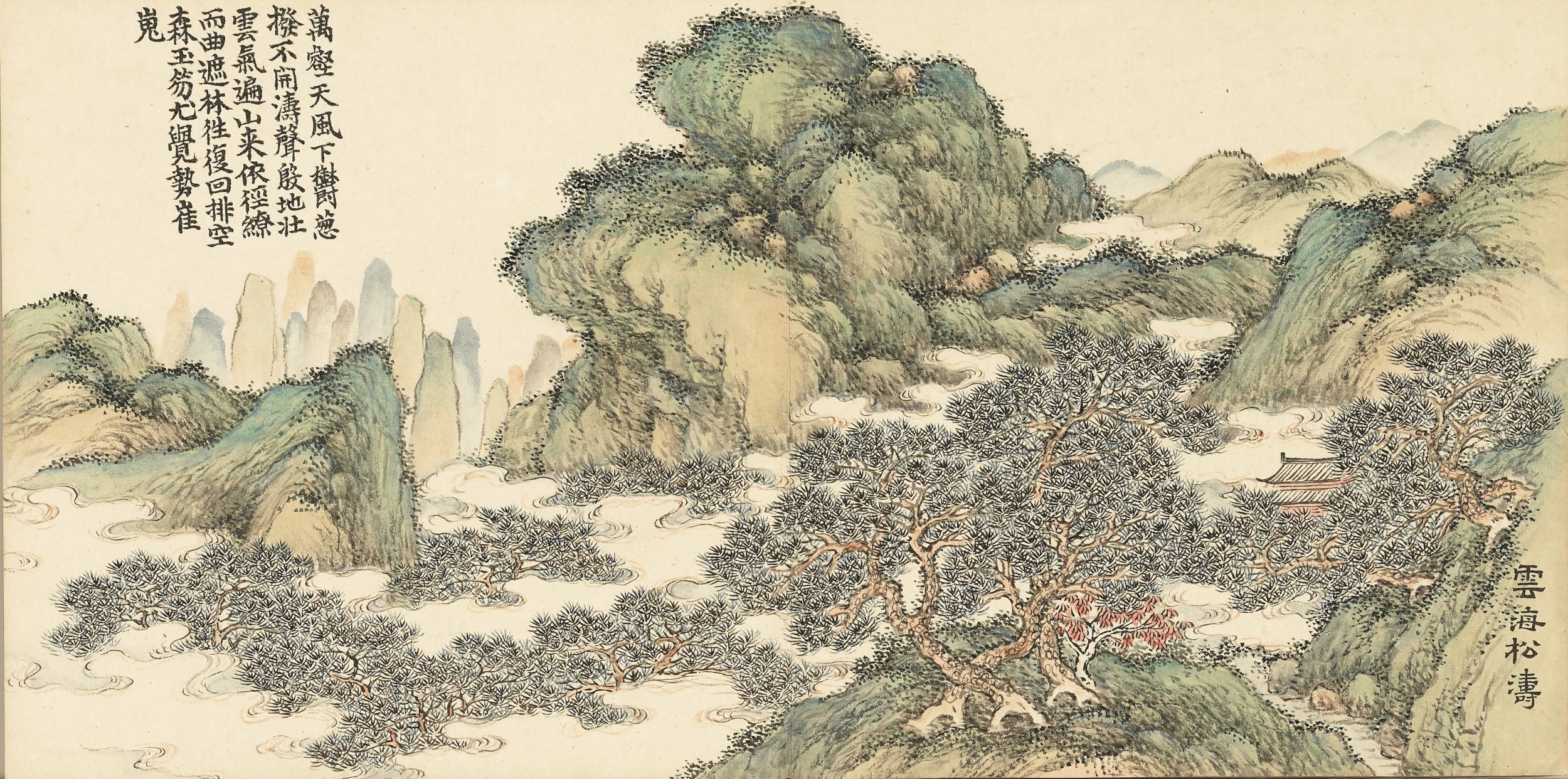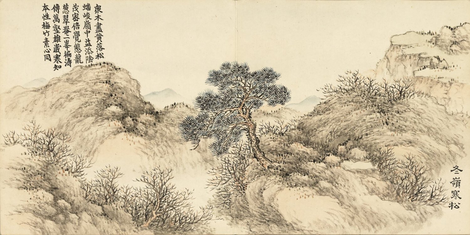 眾木盡黃落。松蟠峻嶺中。益添陰茂密。倍覺態蘢葱。翠罨一峰徧。濤傳萬壑雄。歲寒知本性。梅竹素心同。