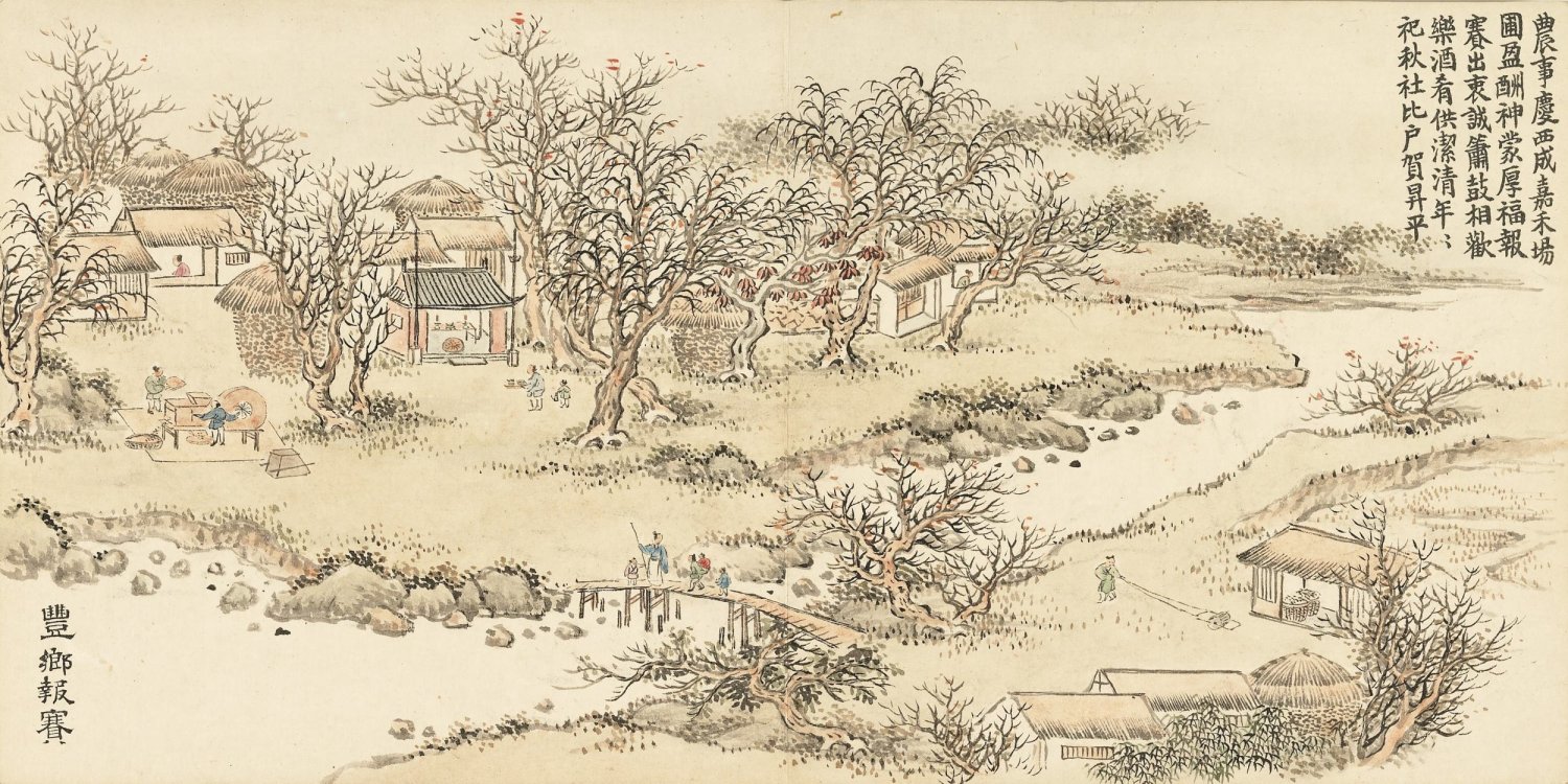 農事慶西成。嘉禾場圃盈。酬神蒙厚福。報賽出衷誠。簫鼓相歡樂。酒肴供潔清。年年祀秋社。比戶賀昇平。
