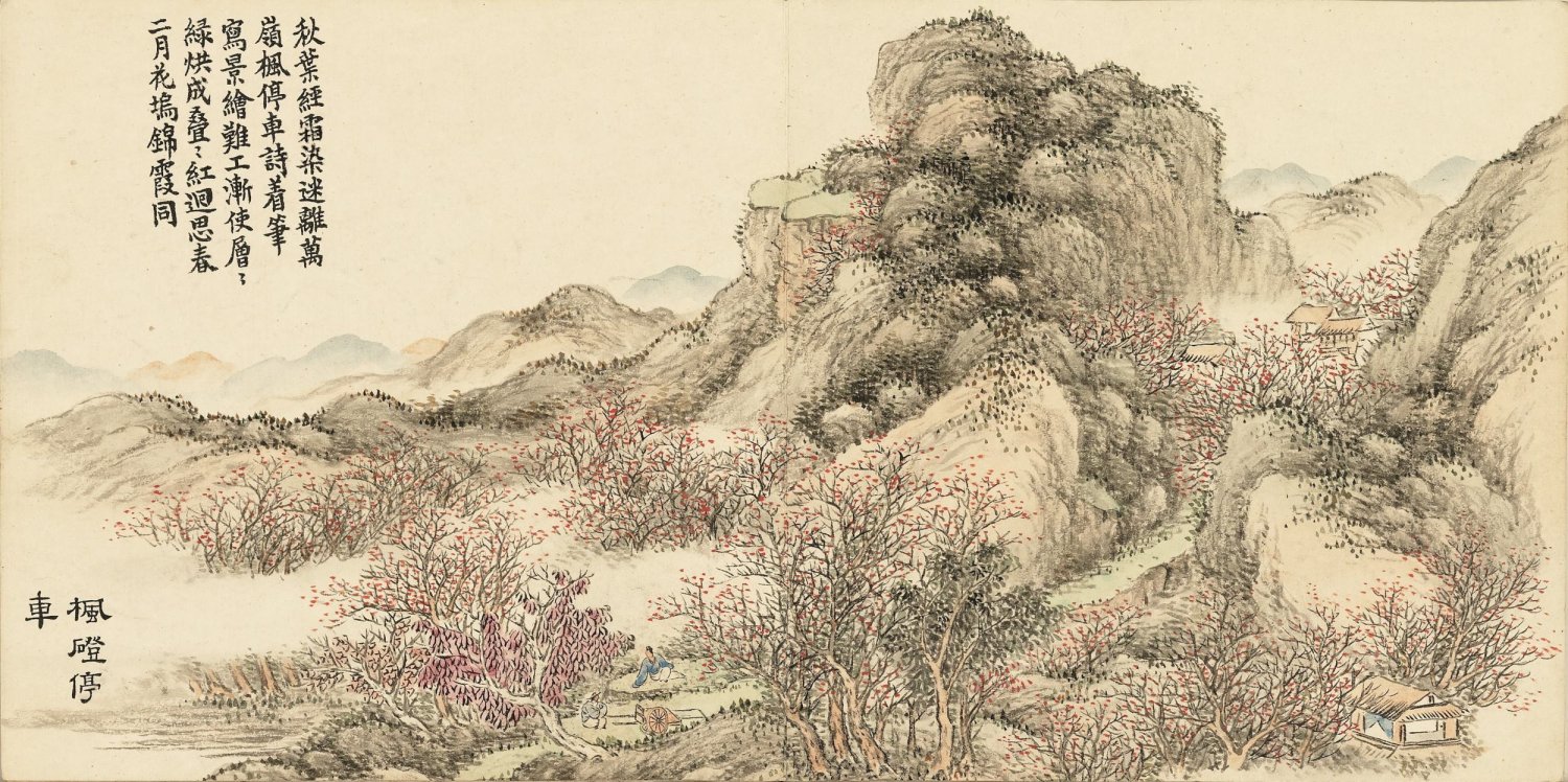 秋葉經霜染。迷離萬嶺楓。停車詩著筆。寫景繪難工。漸使層層綠。烘成叠叠紅。迴思春二月。花塢錦霞同。