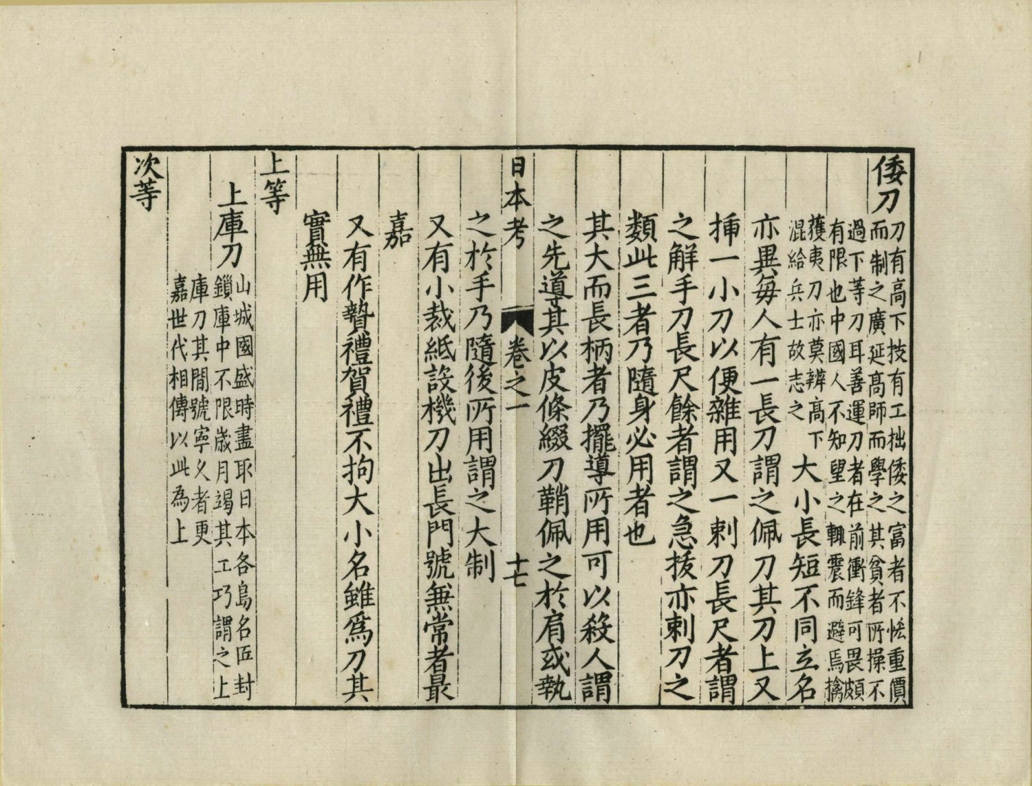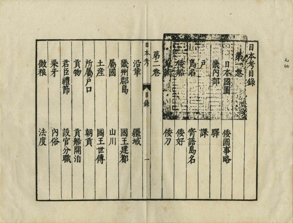第一卷:日本國圖、倭國事略、畿內部、寄語島名、倭船、倭好、宼術、倭刀