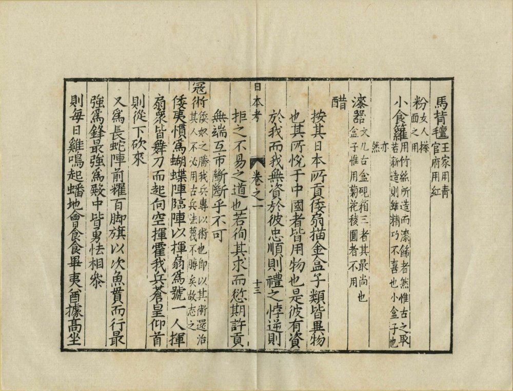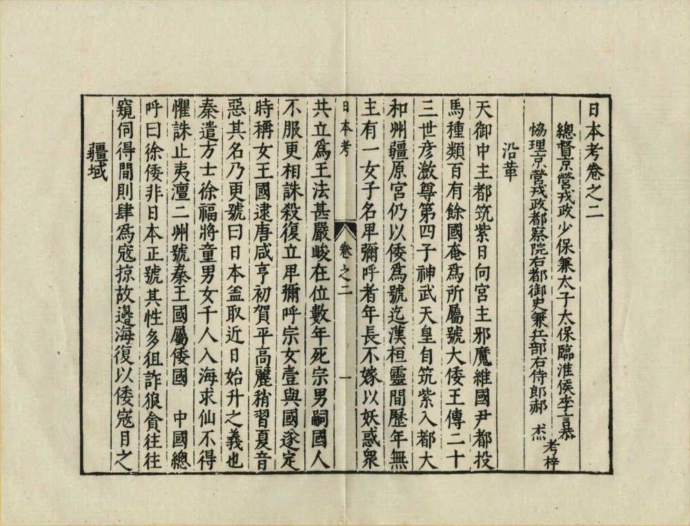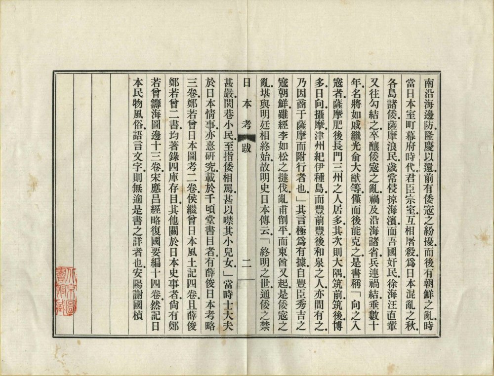 此《日本考》由明代李言恭、郝杰同撰。全书共五卷,记录日本山川地理、岛屿沿革、风俗物产、制度事务、字书译语、诗词琴棋等。该书编纂于明嘉靖至万历年间,旨在为抵御倭寇的明朝将士提供日本国情参考。此为民国二十六年上海商务印书馆影印明万历时期刊本。