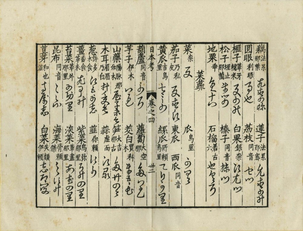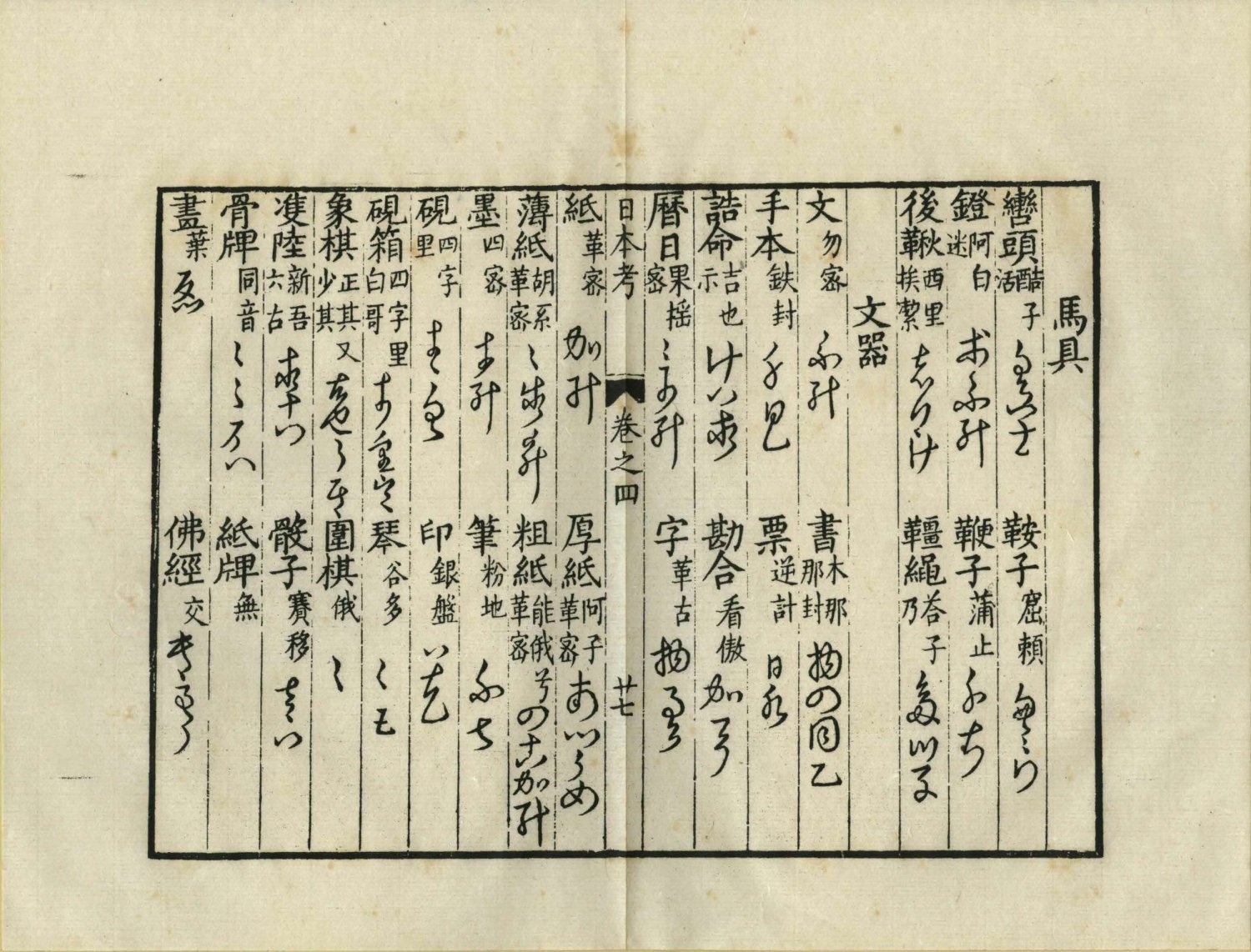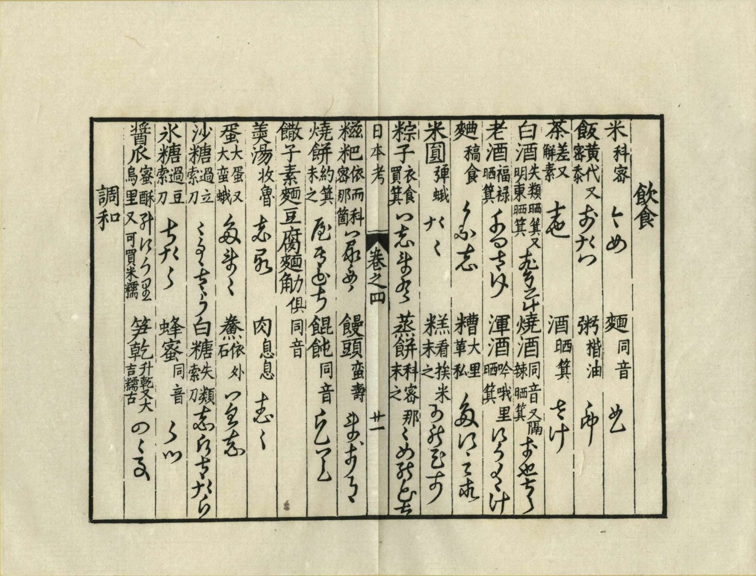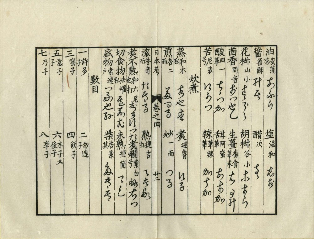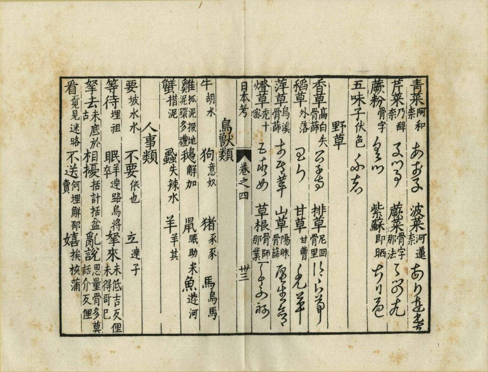 第四卷:語音、天文、時令、寒溫、曉夜、月分、日數、今明、五行、十干、十二支、甲子、地理、火炭、宫室、城市、國部、方向、人物、君臣、吏從、軍民、教流、工藝、流賤、篤廢、親屬、稱荅、身體、衣服、鋪盖、段布、顔色、五穀、飲食、炊煮、數目、算法、器用、內器、農具、舩具、馬具、文器、武具、响器、香料、醫用、珍寶、花木、菓子、菜蔬、野草、鳥獸類、人事類