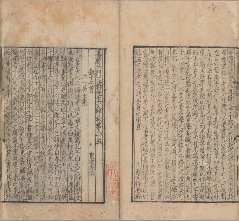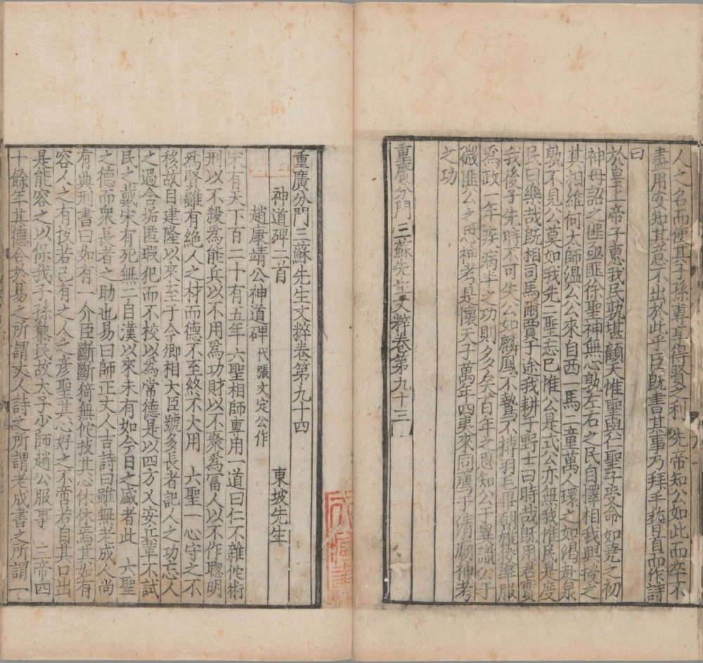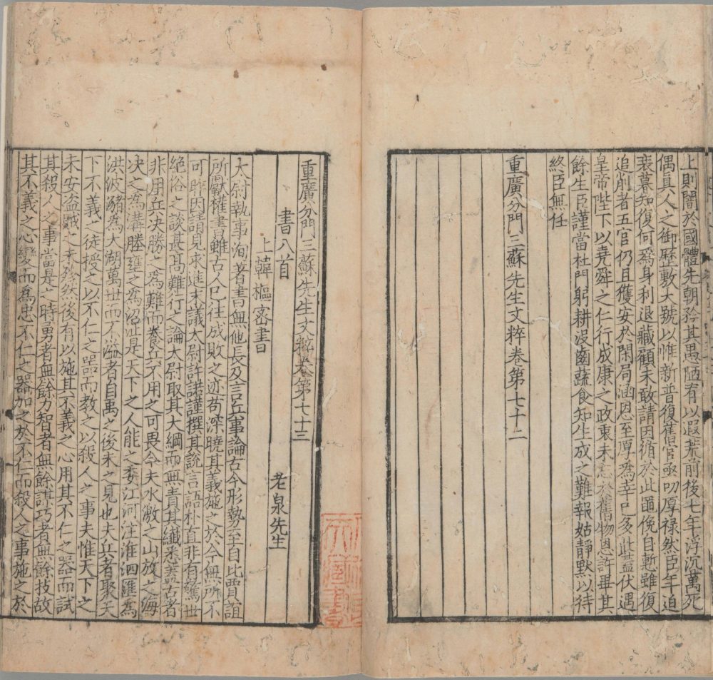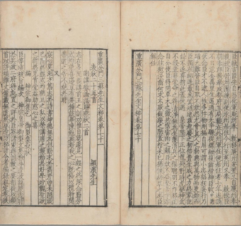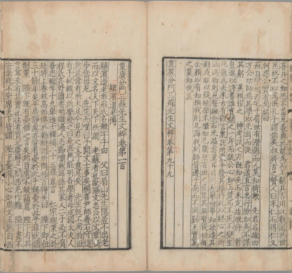 《三苏先生文粹》宋代所编三苏文集有两个体系:一是按人为编,编中分类,如七十卷本《三苏先生文粹》;一是分类成编,编中依人排序,即此《重广分门三苏先生文粹》,原系清宫旧藏,现存于日本宫内厅书陵部。此"重广分门"百卷本,刻工精良,首尾完具,为存世孤本。