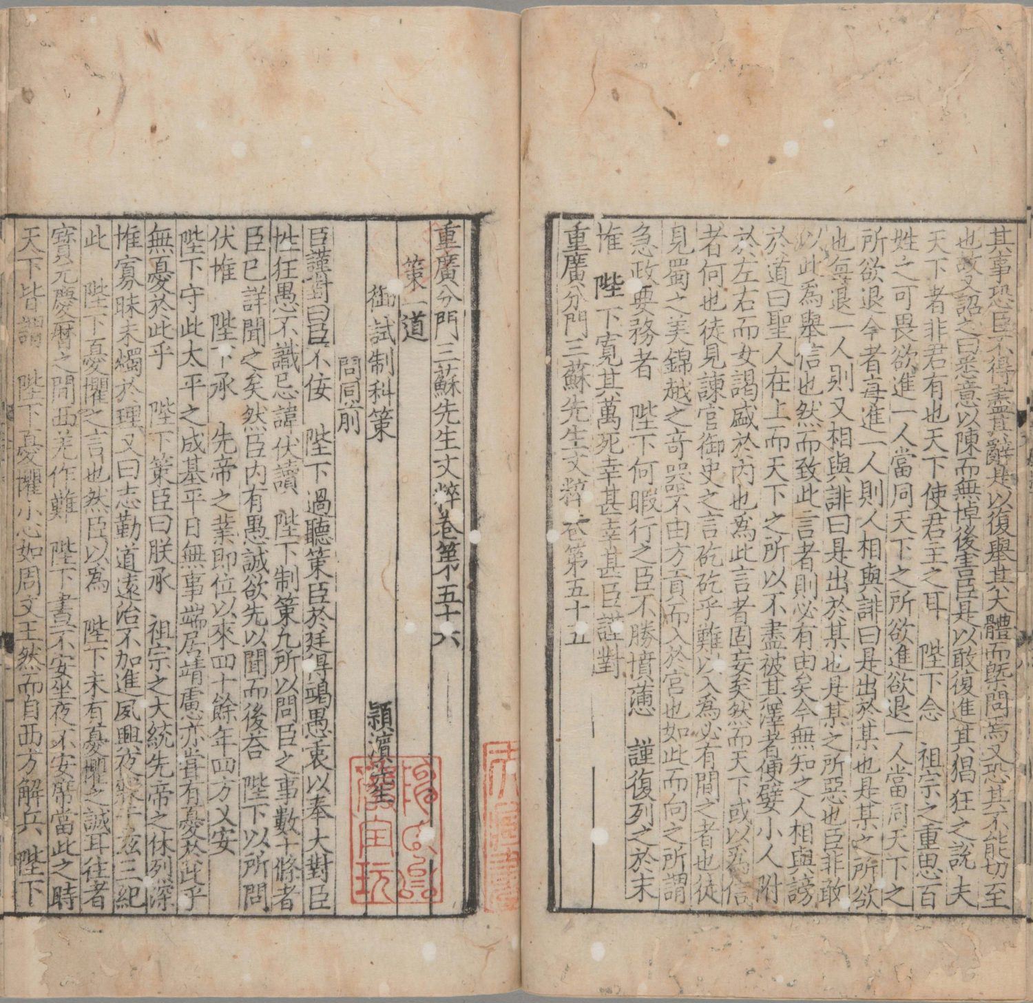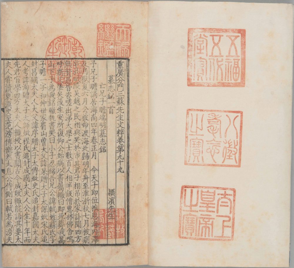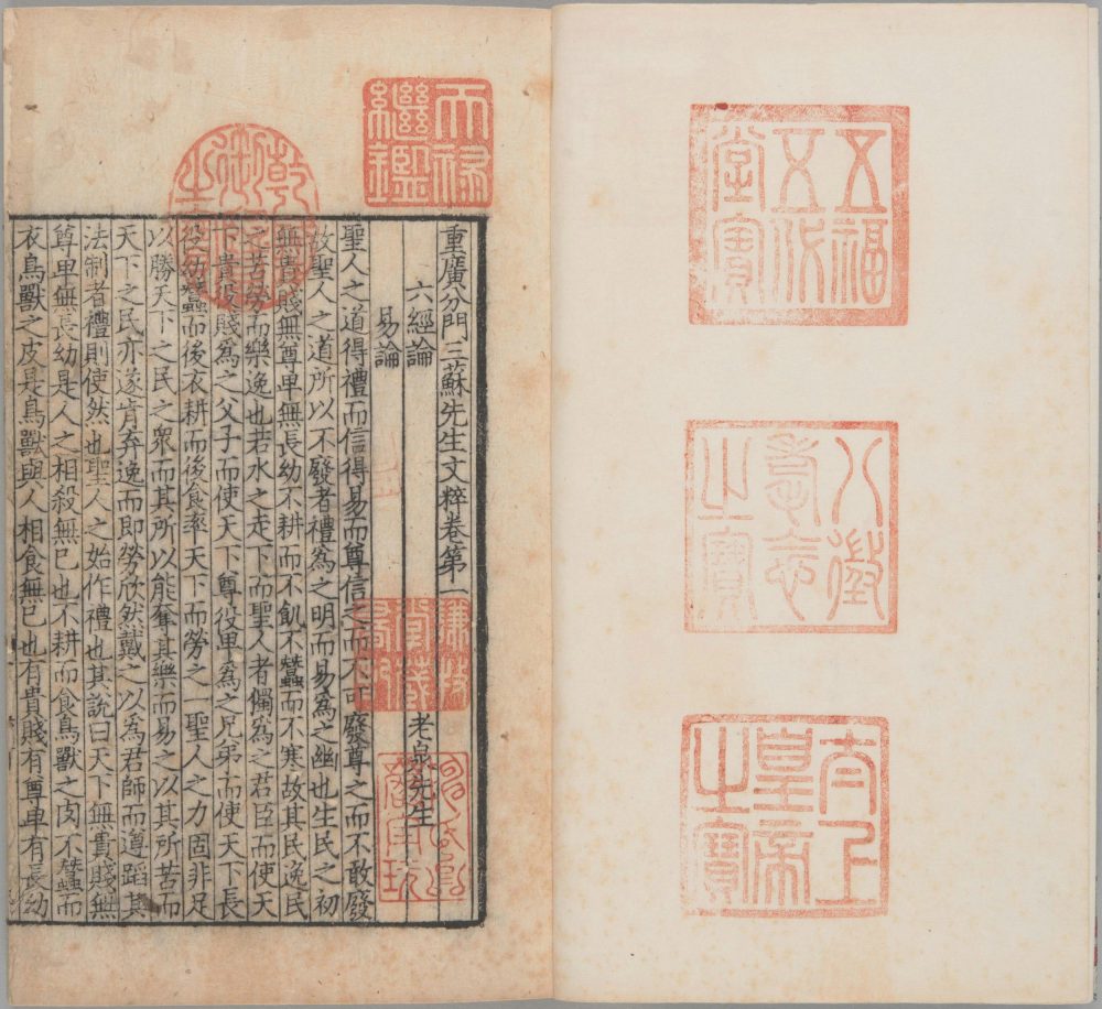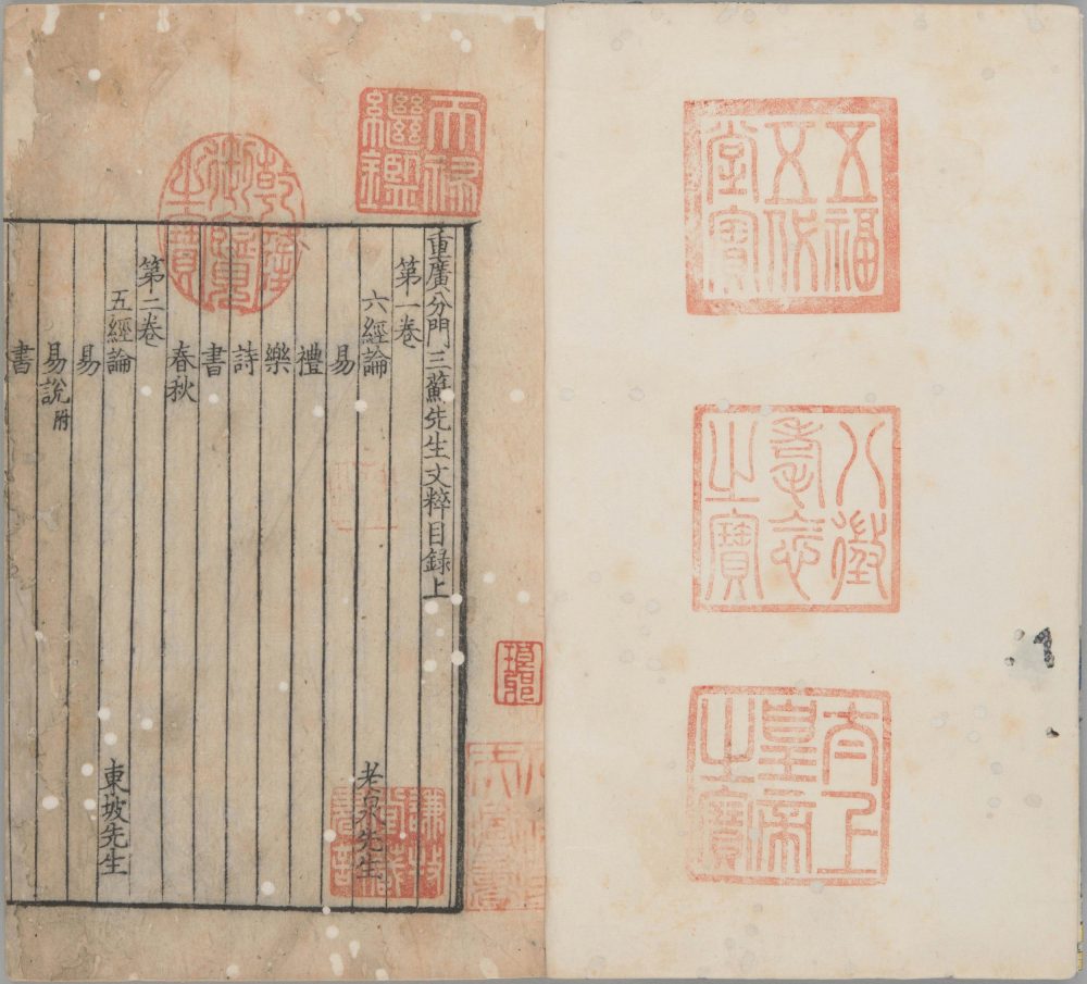 《三苏先生文粹》宋代所编三苏文集有两个体系:一是按人为编,编中分类,如七十卷本《三苏先生文粹》;一是分类成编,编中依人排序,即此《重广分门三苏先生文粹》,原系清宫旧藏,现存于日本宫内厅书陵部。此"重广分门"百卷本,刻工精良,首尾完具,为存世孤本。
