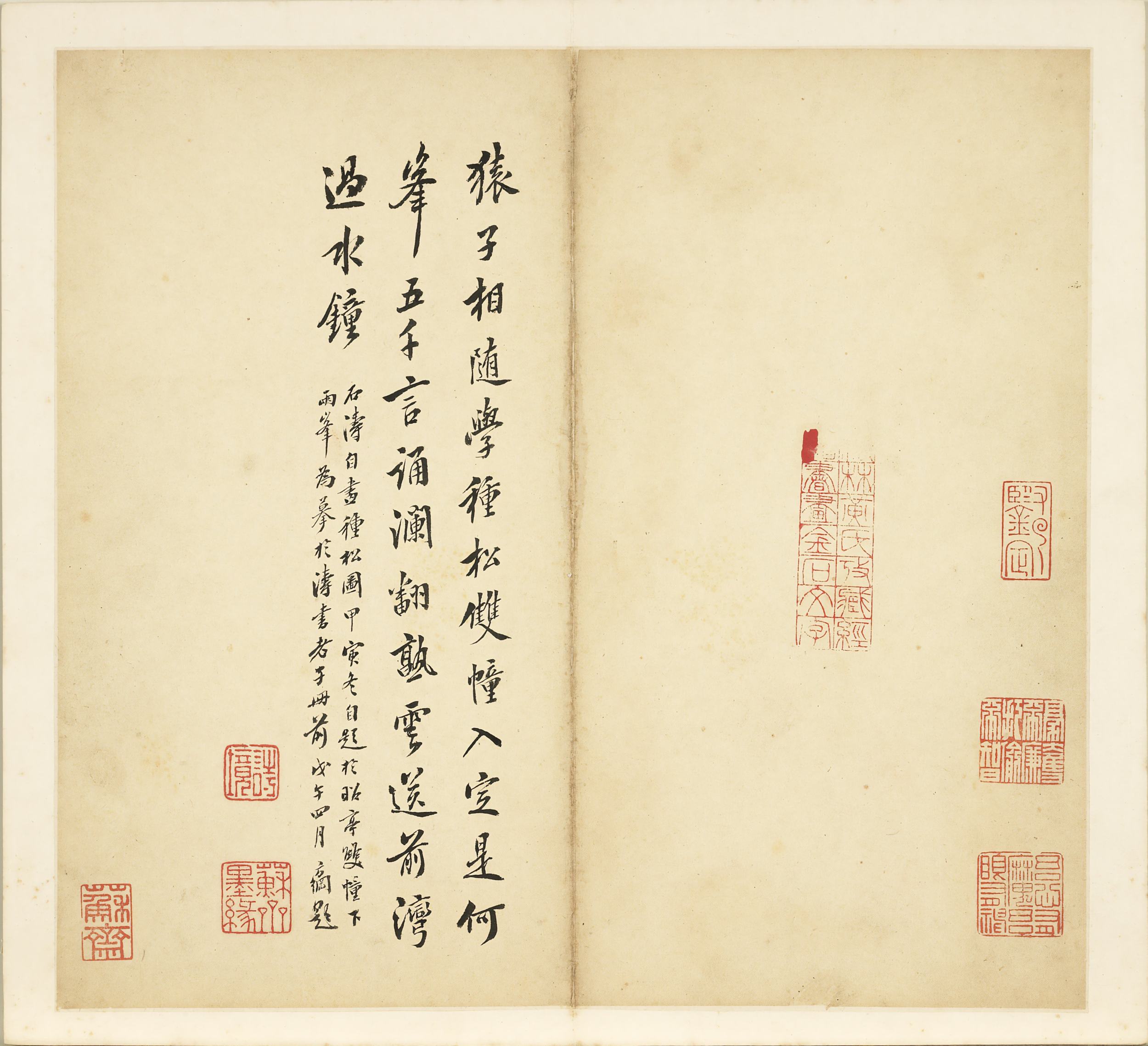 猿子相隨學種松。雙幢入定是何峯。五千言誦瀾翻熟。雲送前灣過水鐘。石濤自畫種松圖。甲寅冬(西元一七九四年)自題於昭亭雙幢下。兩峯為摹於濤書老子冊前。戊午四月方綱題