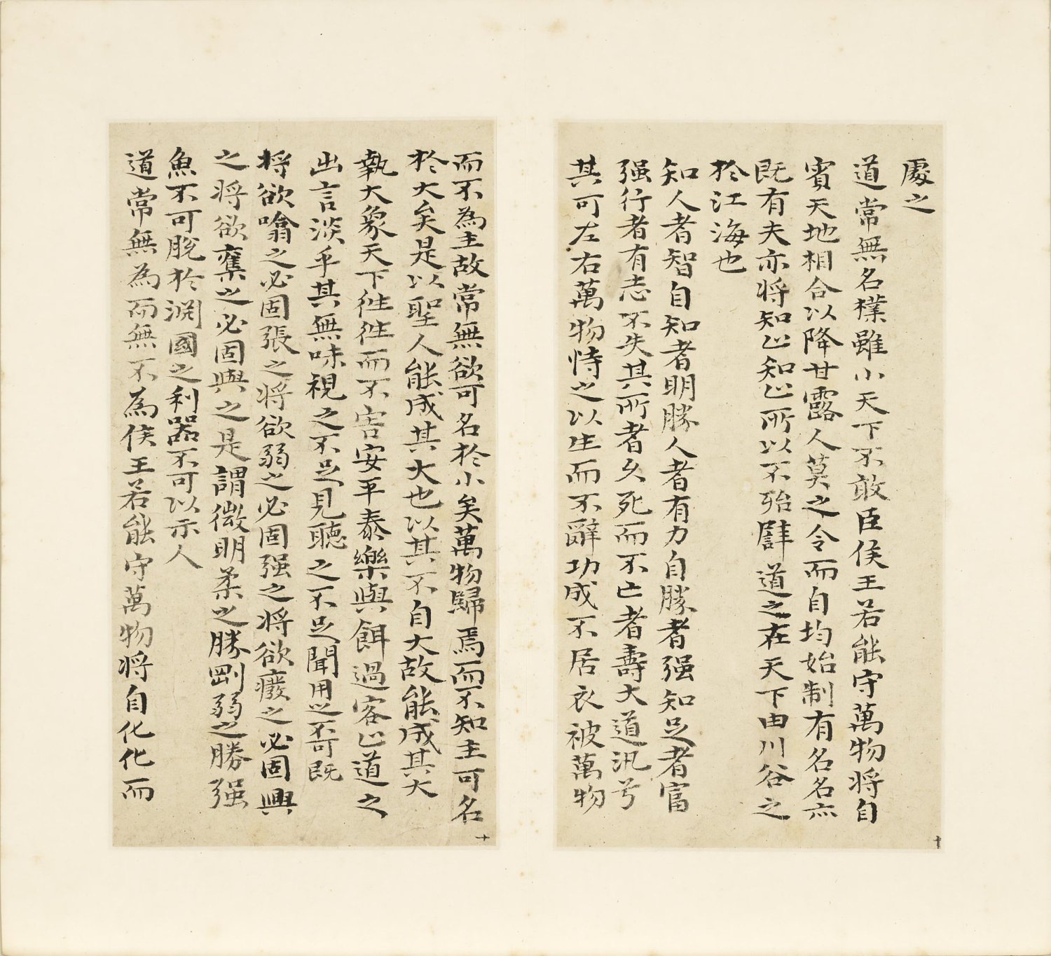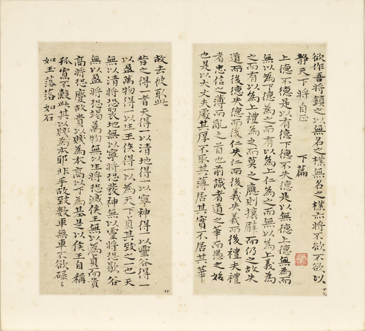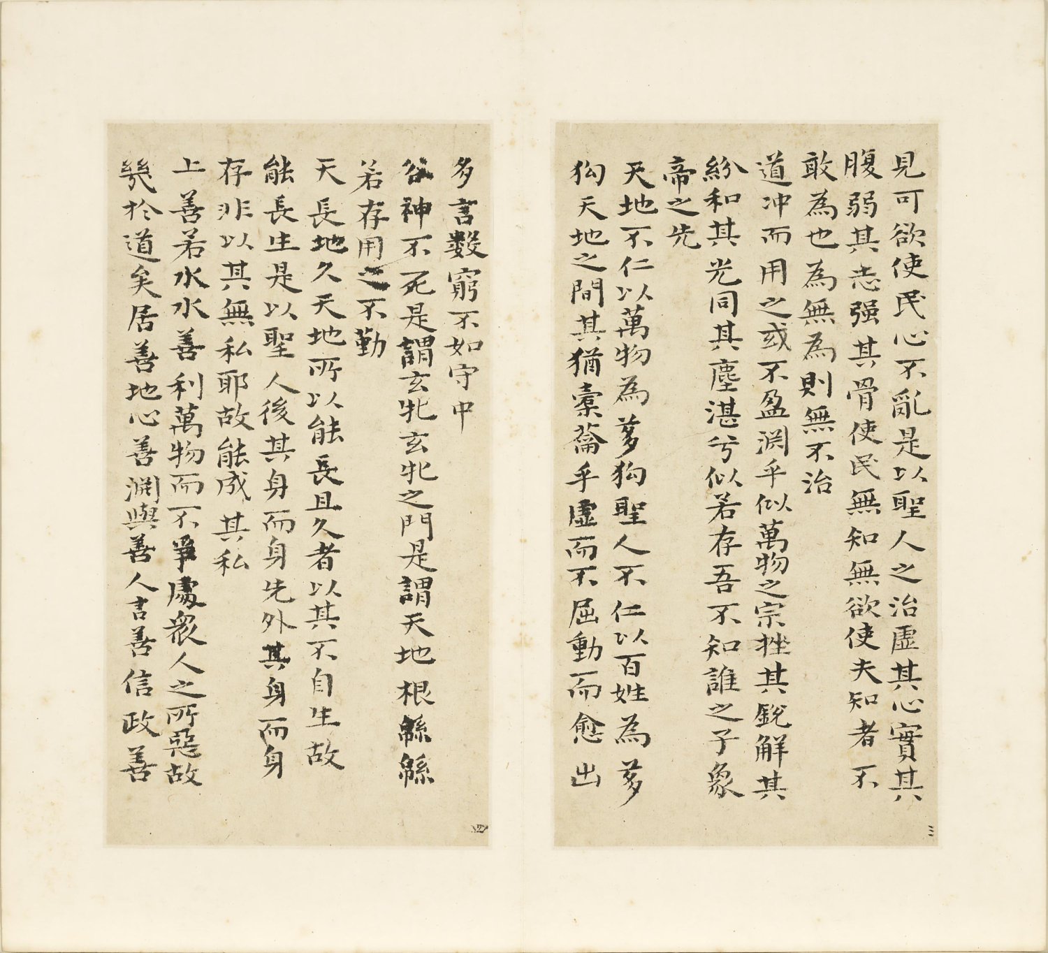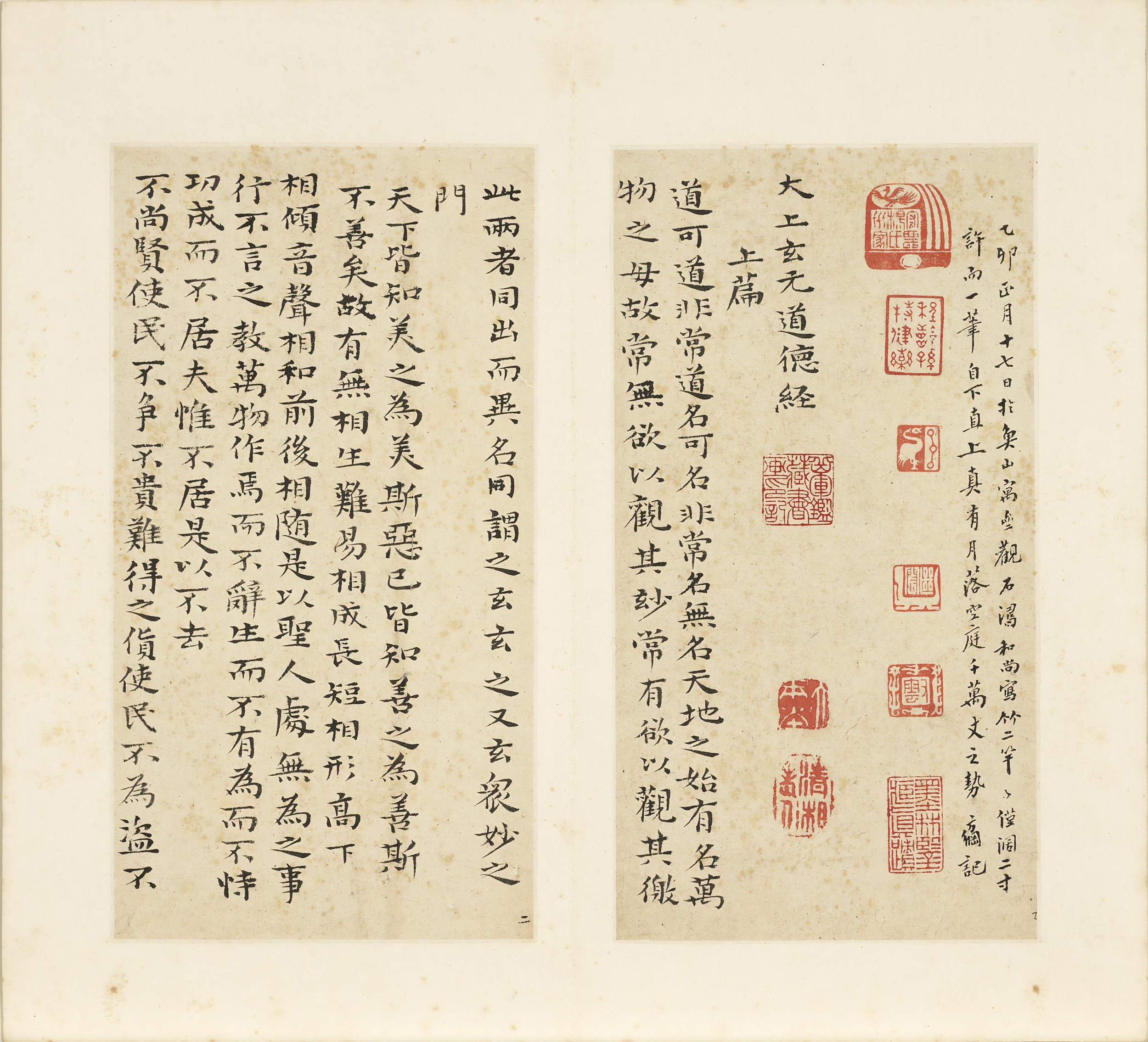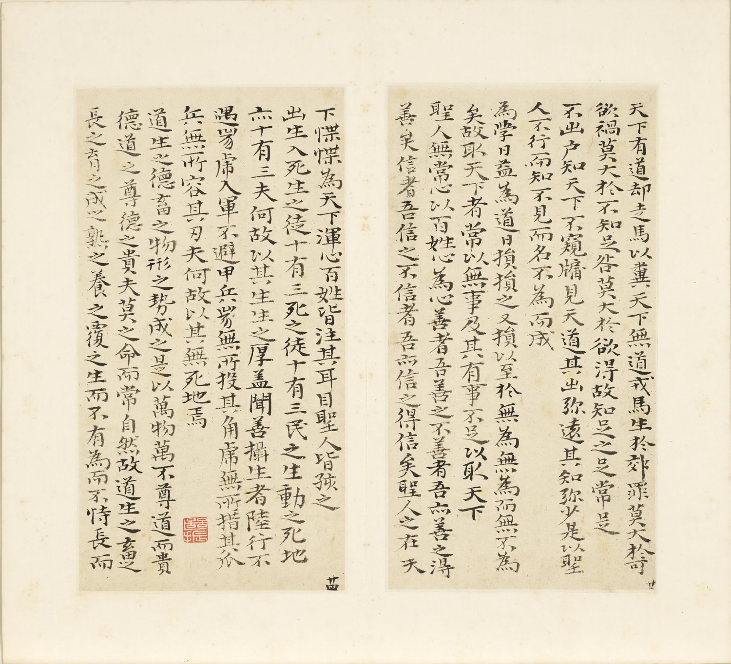 此《道德经》册由明末清初石涛书。全册共二十六开(正文二十开),正文以精笔小楷书就,凡五千余字。其书笔致从容,章法若有节奏,体势似法非法,意境清新冷逸,颇具魏晋人风致。前附罗聘临石涛种松图,翁方纲题跋五则。此册为翁方纲(苏斋)旧藏,现藏于台北故宫博物院。