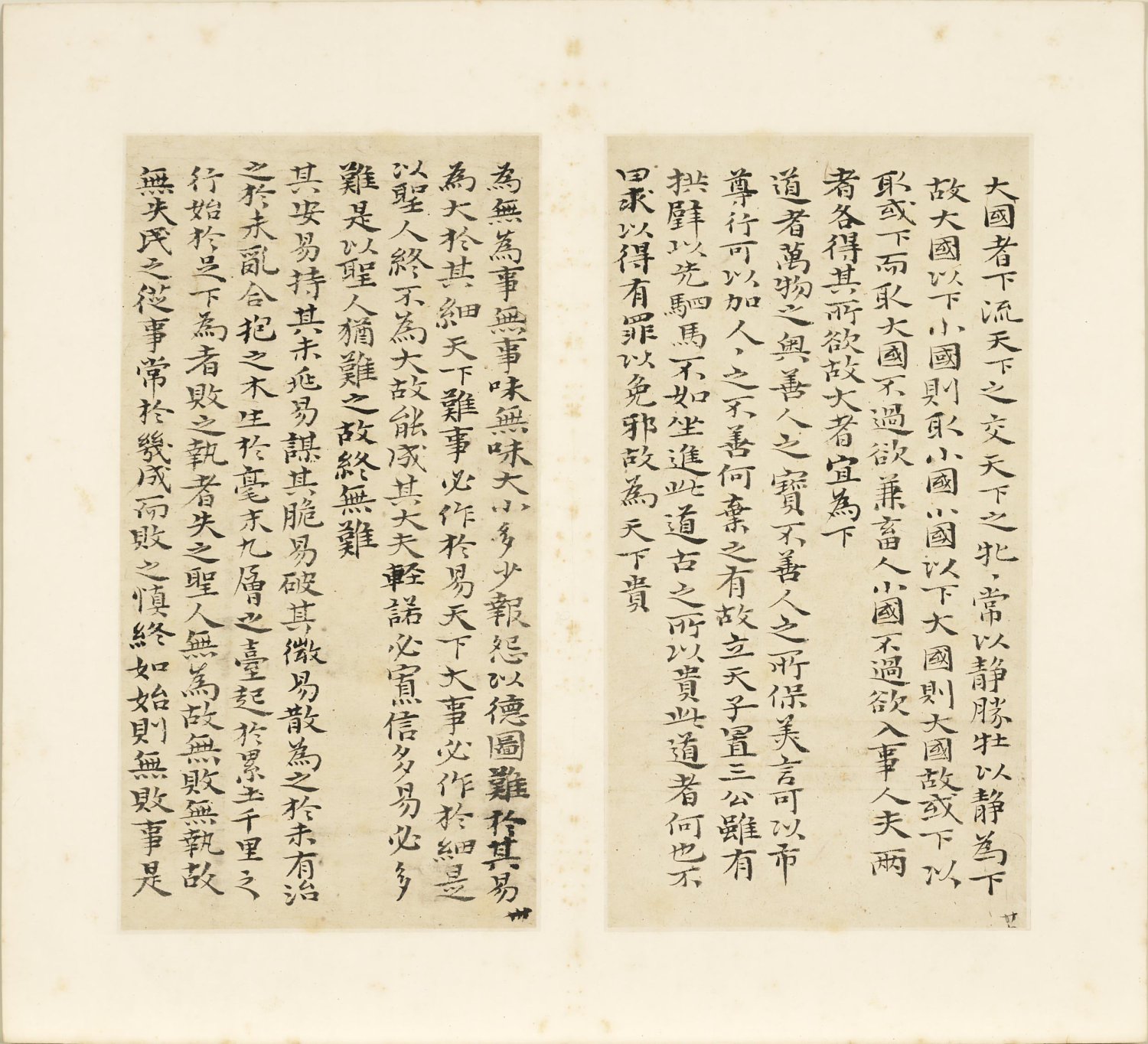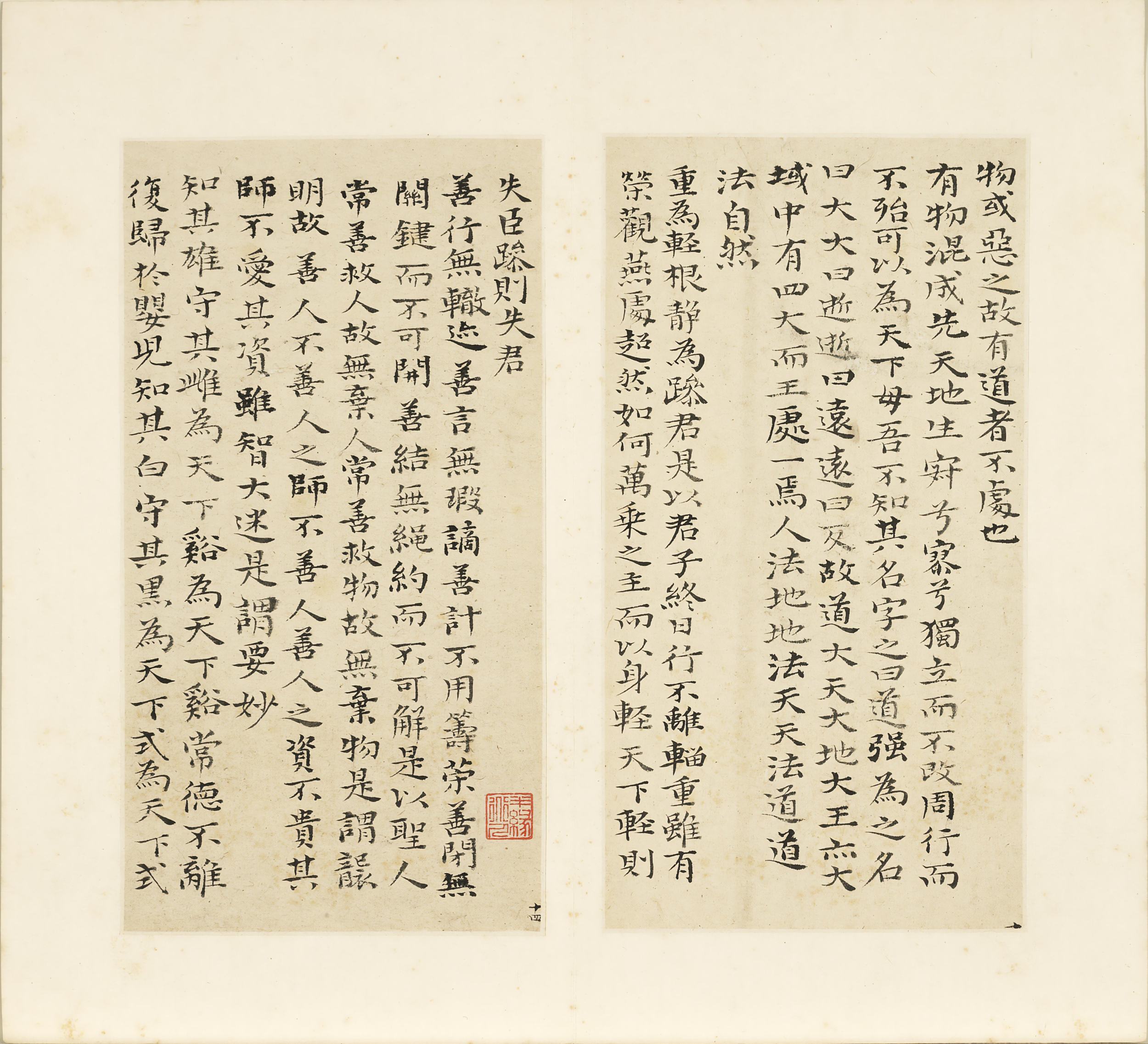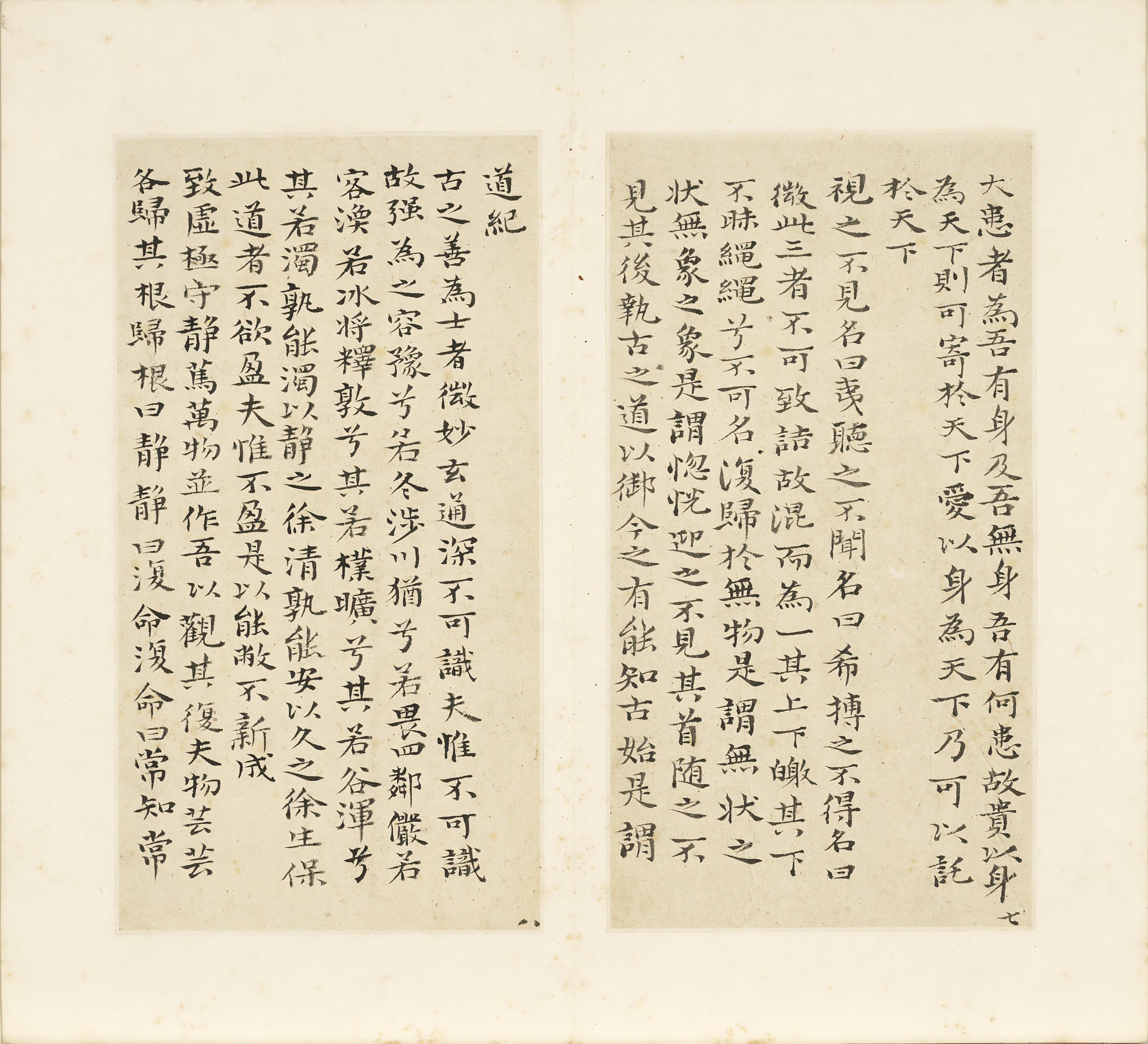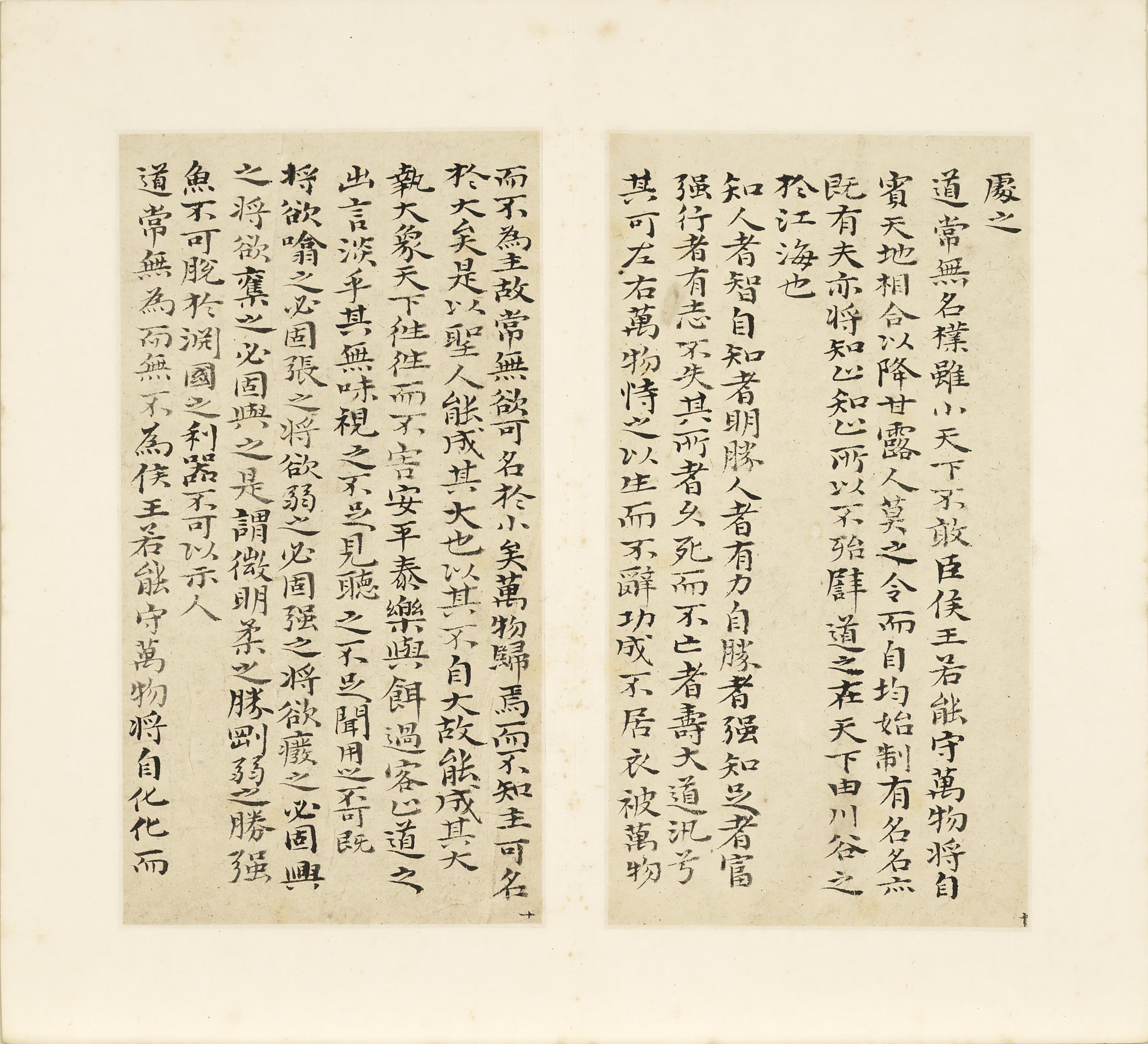 此《道德经》册由明末清初石涛书。全册共二十六开(正文二十开),正文以精笔小楷书就,凡五千余字。其书笔致从容,章法若有节奏,体势似法非法,意境清新冷逸,颇具魏晋人风致。前附罗聘临石涛种松图,翁方纲题跋五则。此册为翁方纲(苏斋)旧藏,现藏于台北故宫博物院。