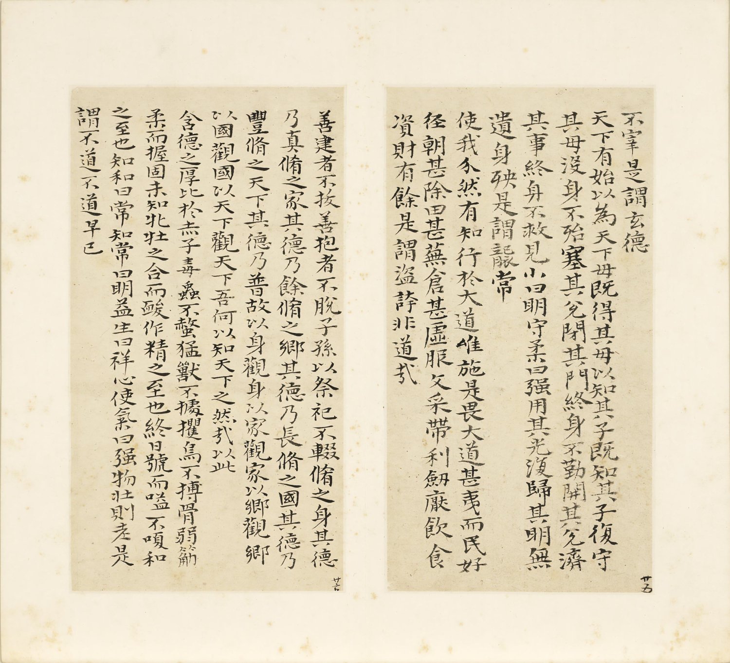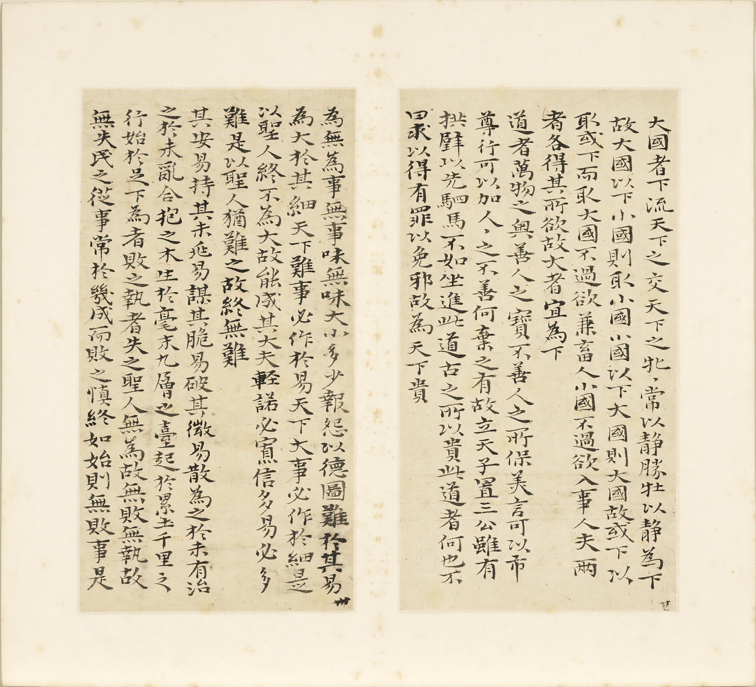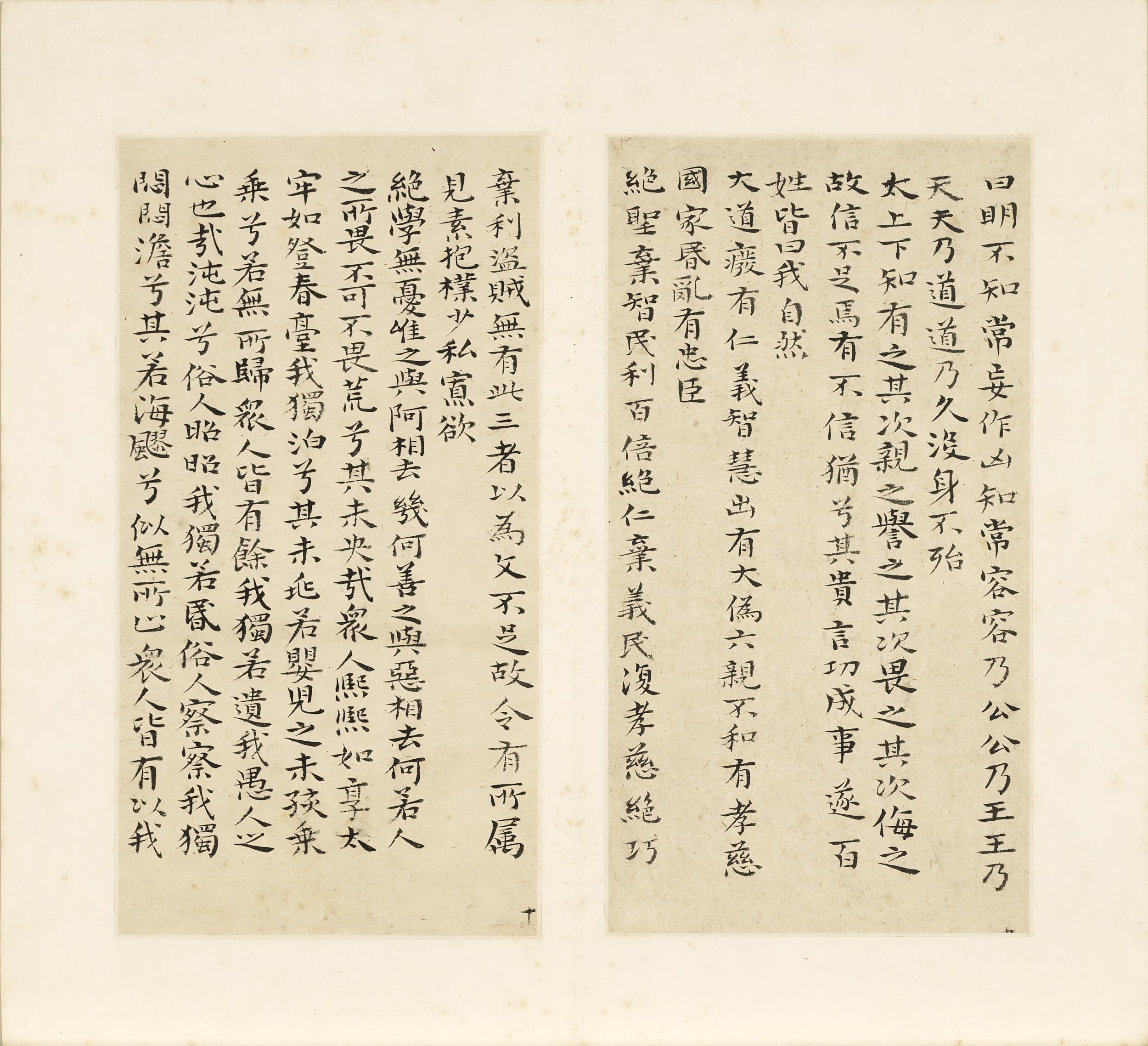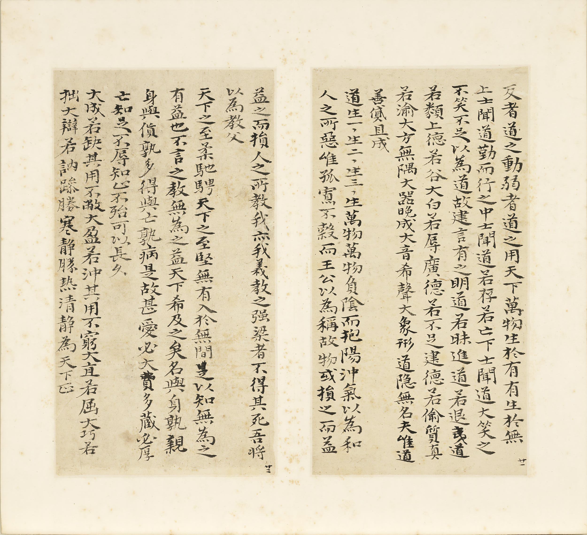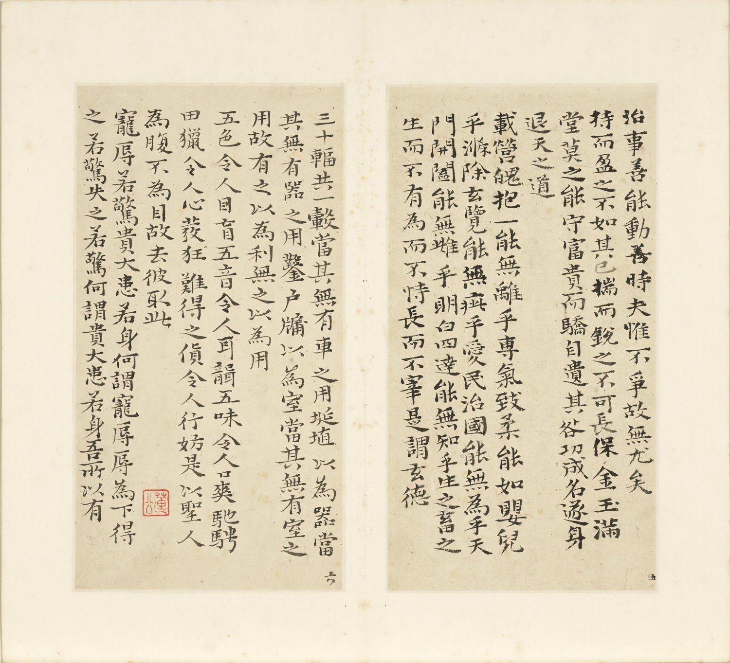 此《道德经》册由明末清初石涛书。全册共二十六开(正文二十开),正文以精笔小楷书就,凡五千余字。其书笔致从容,章法若有节奏,体势似法非法,意境清新冷逸,颇具魏晋人风致。前附罗聘临石涛种松图,翁方纲题跋五则。此册为翁方纲(苏斋)旧藏,现藏于台北故宫博物院。