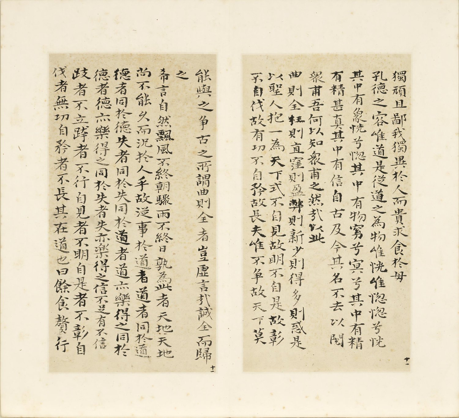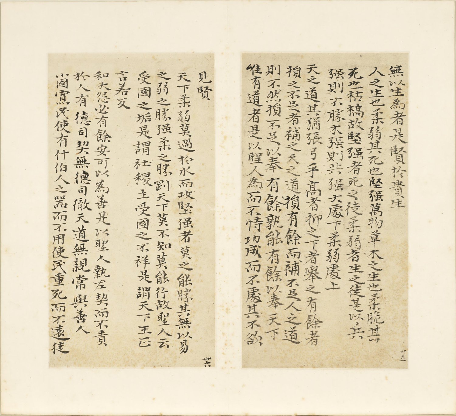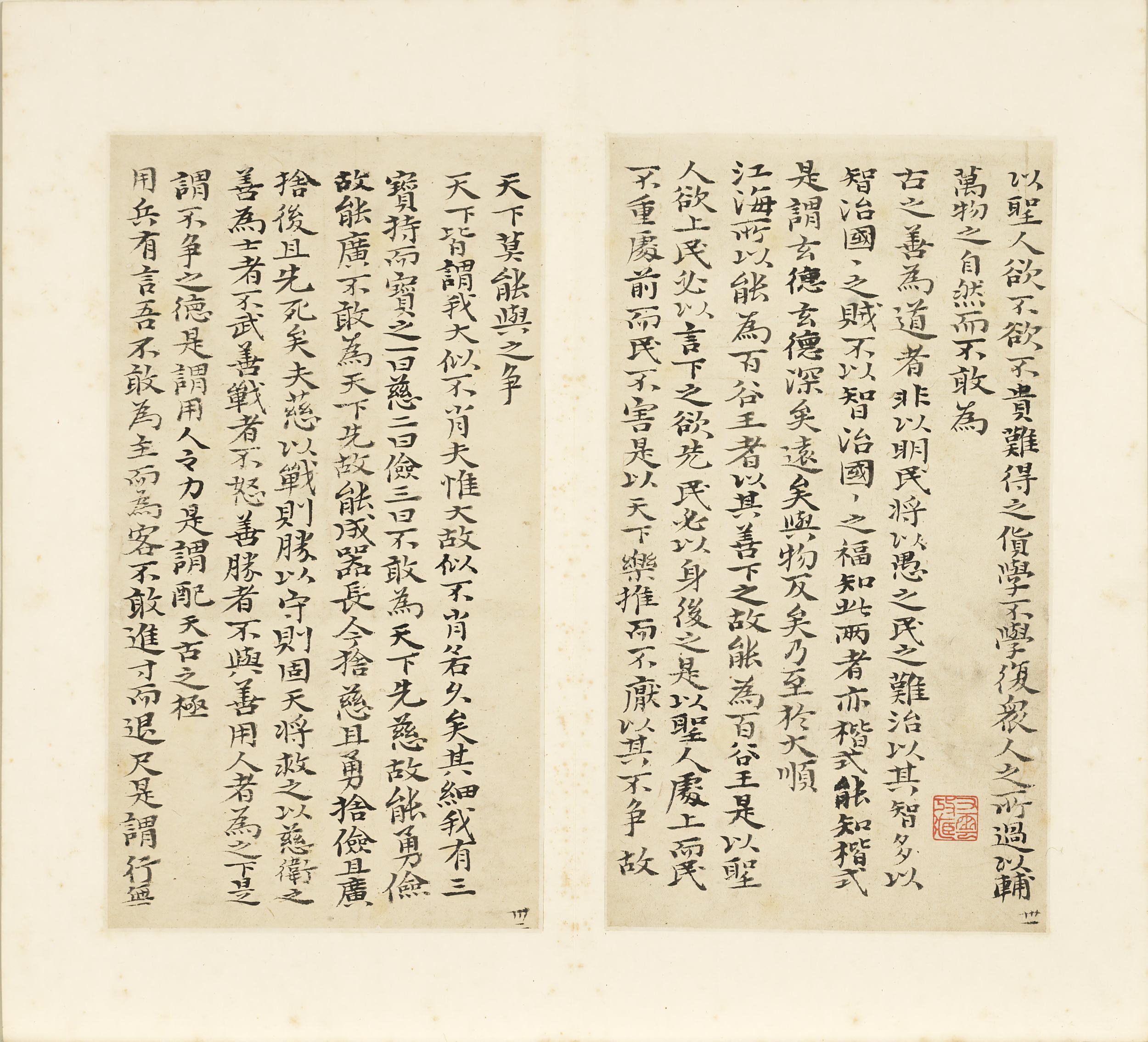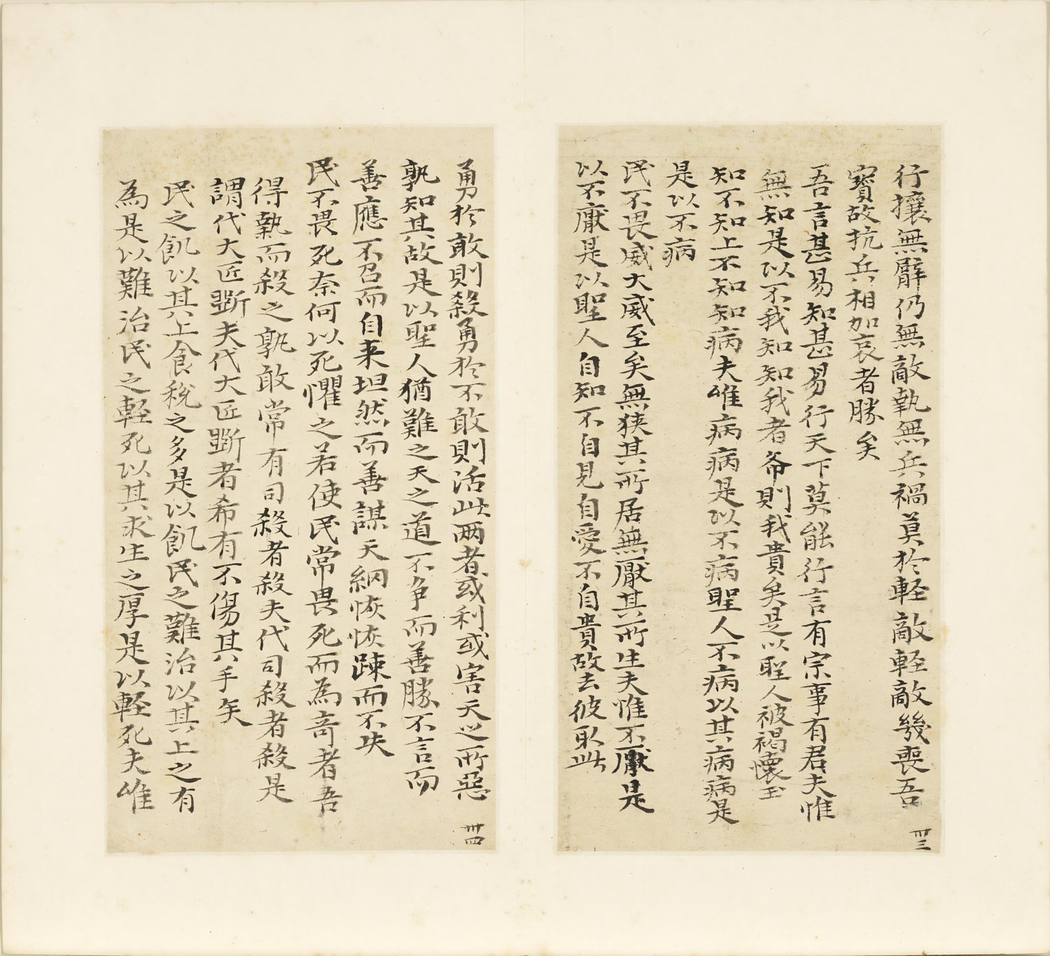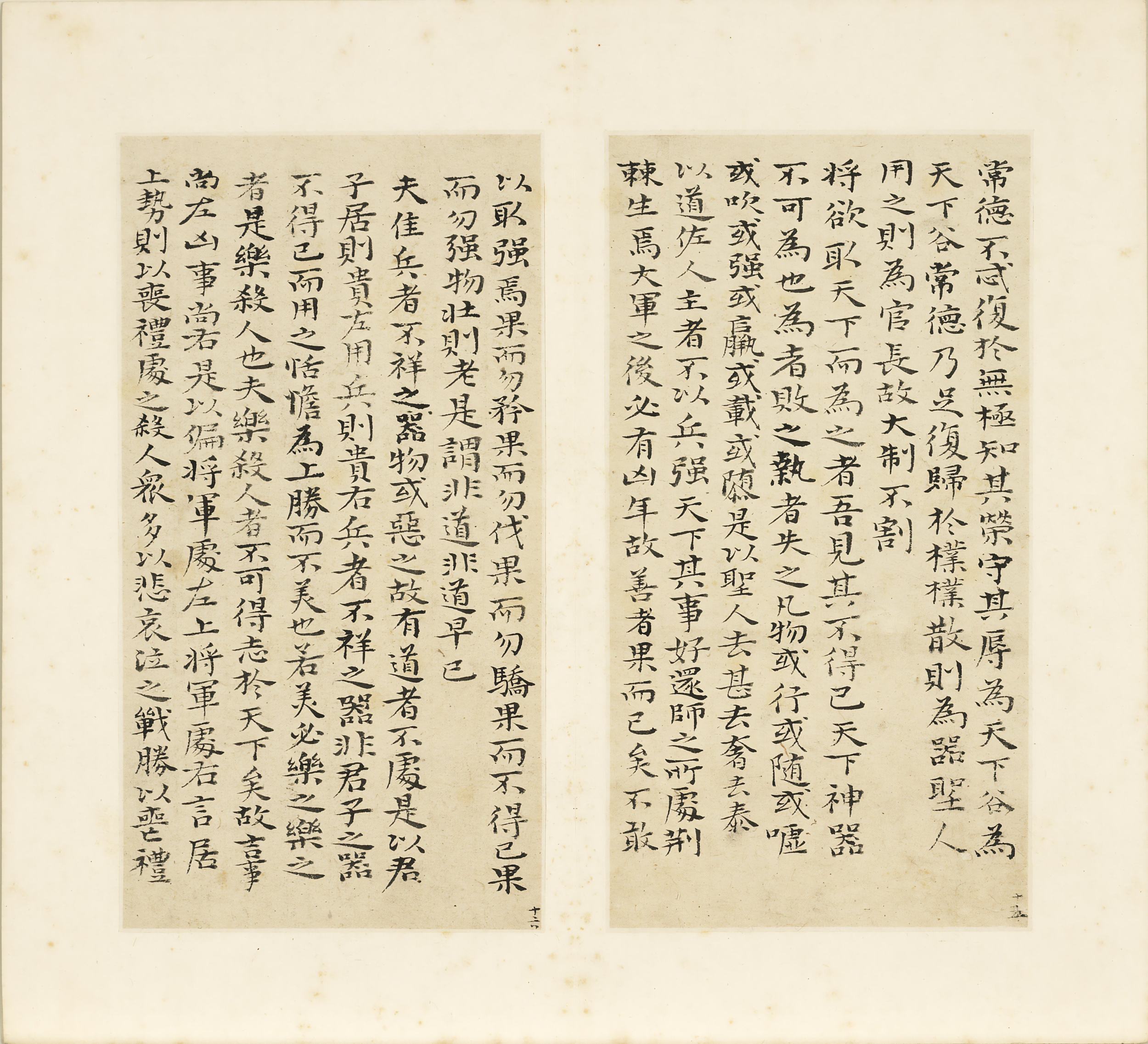 此《道德经》册由明末清初石涛书。全册共二十六开(正文二十开),正文以精笔小楷书就,凡五千余字。其书笔致从容,章法若有节奏,体势似法非法,意境清新冷逸,颇具魏晋人风致。前附罗聘临石涛种松图,翁方纲题跋五则。此册为翁方纲(苏斋)旧藏,现藏于台北故宫博物院。