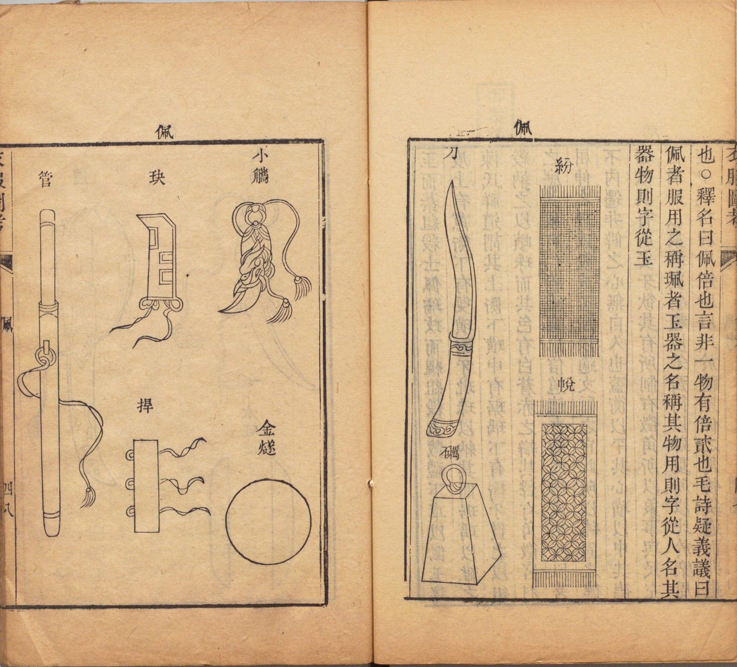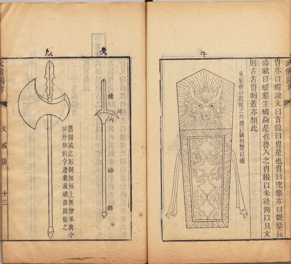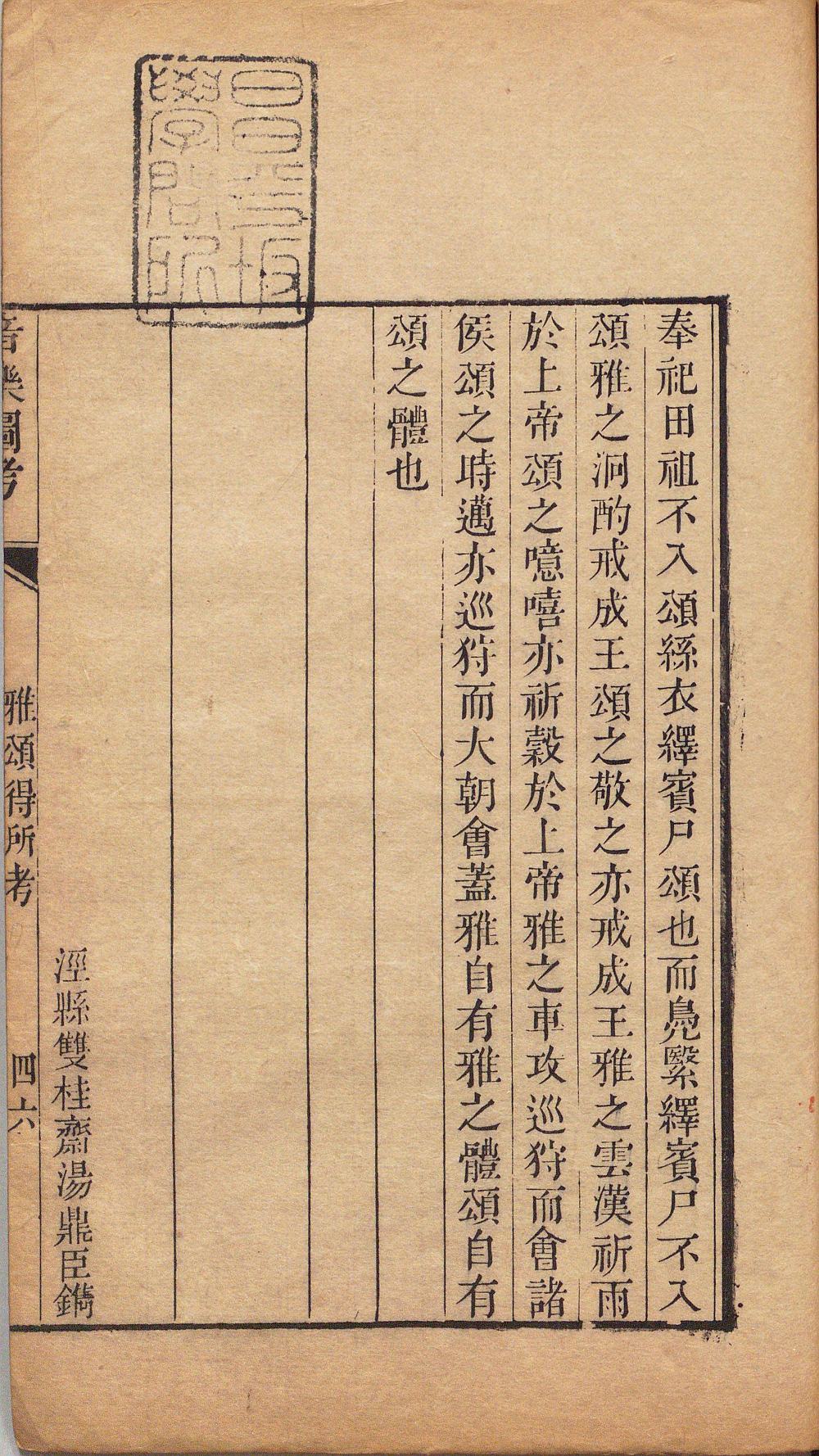 此《四书图考》由清代杜炳辑。全书包含:天文、地舆、宗庙、朝聘、礼射、冠昏、音乐、典籍、井田、武备、宫室、器用、衣服图考,共十三卷。此书仿江永《乡党图考》,对《论语》《孟子》《大学》《中庸》广其义例,先配以图画,后证以记载。此为清道光九年刊本。