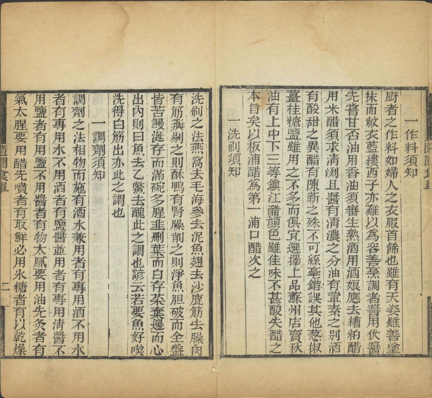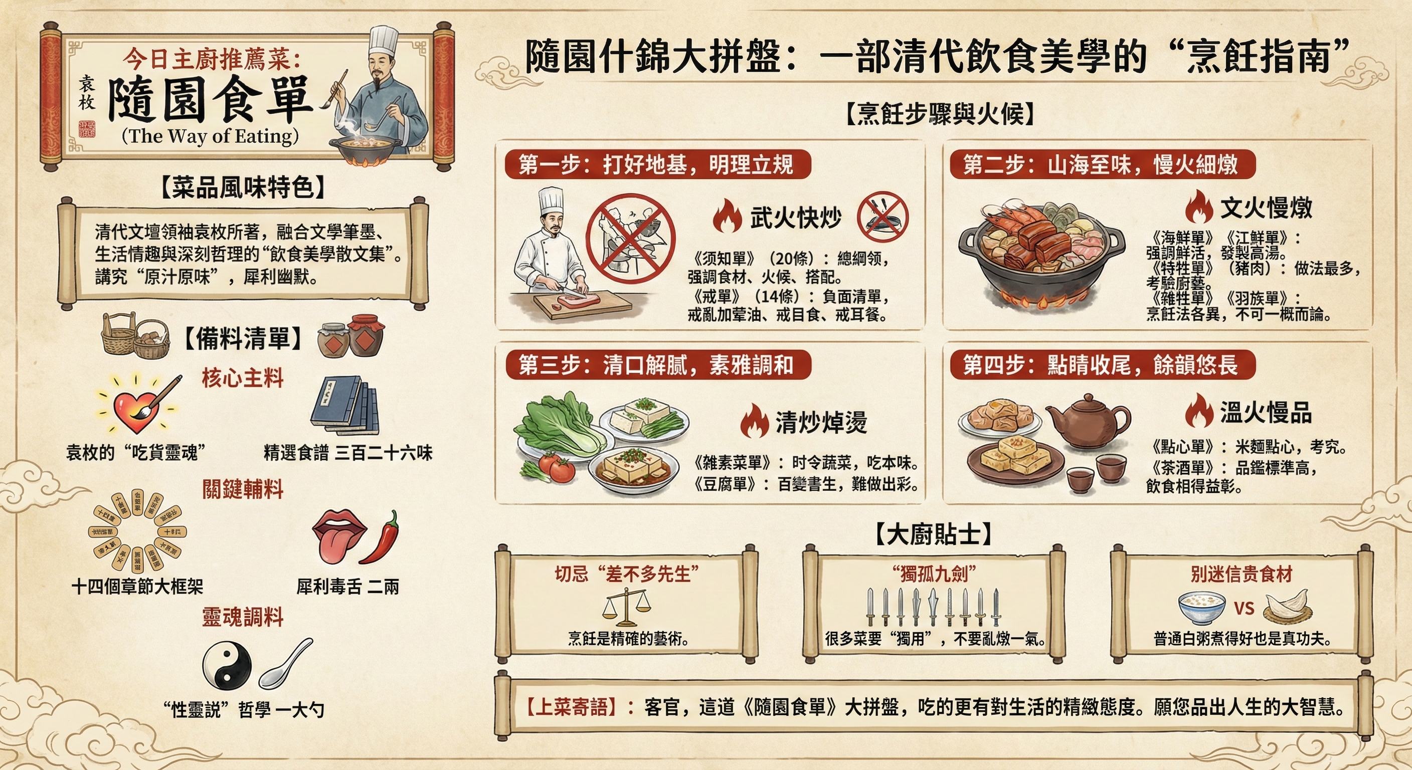 须知单:共列二十条准则,系统阐述了烹饪的全过程管理。内容涵盖食材甄选(先天)、预处理(洗刷)、刀工、调味(作料)、火候掌控、器具搭配、上菜顺序(上菜)等。