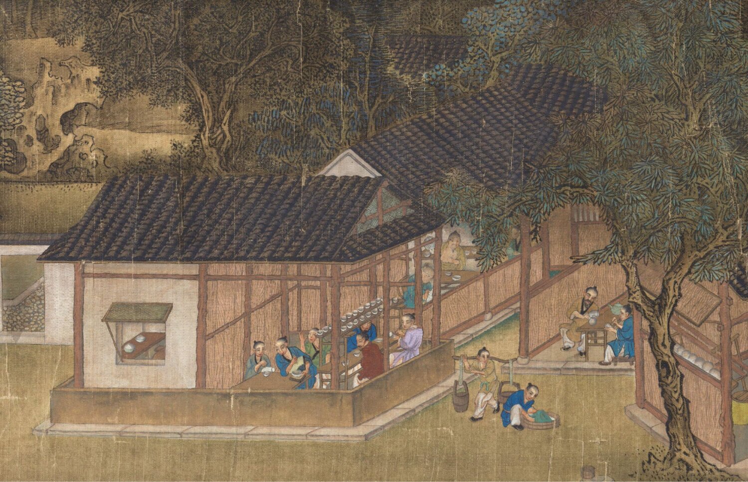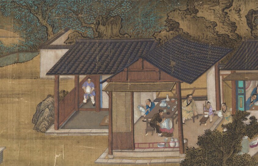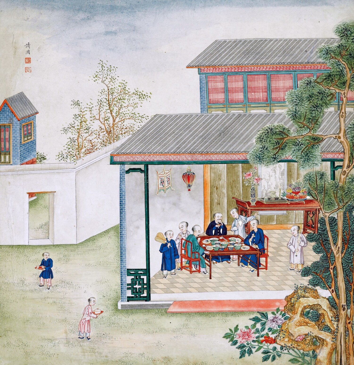 请酒:图中行商设宴招待粤商。屋内布置不乏当地出产的彩瓷,包括宴桌上的碗盘、案上花瓶及大盘。