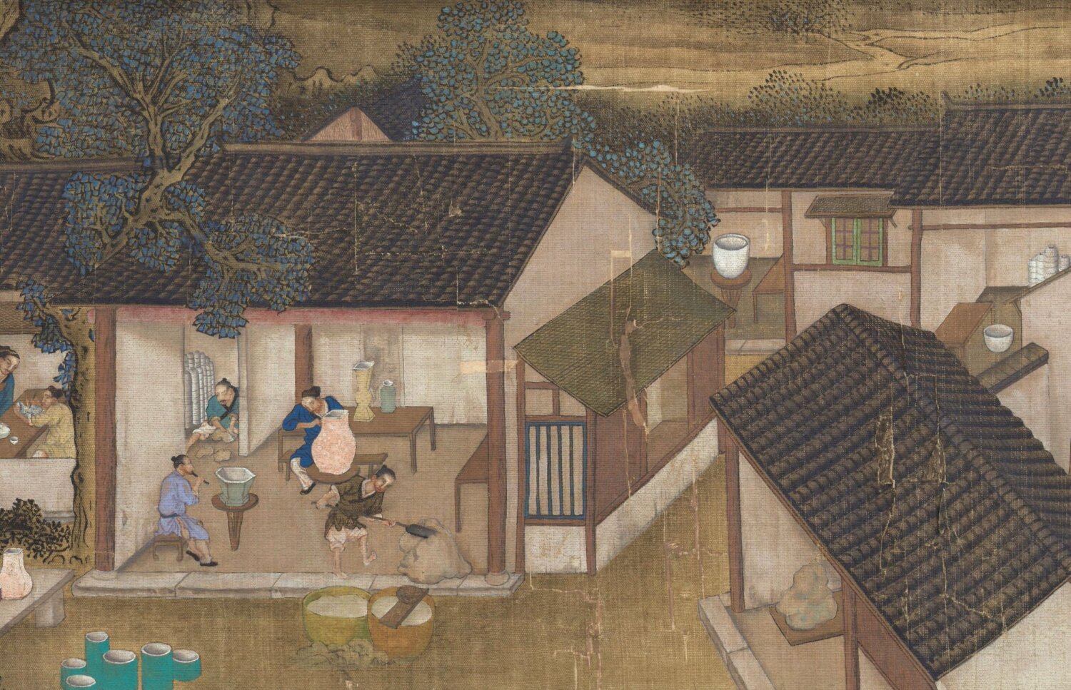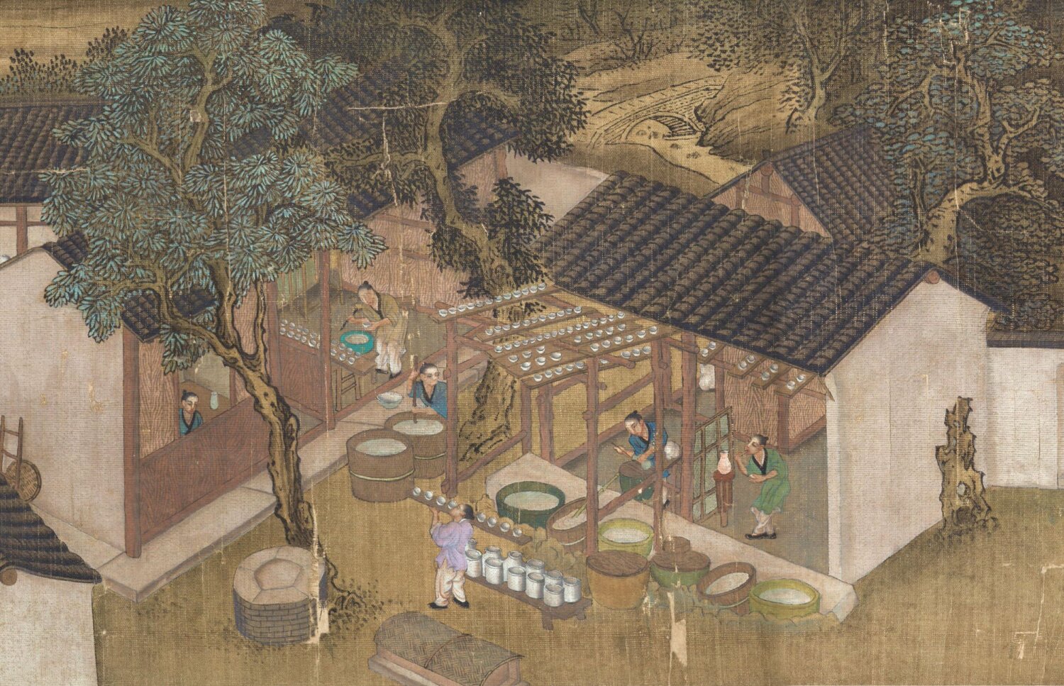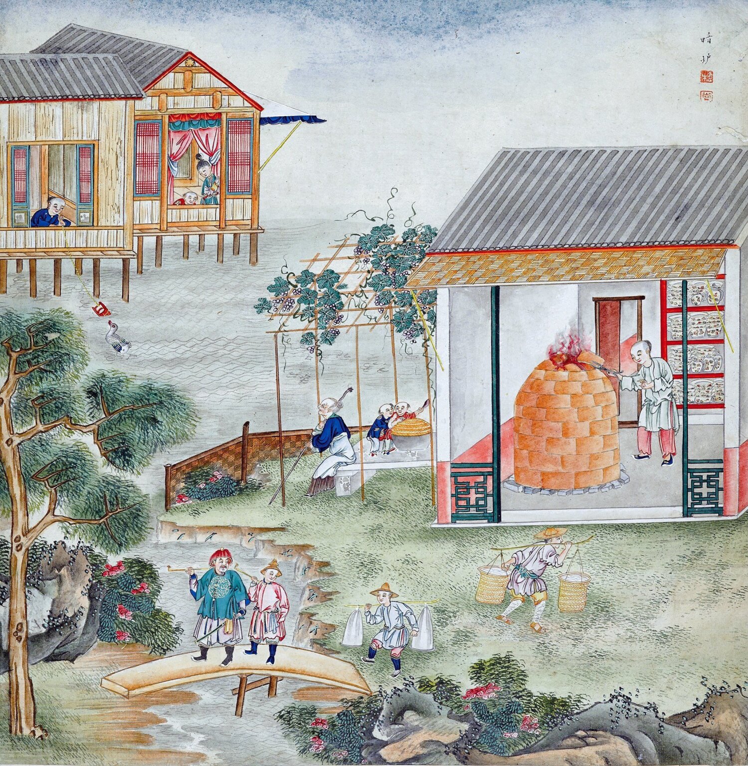 装桶:图中除了装桶工人外,可见管工在旁核对货单,另有工人在桶外书写商号。茶壶等西方风格的瓷器为主要出口货,当时民间也作日常用具,可见于屋内案上一例。