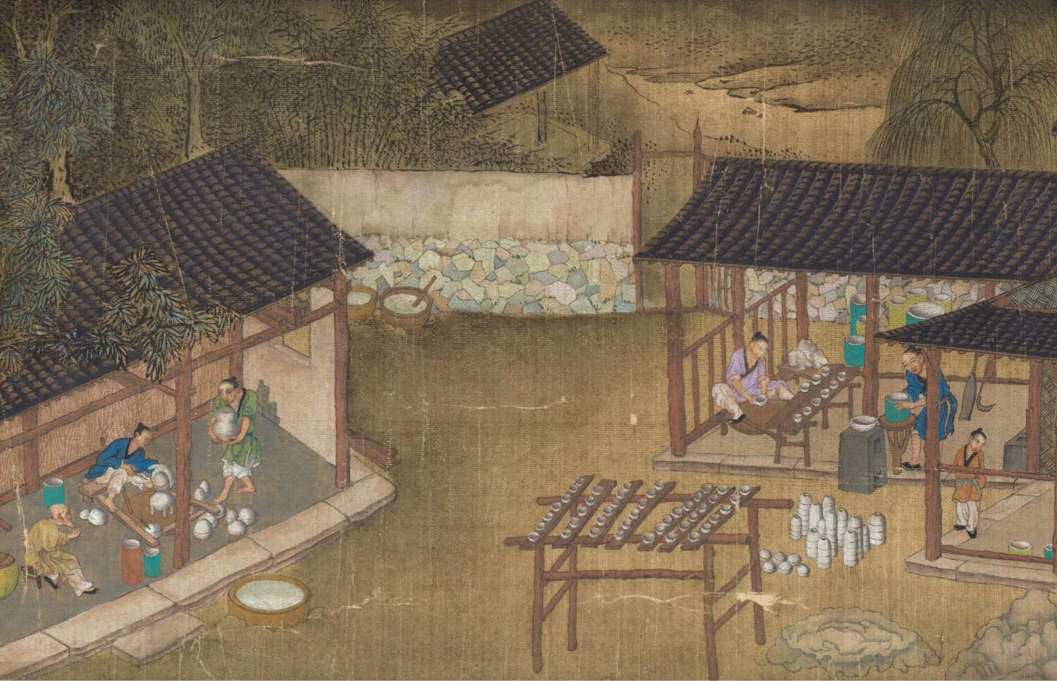 修胎:图中泥坯正待晒干。棚内修坯匠用轮车以小刀修削器表,棚外挑夫肩担一板条的泥坯。