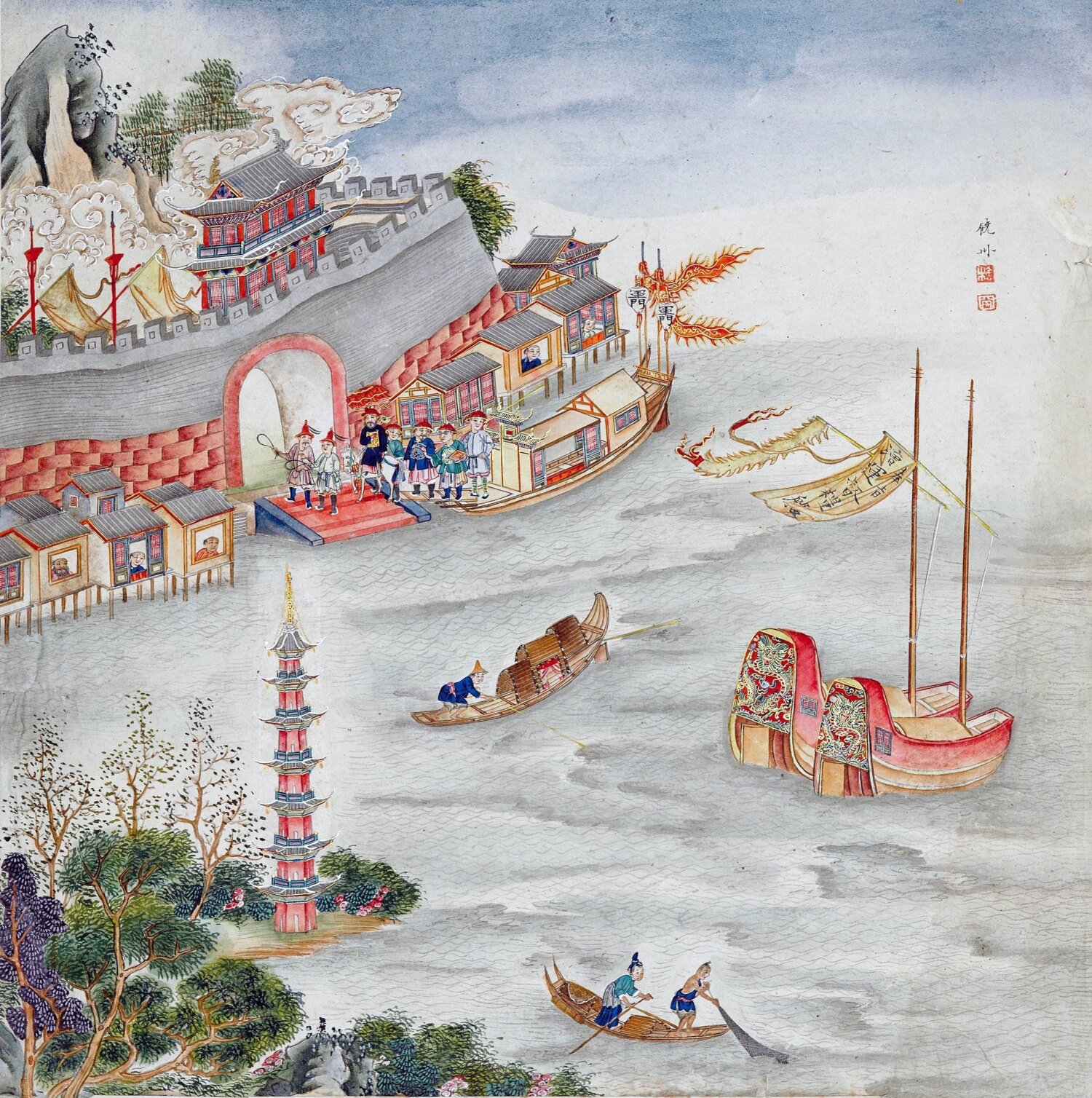 饶州:本组画以 “饶州” 为题而揭开序幕,画面描绘官员乘船沿昌江抵达景德镇。图中所见红塔地标,建于北宋初年。在旁的官方粮船悬挂著黄旗,负责征税。在漕运制度下,漕船(即粮船)从民间征收地租田赋,经水道解运京师。清代税收除以粮(米)缴纳外,亦有城砖、瓷器、布匹、棉花。