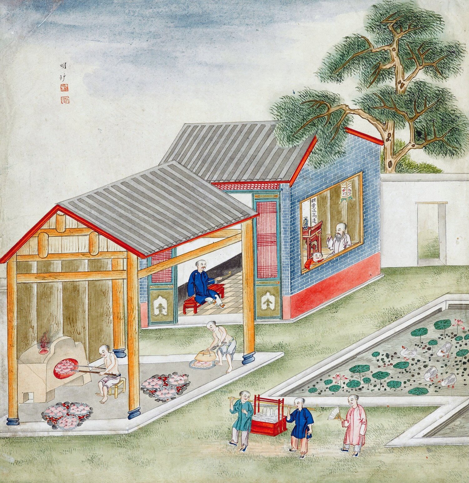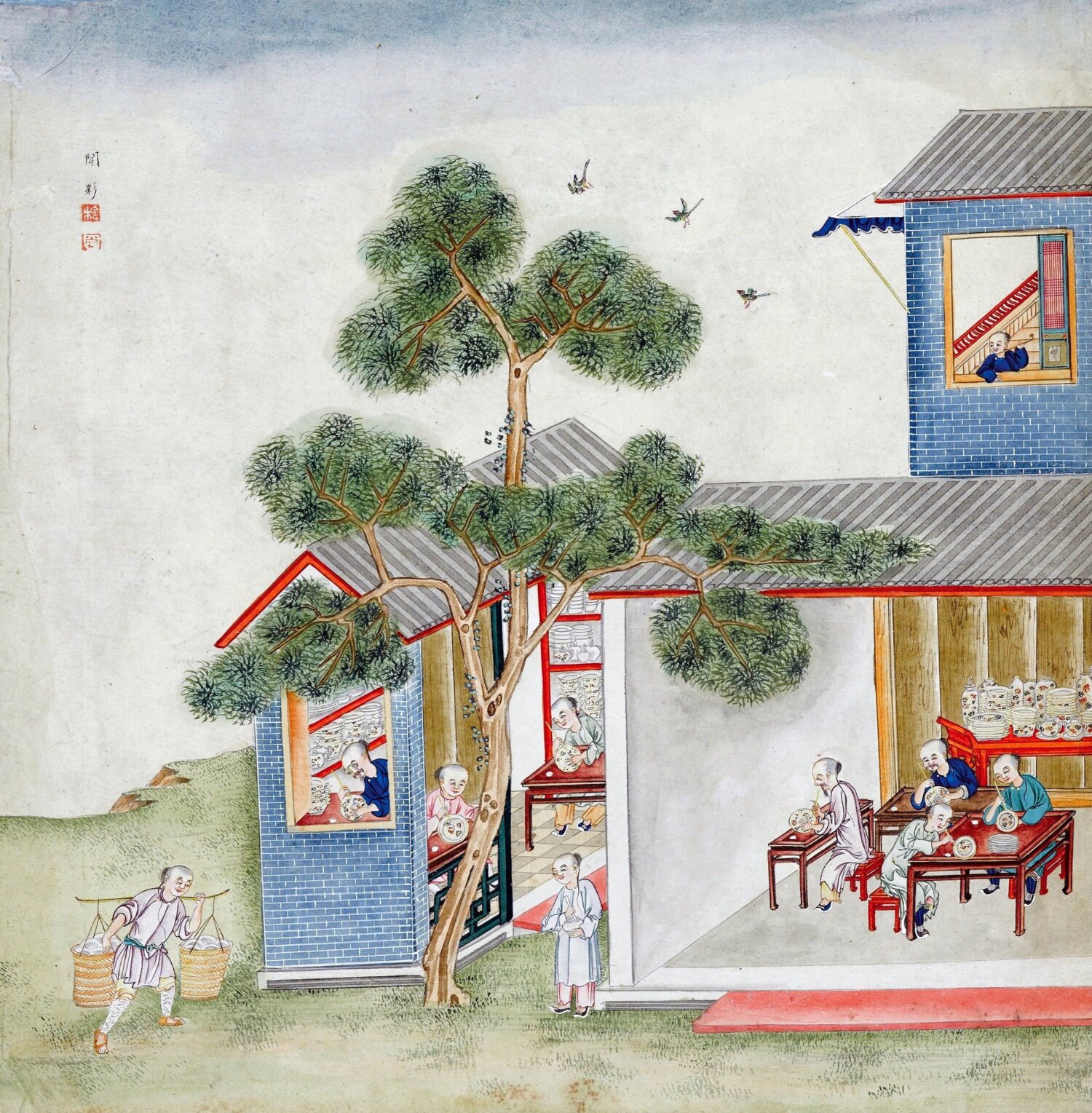 本组 34 幅制瓷连环画,以水彩绘成,为十八世纪清代景德镇制瓷工序的难得纪录。这类画专为外销西方市场,一贯形象化地说明中国文化的各种面貌。各图详细显示陶匠分工、官窑及外销瓷器的制运,以及广州夷商的活动。中国外销画起源于广州的画室,当地外国商人(夷商)云集,形成中国工艺品活跃的交易市场,随后外销画画室亦于香港兴起。