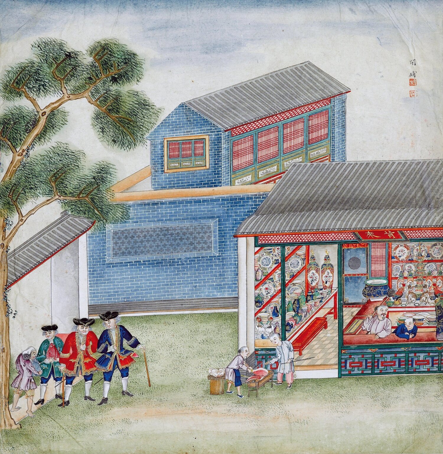 开铺:图中所见欧洲人手持两袋货币到中国瓷商购货,很可能就是十八世纪后期的国际货币西班牙银元。