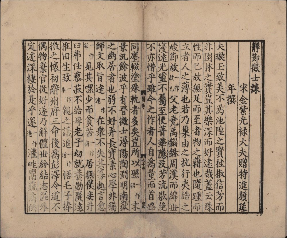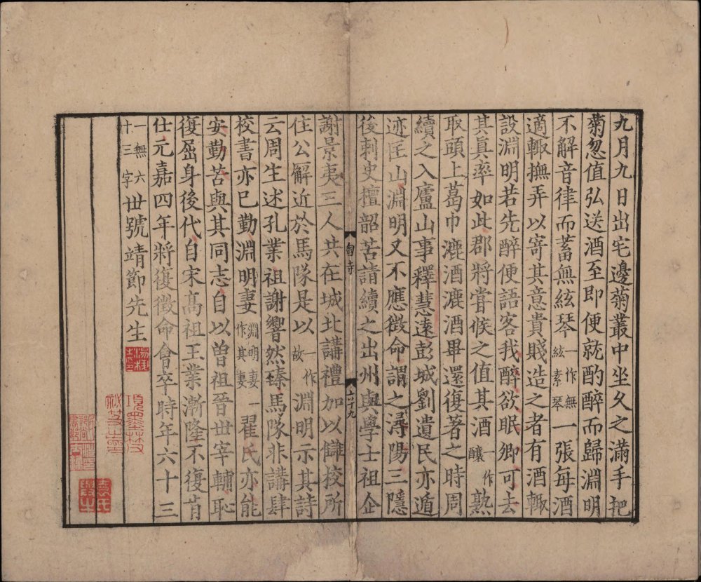 曾集本虽诗文合编,却不分卷次。今人以曾集本诗在前,文在后。杂文没有收一般认为是伪作 [1] 刻书者曾集时任南康军知军,因陶渊明故里栗里、上京皆属辖区,遂以 “邦无陶集为耻”,特删宋庠十卷本《五孝传》《四八目》等伪托篇目。 的《五孝传》、《四八目》,但连《扇上画赞》和《读史述》也没有收入,不知何故。此本版式疏朗,典型南宋江西官刻风范。由明至清,经项元汴、汪士钟、瞿镛等大藏书家珍藏,视为重宝。今藏中国国家图书馆。 (介绍参考:《中華再造善本總目提要》)
