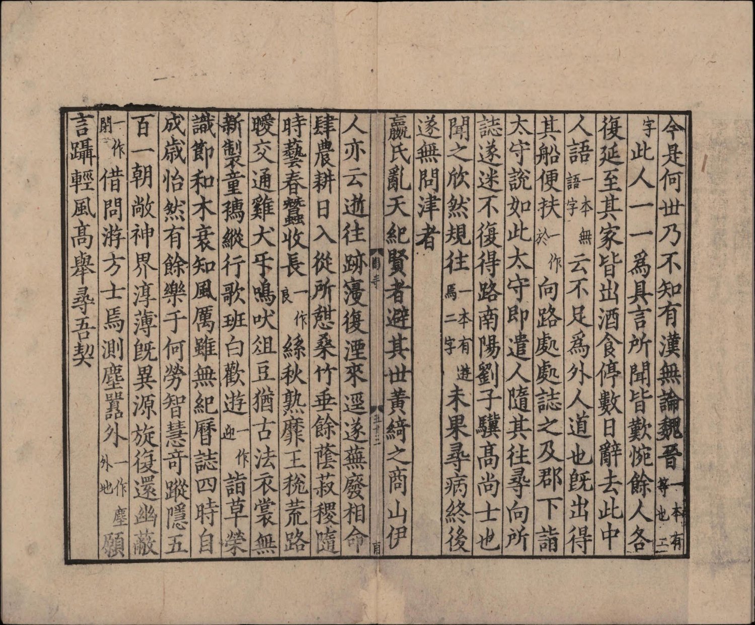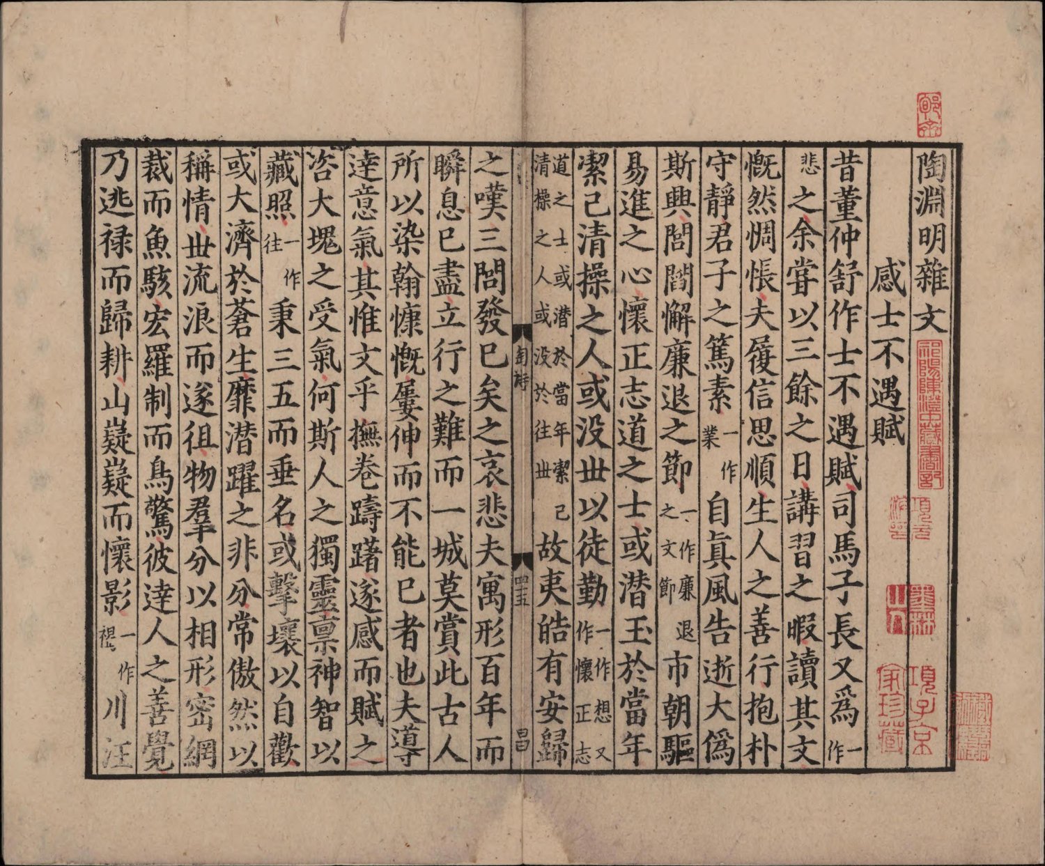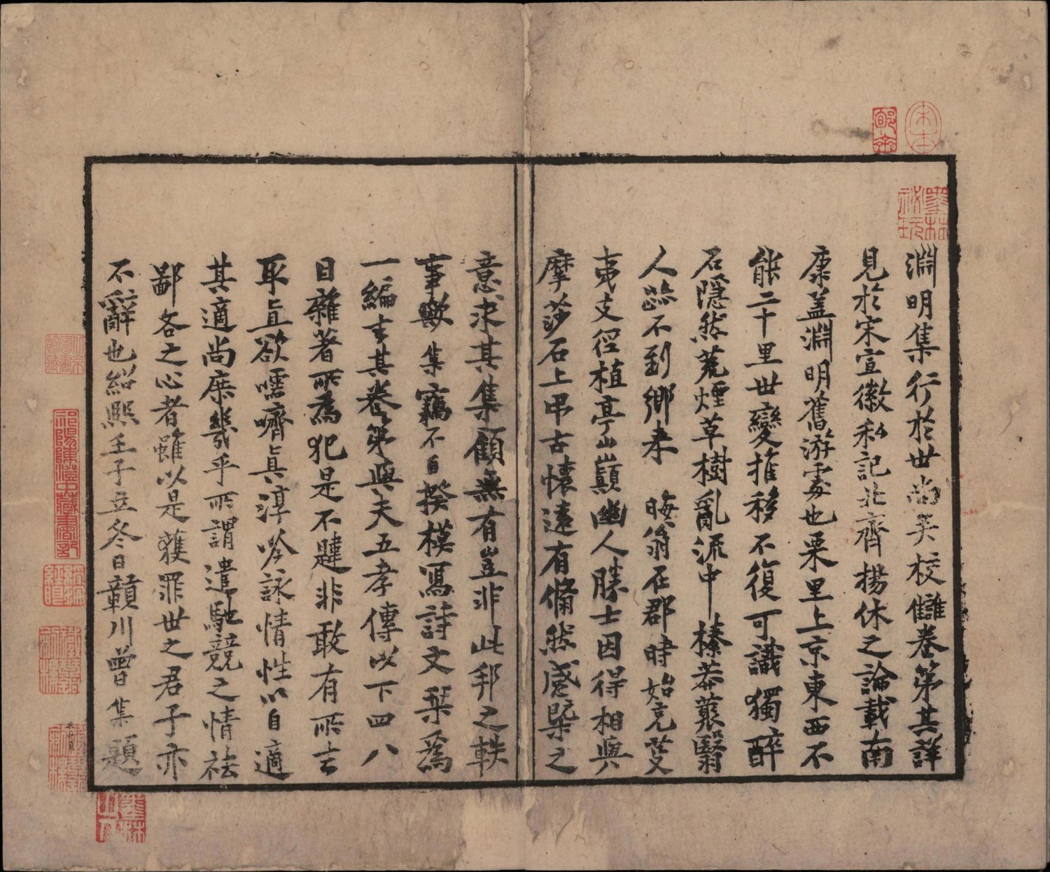 曾集本虽诗文合编,却不分卷次。今人以曾集本诗在前,文在后。杂文没有收一般认为是伪作 [1] 刻书者曾集时任南康军知军,因陶渊明故里栗里、上京皆属辖区,遂以 “邦无陶集为耻”,特删宋庠十卷本《五孝传》《四八目》等伪托篇目。 的《五孝传》、《四八目》,但连《扇上画赞》和《读史述》也没有收入,不知何故。此本版式疏朗,典型南宋江西官刻风范。由明至清,经项元汴、汪士钟、瞿镛等大藏书家珍藏,视为重宝。今藏中国国家图书馆。 (介绍参考:《中華再造善本總目提要》)
