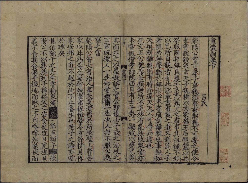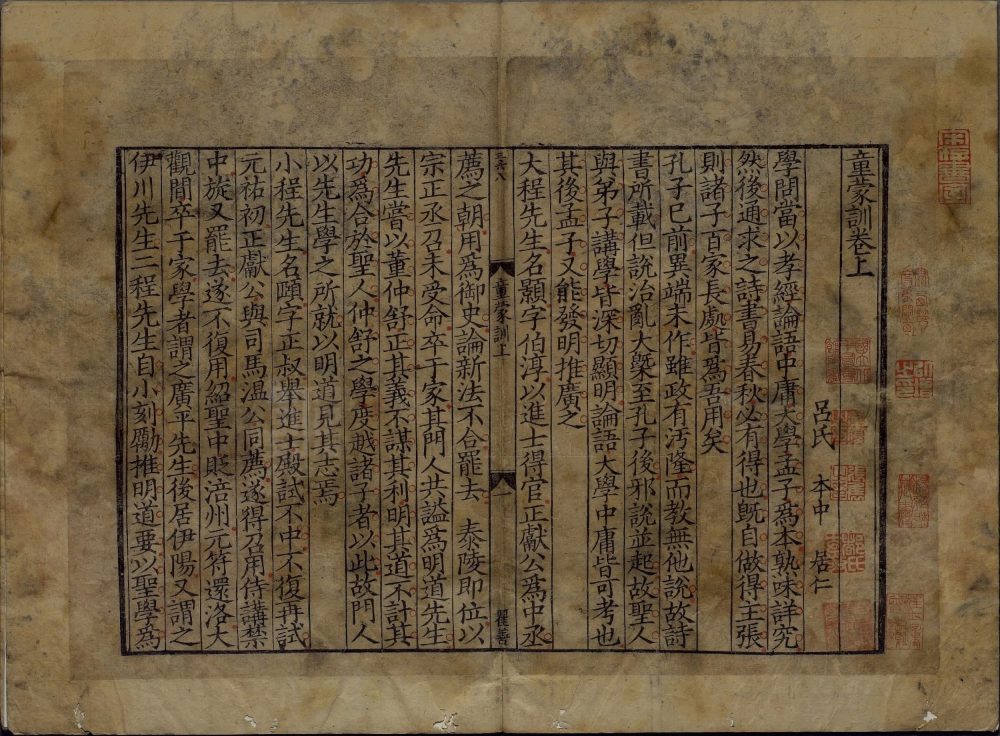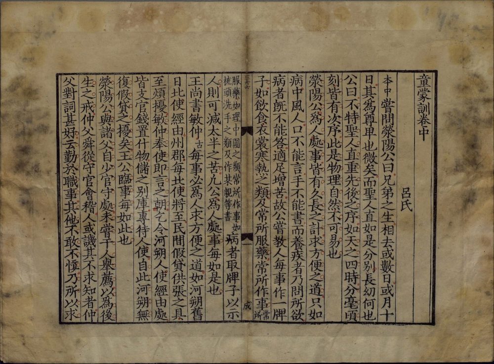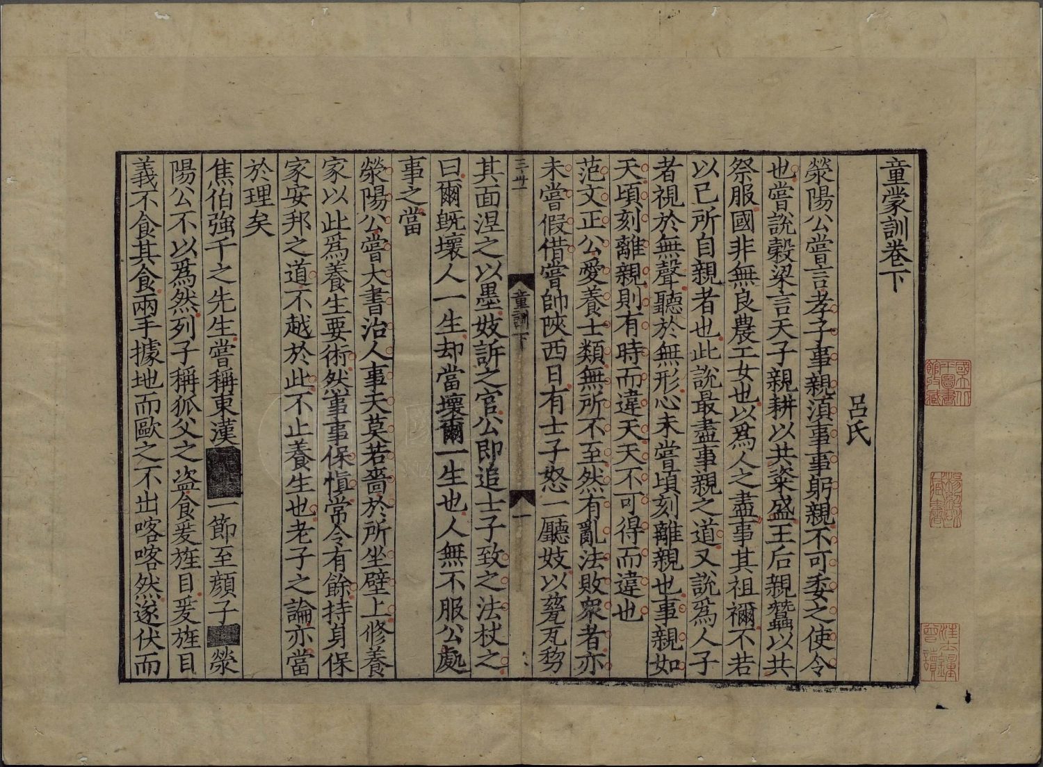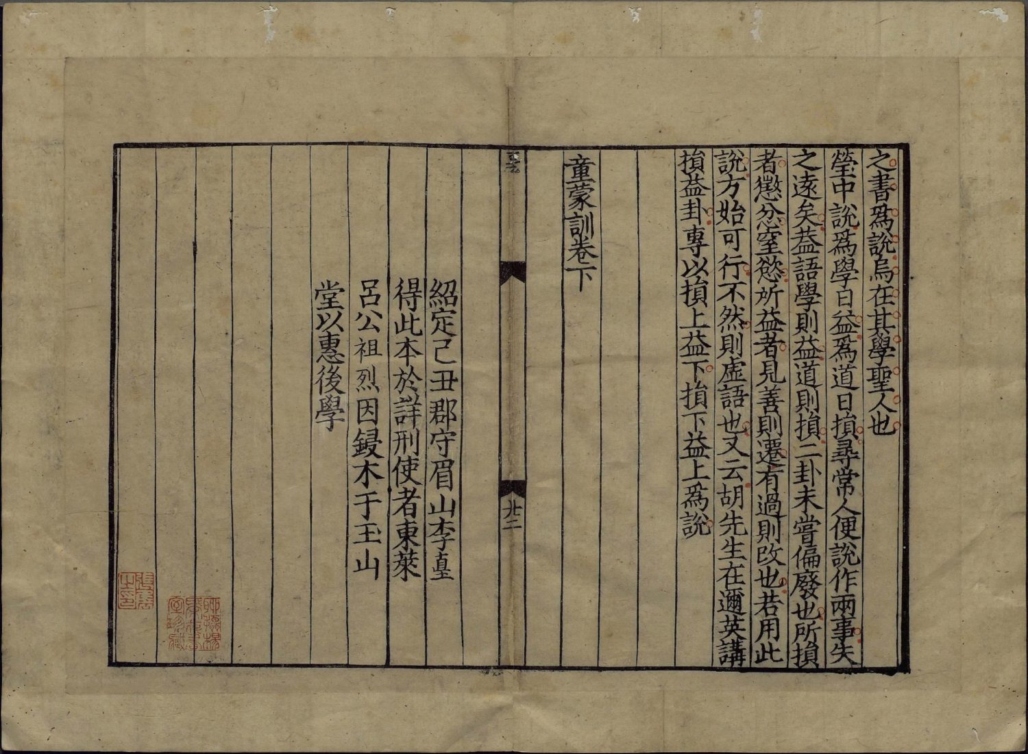 此《童蒙训》由宋代吕本中撰。全书分作上中下三卷,采用语录体,内容取大儒名言、述根本经训、集师友杂说,多关立身、行己、读书、取友、抚世、酬物,仕州县、立朝廷,纲条本末等正论格言。这是其家塾训课本之一,侧重伦理道德教化。此为南宋绍定二年李埴寿州刊本。