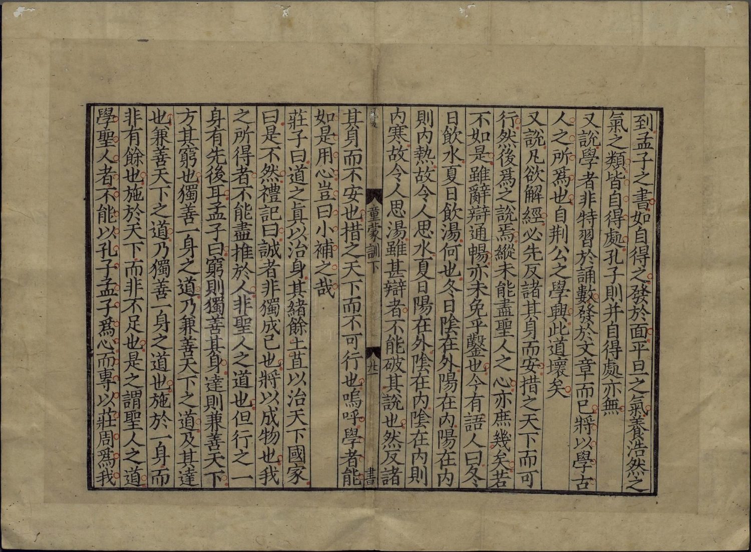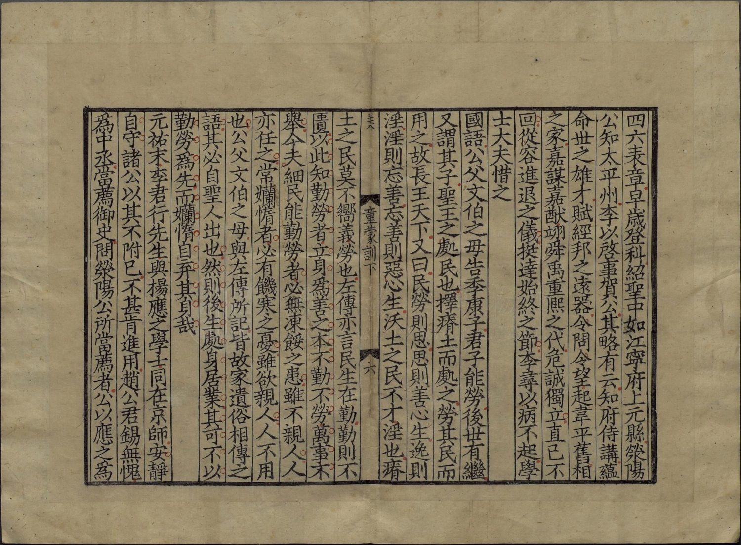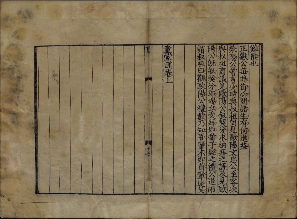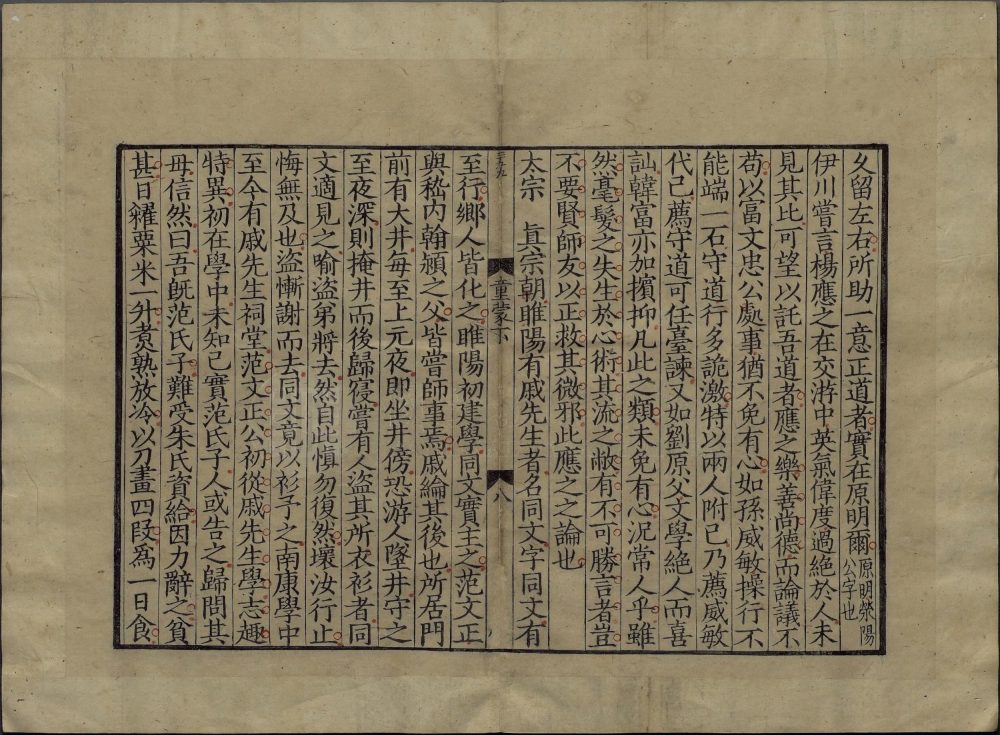 二册,蝴蝶装。半叶框 22.2x16 厘米,十行行二十字(小字双行,字数同)左右双栏,白口双黑鱼尾(间有单黑鱼尾)。书口记字数,上鱼尾下记「童蒙訓」或「童訓」或「童蒙」上、中、下,下鱼尾下记叶次。版心下偶记刻工名。