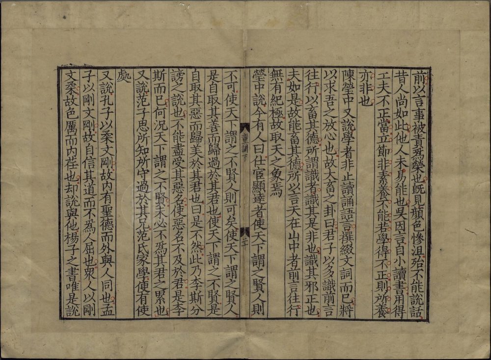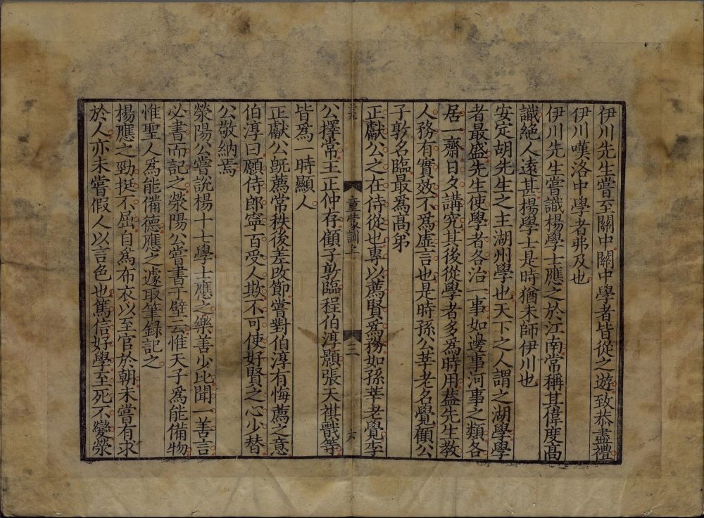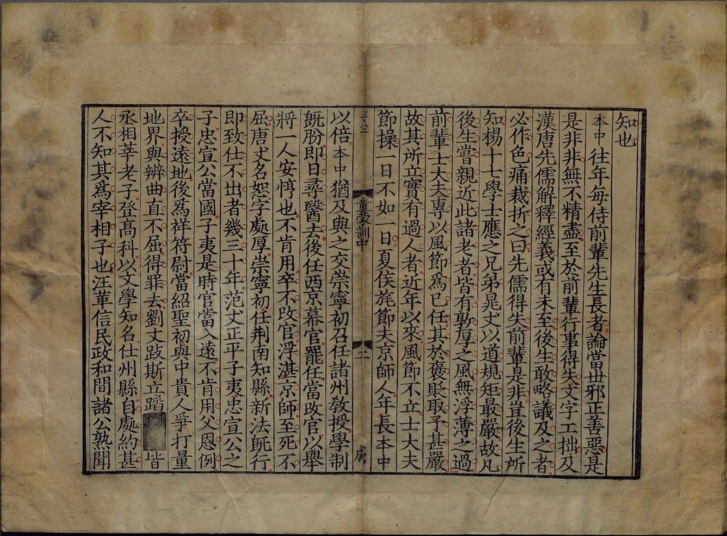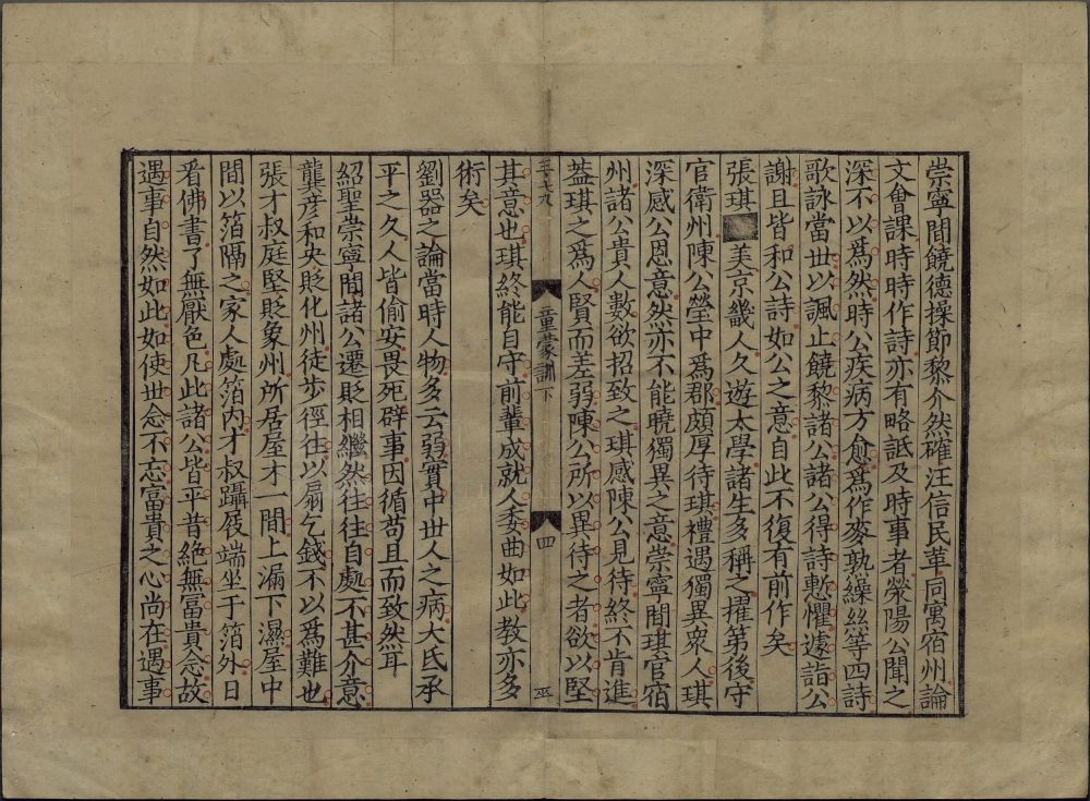 二册,蝴蝶装。半叶框 22.2x16 厘米,十行行二十字(小字双行,字数同)左右双栏,白口双黑鱼尾(间有单黑鱼尾)。书口记字数,上鱼尾下记「童蒙訓」或「童訓」或「童蒙」上、中、下,下鱼尾下记叶次。版心下偶记刻工名。