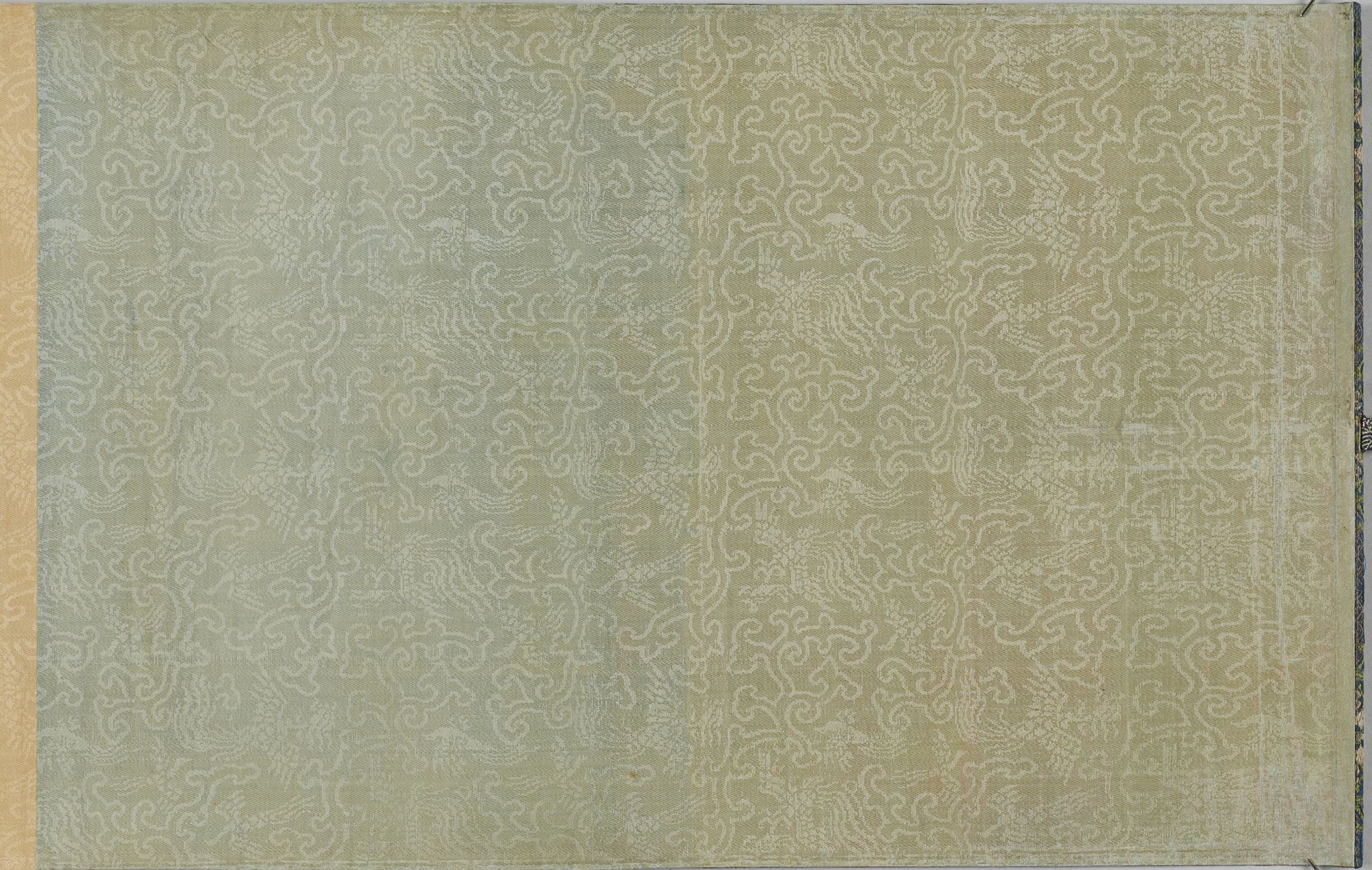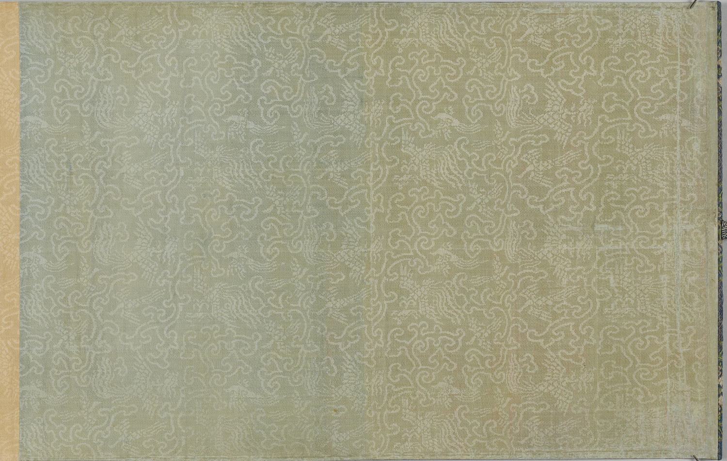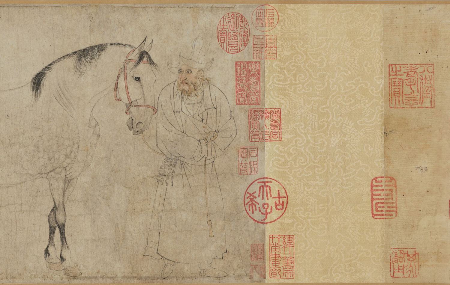 第五组:马的全身以浅色为主,历面,肩、背、胸、腹、臀、腿均有暗淡花纹,除络头外还戴衔、镳。前有汉人手持马鞭,作驯马状。无题款。