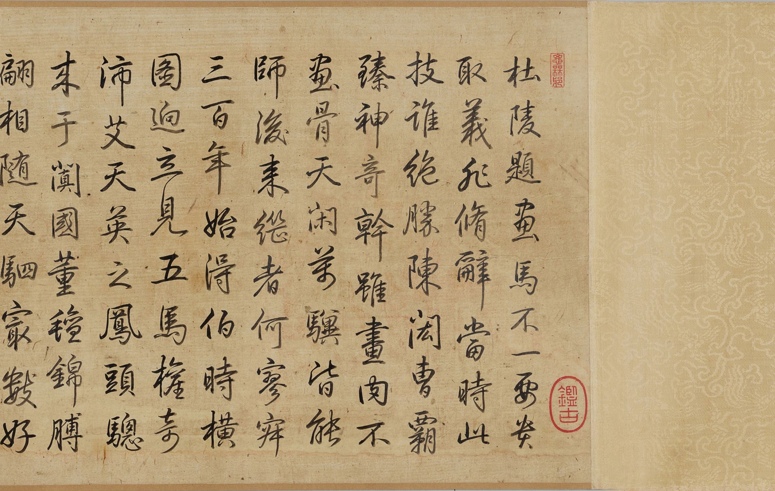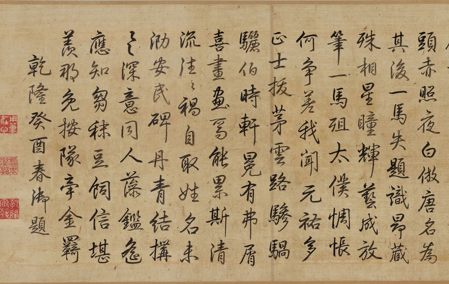 杜陵題畫馬不一,要貴取義非修辭。當時此技誰絕勝,陳閎曹霸臻神奇。幹雖畫肉不畫骨,天閒萬驥皆能師。後來繼者何寥寂,三百年始得伯時。橫圖迥立見五馬,權奇沛艾天英之。鳳頭驄來于闐國,董氈錦膊翩相隨。天駟最數好頭赤,照夜白仿唐名為。其後一馬失題識,昂藏殊相星瞳輝。藝成放筆一馬殂,太僕惆悵何爭差。我聞元祐多正士,拔茅雲路驂騧驪。伯時軒冕有弗屑,喜畫畫焉能累斯。清流往往禍自取,姓名未泐安民碑。丹青結搆有深意,同人藻鑒遙應知。芻秣豆飼信堪羨,那免按隊牽金羈。乾隆癸酉春。御題
