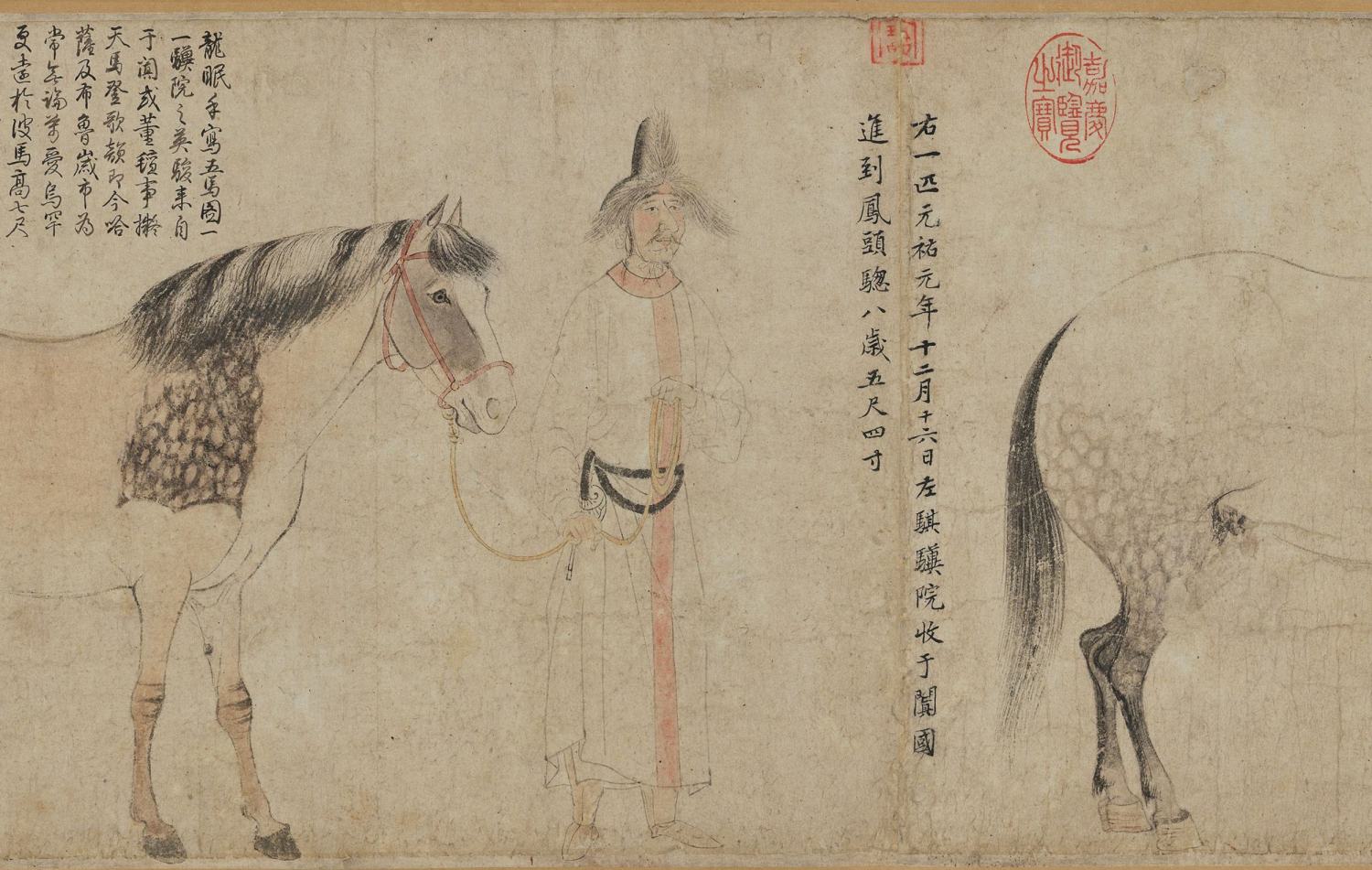 此《五马图》卷由北宋画家李公麟绘制。画卷描绘的是五匹精美的骏马,它们是当时西域献给朝廷的礼物。这五匹骏马分别是凤头骢、锦膊骢、好头赤、照夜白和满川花,每匹马都由奚官护持。前四匹马左侧有黄庭坚题笺,分别说明马的年龄、身高、进贡时间等信息。此卷现藏于东京国立博物馆。