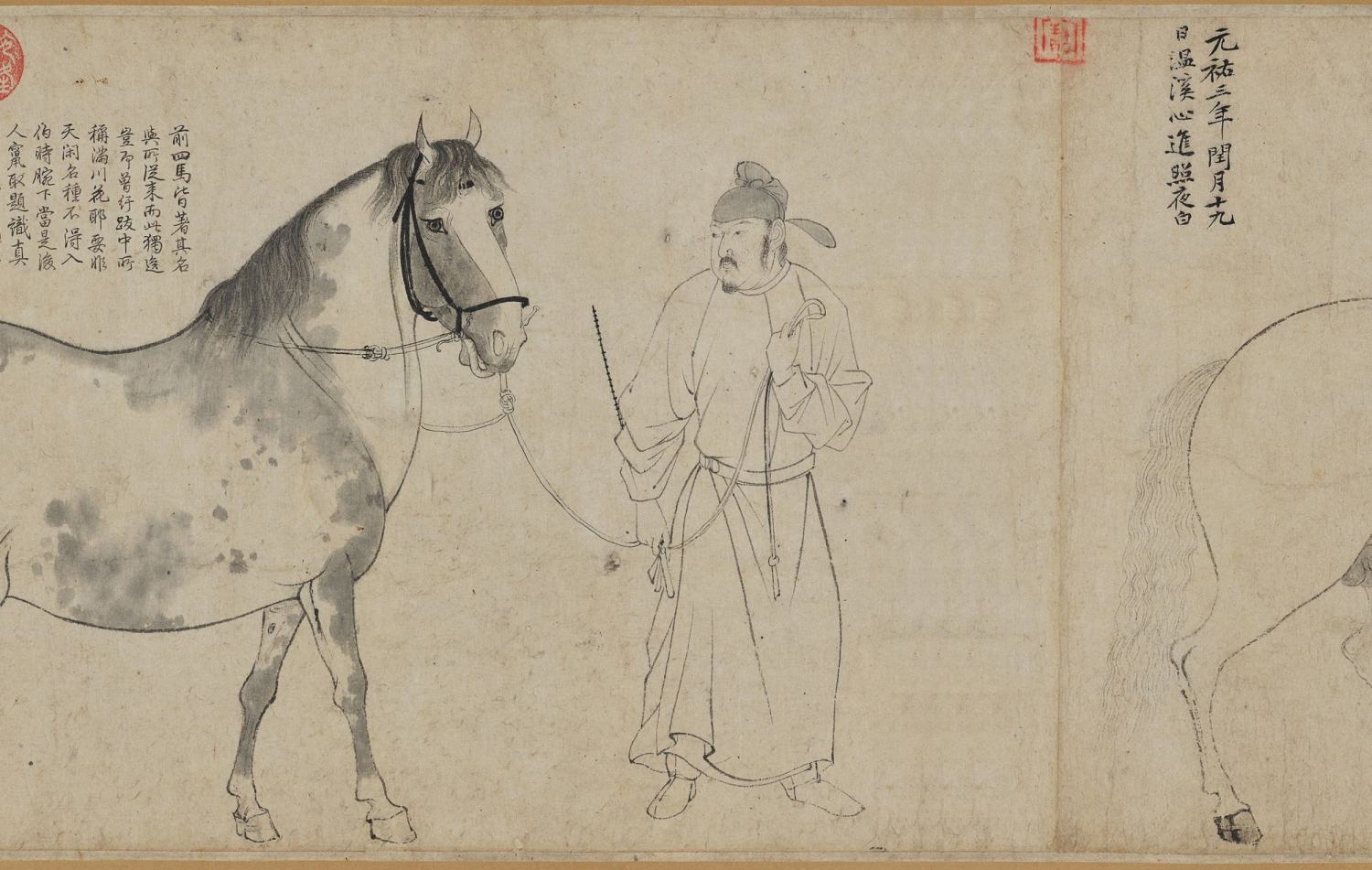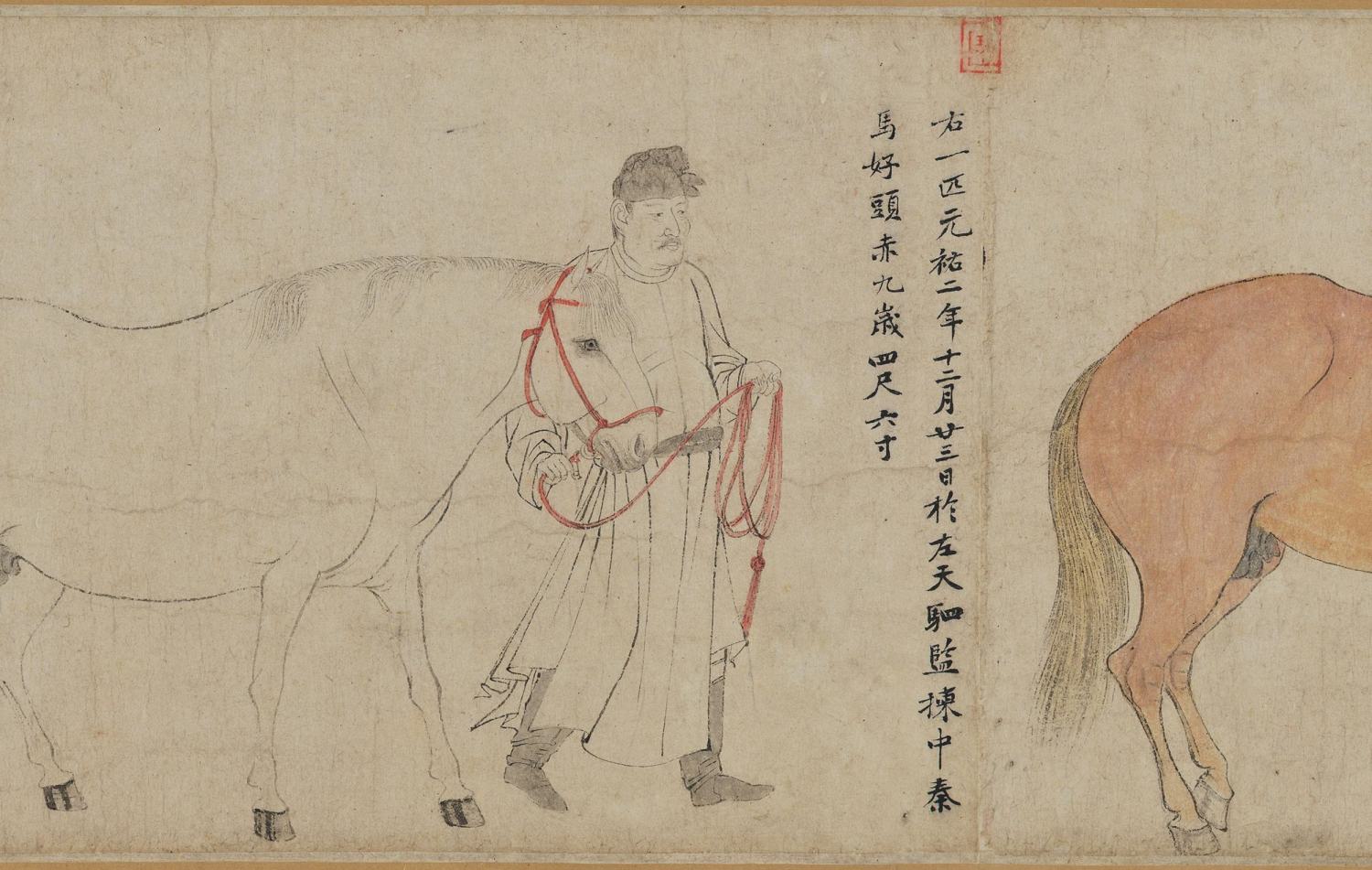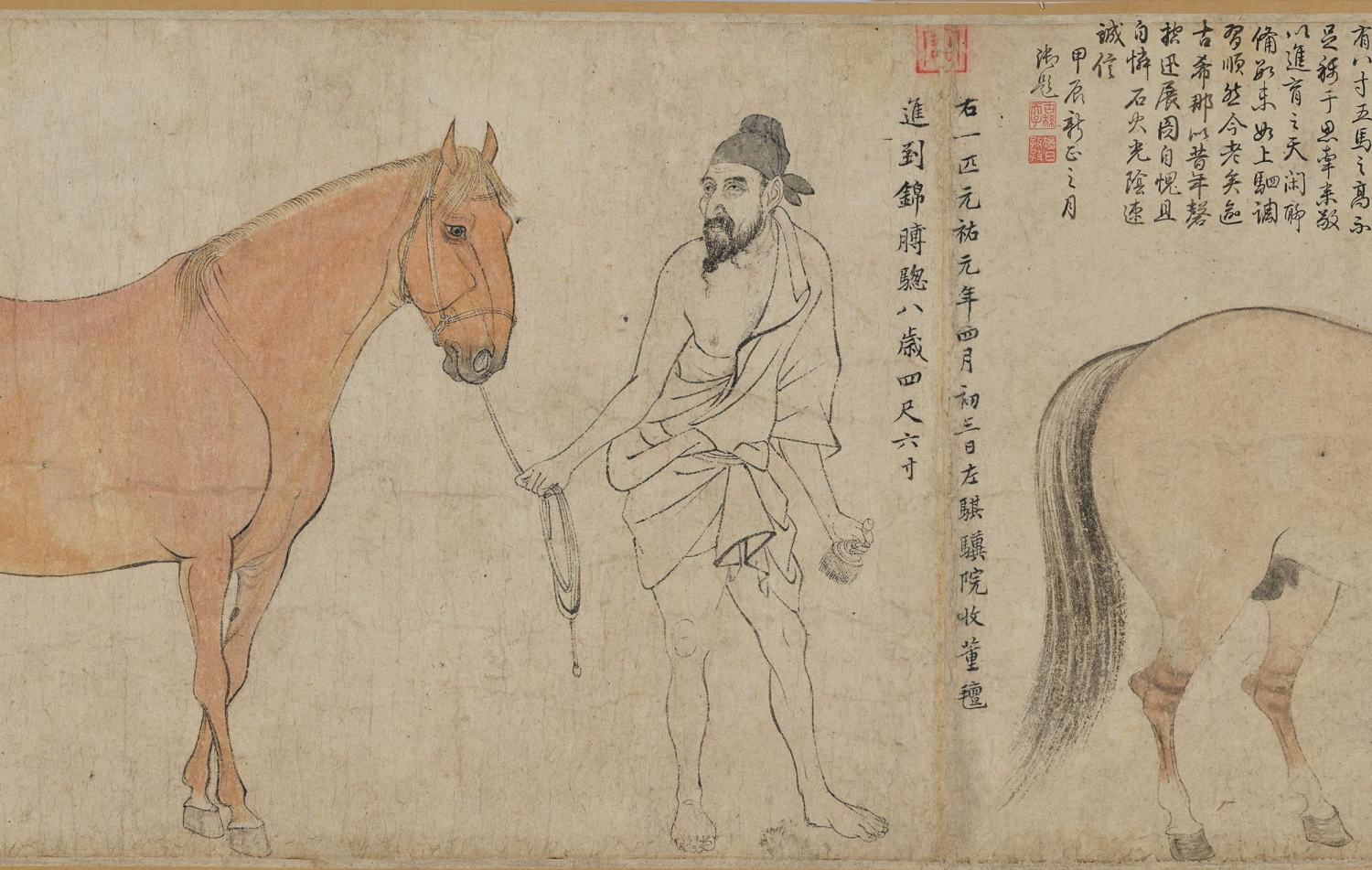 第三组:马的周身赤红。前有头戴汉服帽子的异族人,袒肩光脚,手持毛刷,似刚洗完马状。画后题款称:马名 “好头赤”,高四尺六寸。