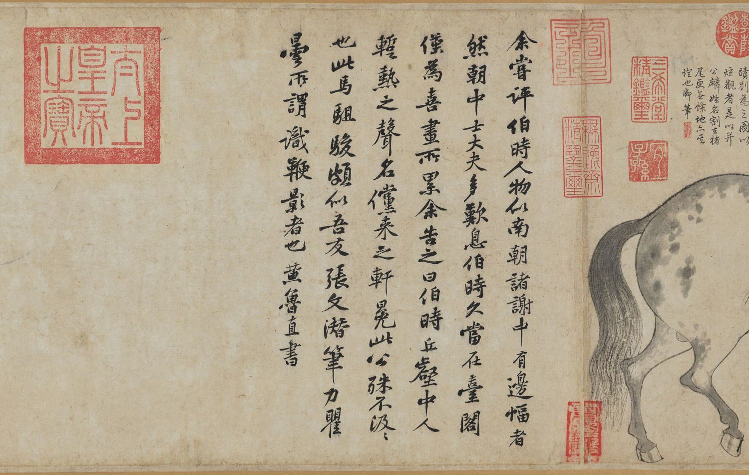 余嘗評伯時人物,似南朝諸謝中有邊幅者,然朝中士大夫多嘆息:伯時久當在台閣,僅為喜畫所累。余告之曰:伯時丘壑中人,暫熱之聲名,儻來之軒冕,此公殊不汲汲也。此馬駔駿,頗似吾友張文潛筆力,瞿曇所謂識鞭影者也。黃魯直書